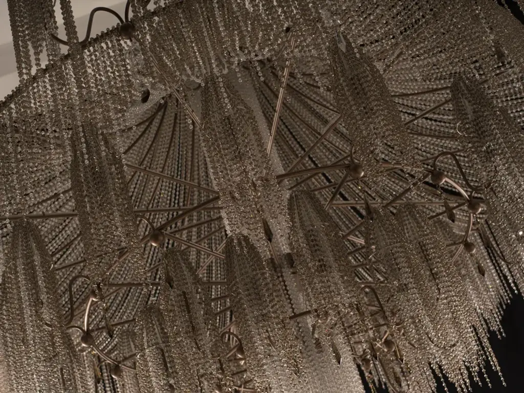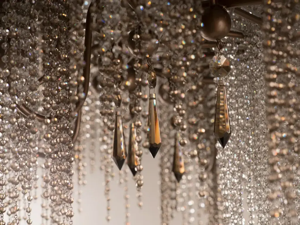 BURLESQUE EX07 is a 56 lights chandelier with bronze finish, smoky and clear crystals lampshades.56x28W E14 not incl.A drapery, some feathers, some precious gems: this is what comes to mind with BURLESQUE, a family of chandeliers with a strong personality. The protagonists here are the pearls with that multitude of precious strings that, just like a veil, lie down over the metallic structure of the lampshade, making it almost invisible. A collection capable of expressing a certian idea of feminility: mysterious, intense.