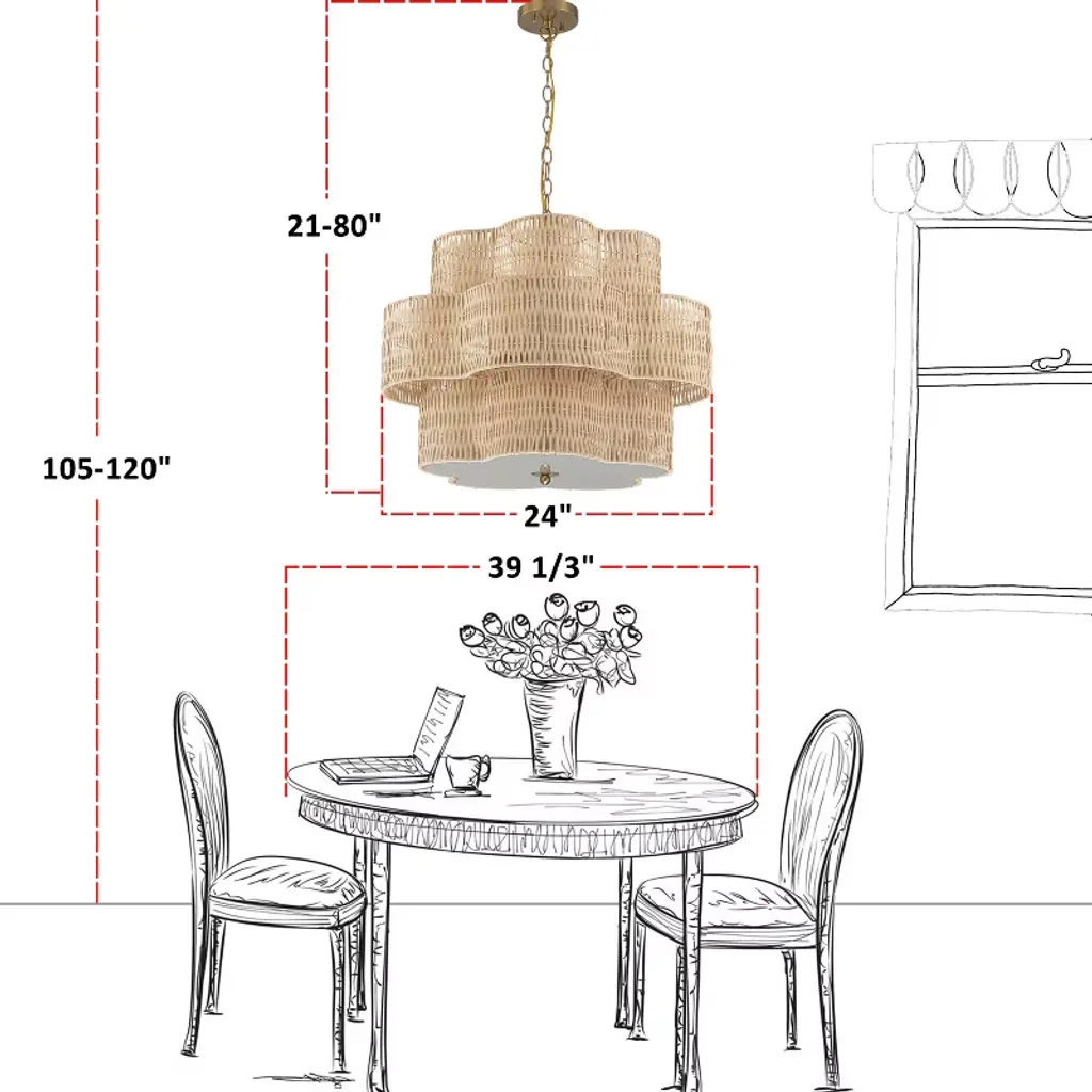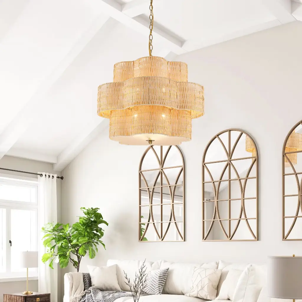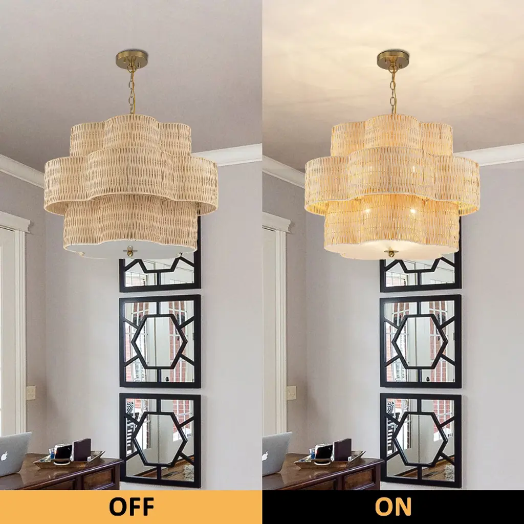 Bring warmth and nature into your home with this 6-light farmhouse chandelier. The unique 3-tiered floral shade is made of hand-woven rattan to create a soft, natural ambiance. Adjustable chain design easily adapts to spaces of different heights, perfect for installation on flat, sloped or vaulted ceilings. Whether it's a dining room, bedroom or living room, this chandelier will add a touch of style and comfort to your home.