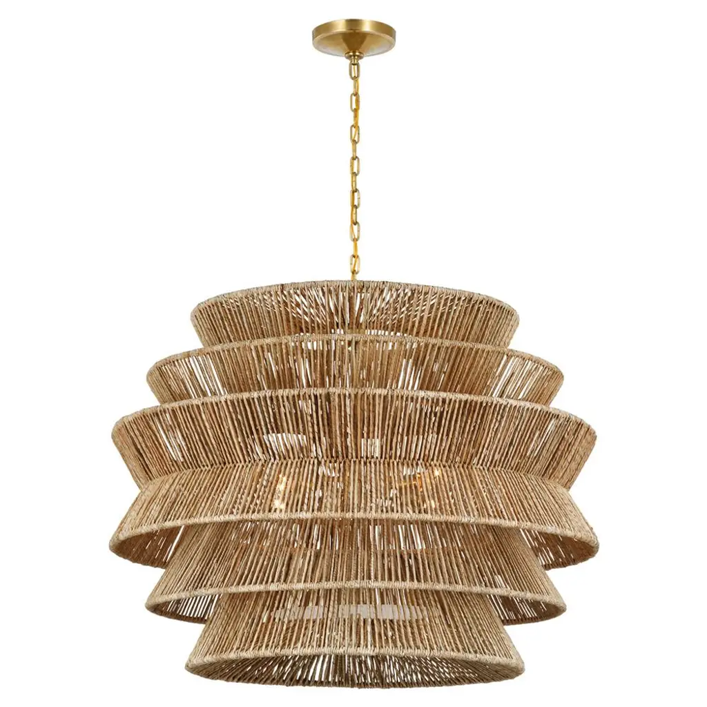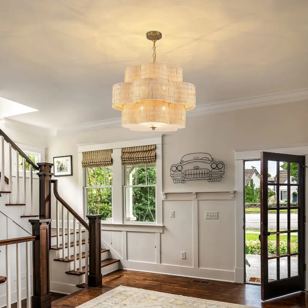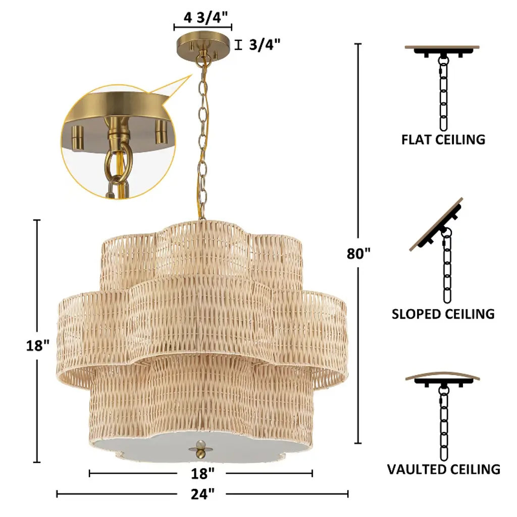 Bring warmth and nature into your home with this 6-light farmhouse chandelier. The unique 3-tiered floral shade is made of hand-woven rattan to create a soft, natural ambiance. Adjustable chain design easily adapts to spaces of different heights, perfect for installation on flat, sloped or vaulted ceilings. Whether it's a dining room, bedroom or living room, this chandelier will add a touch of style and comfort to your home.