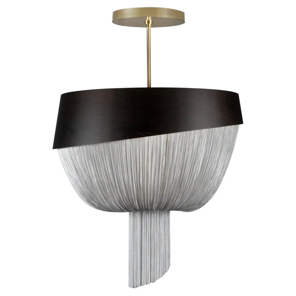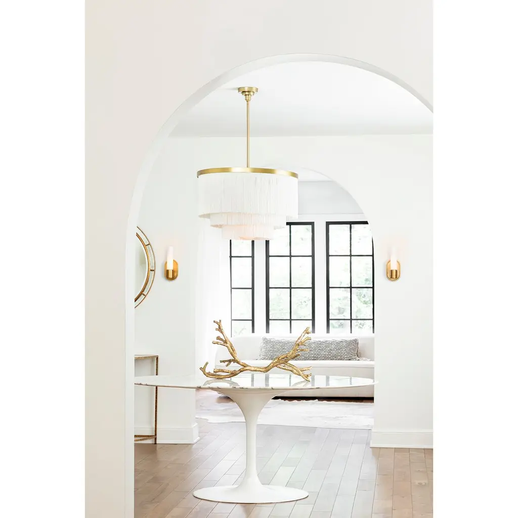 Oh là là, just add fringe! Cabaret chandelier fancies up any living room or bedroom for an accent you just can't take your eyes off of. Three layers of fringe make for great movement and add dimension to the piece. Natural brass accents along with an opal glass dome add distinctive design details making this a statement chandelier.