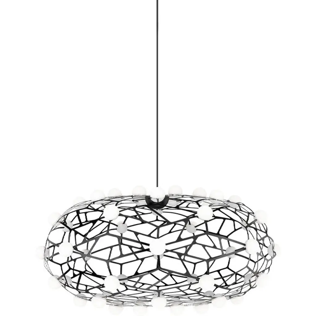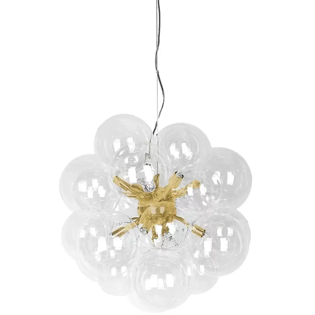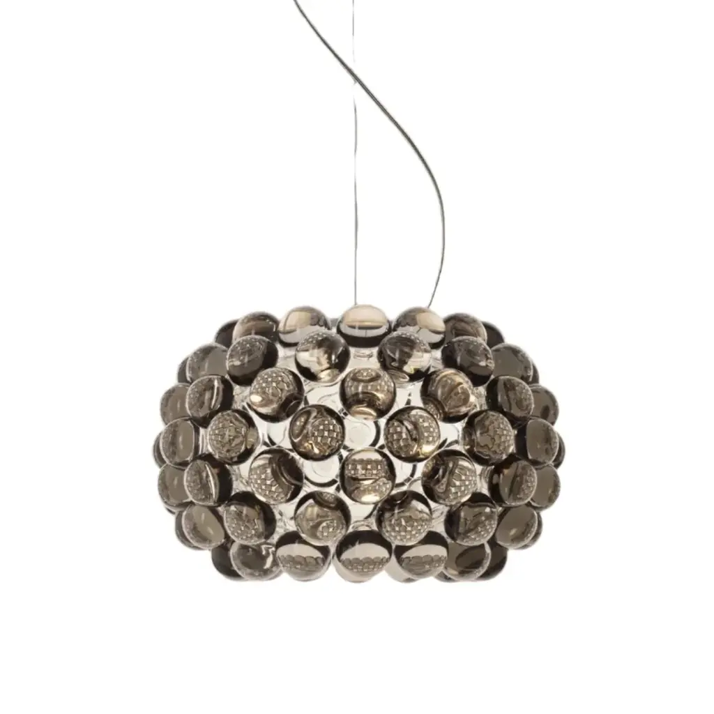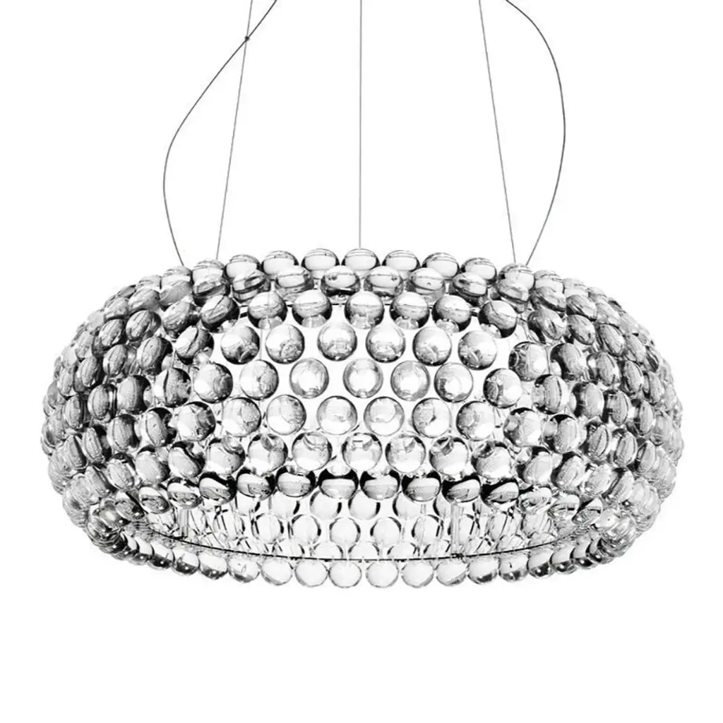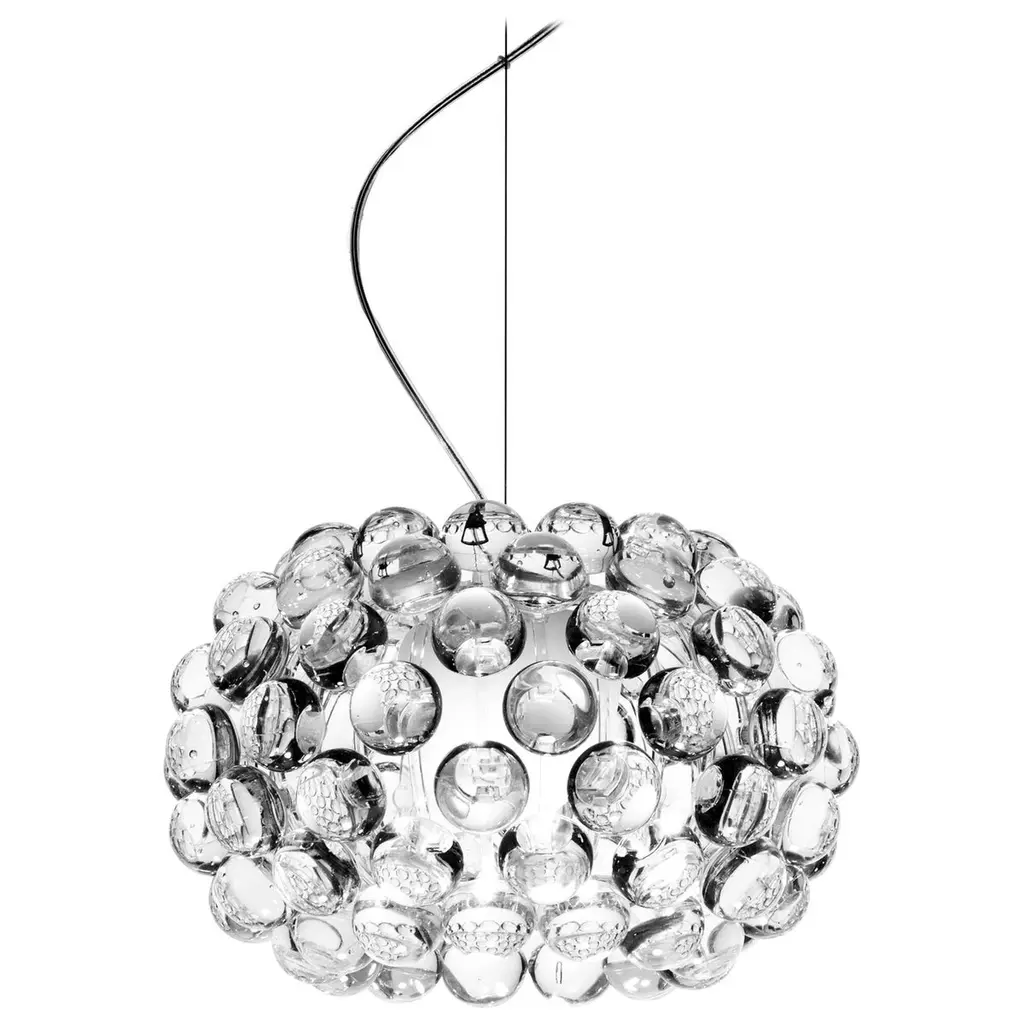 The Foscarini Caboche Chandelier is a modern chandelier of uncommon beauty. A 2005 design by Patricia Urquiola and Eliana Gerotto, Caboche is a Foscarini best seller that has become a modern lighting icon. A jewel of innovation, the Foscarini Caboche Chandelier features a stunning circular arrangement of polycarbonate spheres secured to a chromed metal mount, resulting in a dazzling rounded form resembling a glass-beaded bracelet. Owing to its material composition of lightweight, transparent plastic, Caboche is a modern chandelier that looks like glass, without the weight of glass. Dramatic and sophisticated, the Foscarini Caboche Chandelier casts both direct lighting onto the surface below, while emitting nuanced 360° light onto its environment—and casting intricate decorative shadows on the ceiling above. Features