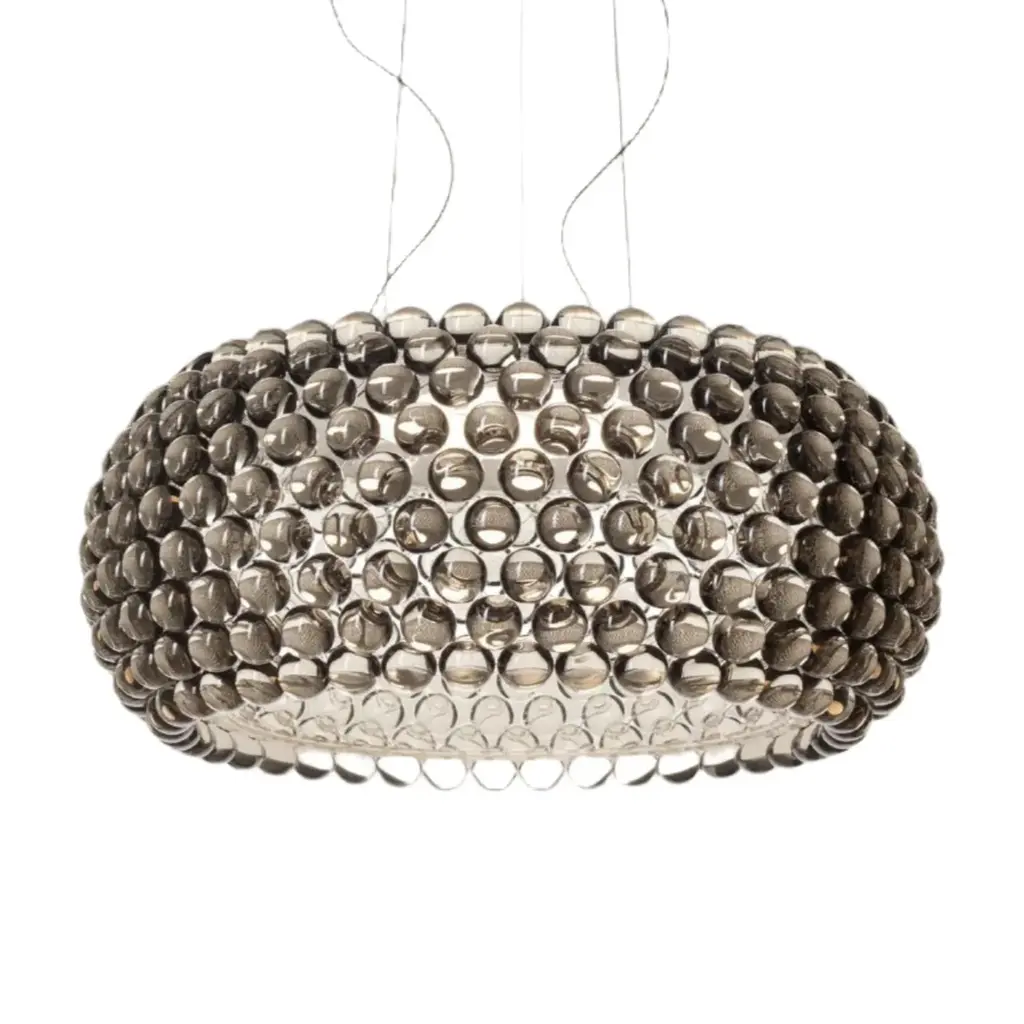 The Foscarini Caboche Chandelier is a modern chandelier of uncommon beauty. A 2005 design by Patricia Urquiola and Eliana Gerotto, Caboche is a Foscarini best seller that has become a modern lighting icon. A jewel of innovation, the Foscarini Caboche Chandelier features a stunning circular arrangement of polycarbonate spheres secured to a chromed metal mount, resulting in a dazzling rounded form resembling a glass-beaded bracelet. Owing to its material composition of lightweight, transparent plastic, Caboche is a modern chandelier that looks like glass, without the weight of glass. Dramatic and sophisticated, the Foscarini Caboche Chandelier casts both direct lighting onto the surface below, while emitting nuanced 360° light onto its environment—and casting intricate decorative shadows on the ceiling above. Features