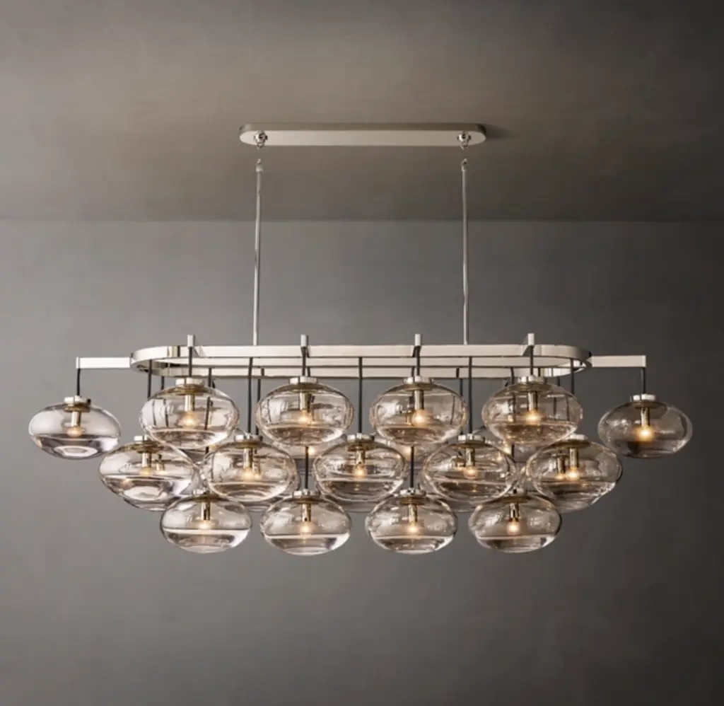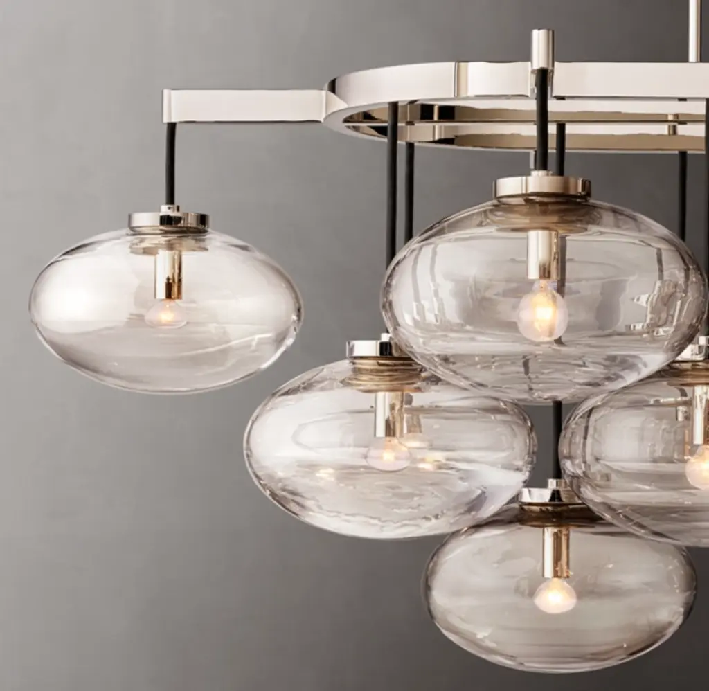 Handblown oval glass shades seem to float overhead in the Cabrette collection by San Francisco, California-based designer Jonathan Browning. Held by an industrial metal frame, the globes are suspended from black cords, marrying clean geometry with understated elegance.ALSO AVAILABLE IN AMBER GLASSSHOP THE ENTIRE COLLECTION