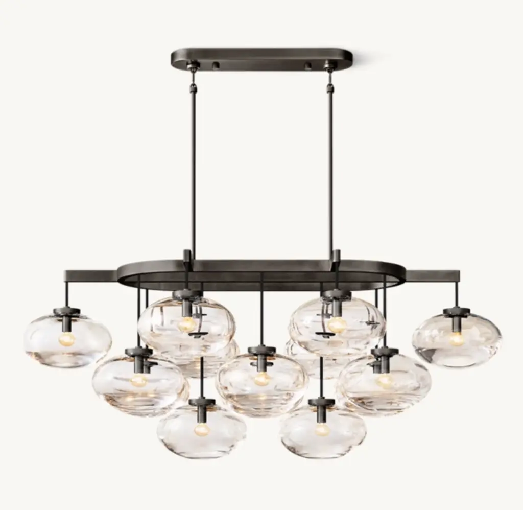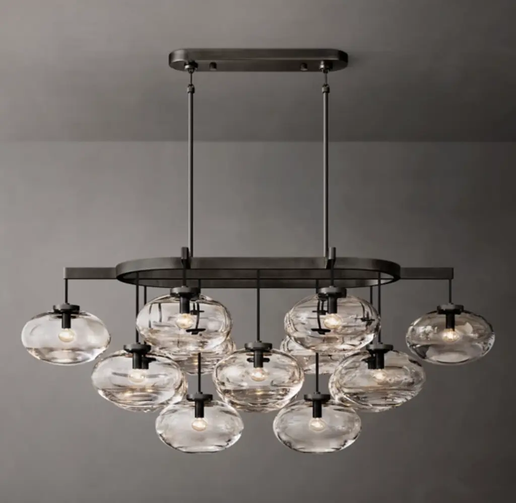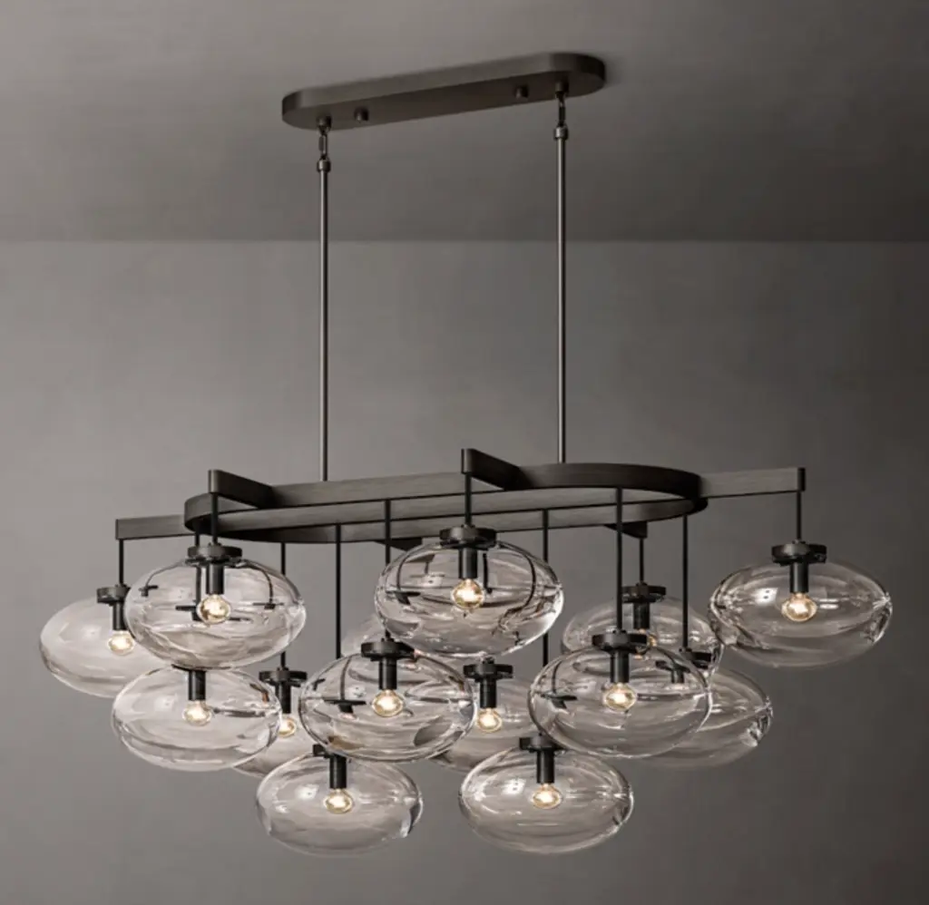 Handblown oval glass shades seem to float overhead in the Cabrette collection by San Francisco, California-based designer Jonathan Browning. Held by an industrial metal frame, the globes are suspended from black cords, marrying clean geometry with understated elegance.ALSO AVAILABLE IN AMBER GLASS class="sku-info link-wrapper">SHOP THE ENTIRE COLLECTION