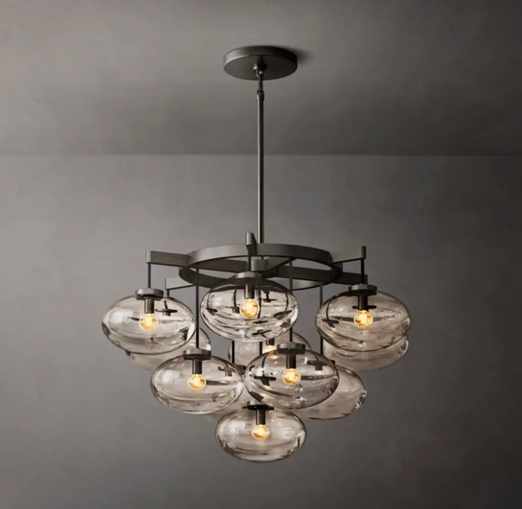 Handblown oval glass shades seem to float overhead in the Cabrette collection by San Francisco, California-based designer Jonathan Browning. Held by an industrial metal frame, the globes are suspended from black cords, marrying clean geometry with understated elegance.ALSO AVAILABLE IN AMBER GLASSSHOP THE ENTIRE COLLECTION
