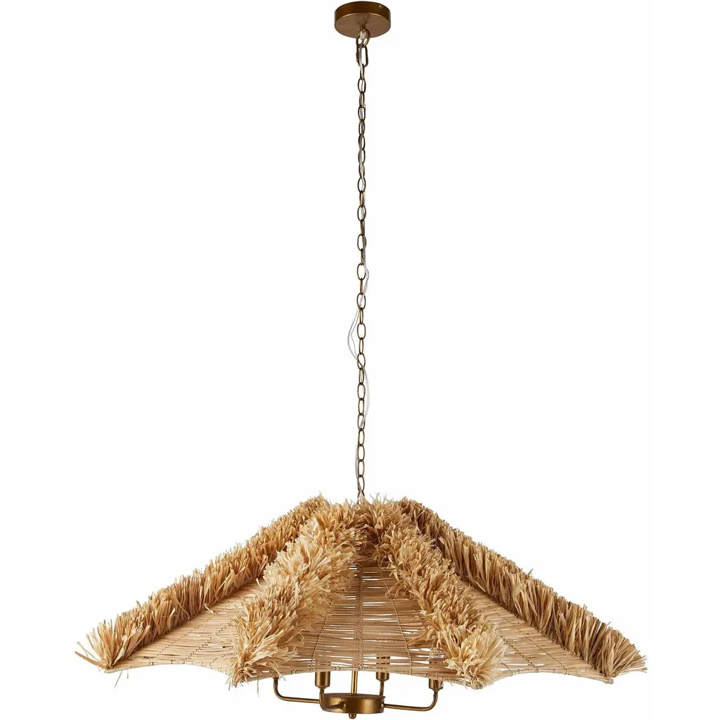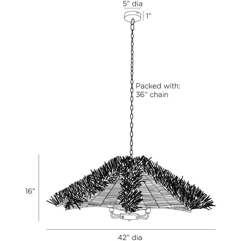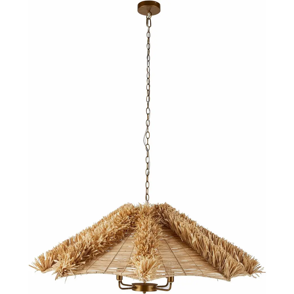 The woven palapa-style umbrellas of the Yucatan peninsula inform our thatched fixture of natural raffia and rattan. This umbrella-style chandelier is fringed with a flourish, then suspended from an antique brass-plated chain and canopy. The resulting patterns of light will add a textural, playful pattern on the ceiling and walls. Finish will vary.