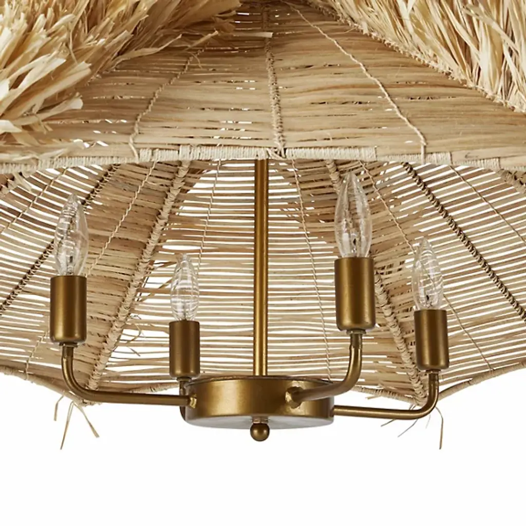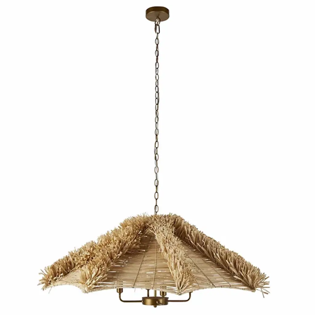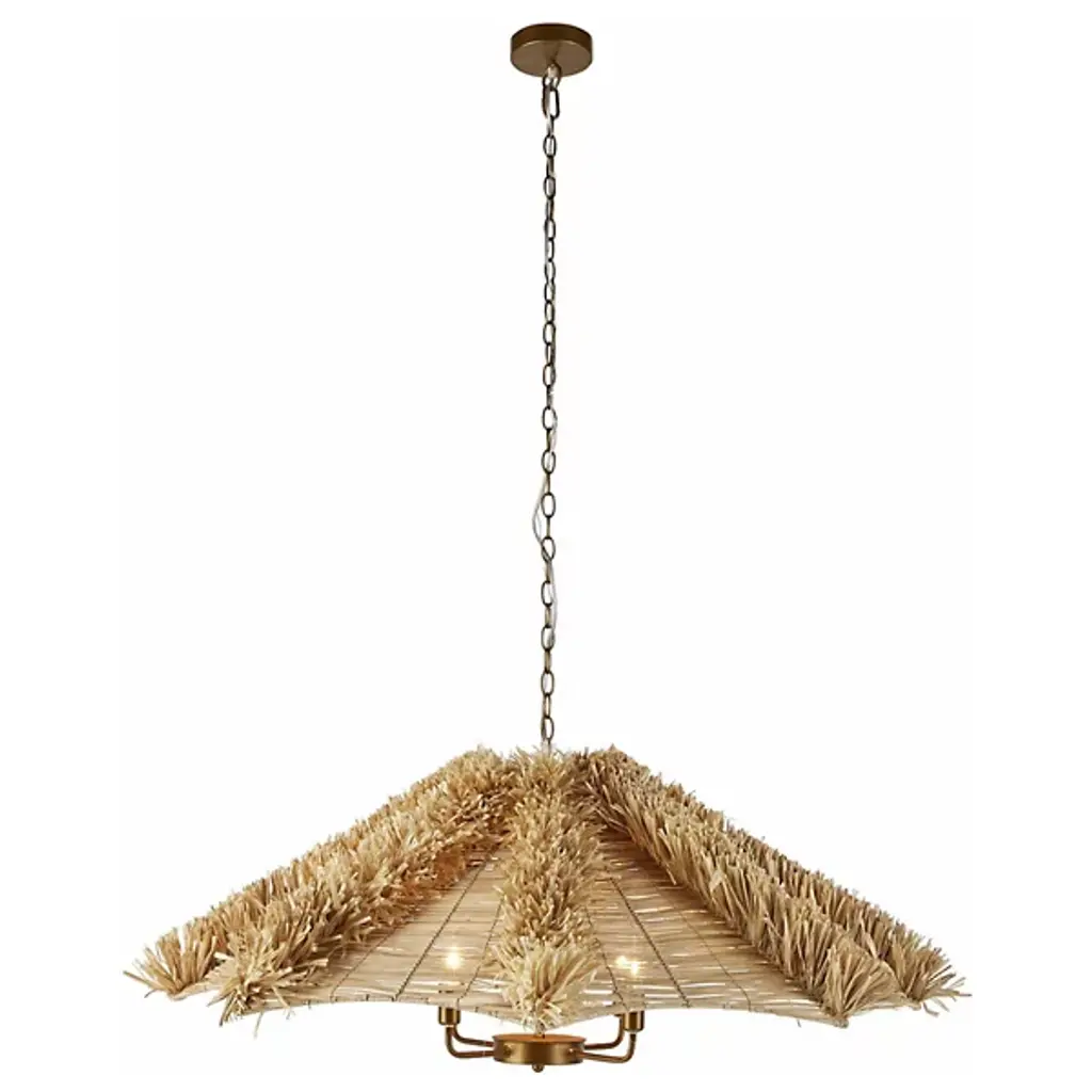 The Cadance Chandelier from Arteriors portrays an intricate transitional design enhanced with playful bohemian notes. Inspired by the woven palapa-style umbrellas found on the Yucatan peninsula, this thatched fixture features a fiber weave of natural raffia and rattan. The umbrella-shaped shade is fringed along angular lines and suspended from a candelabra fixture below an antique brass-plated chain and canopy. Its intricate design casts