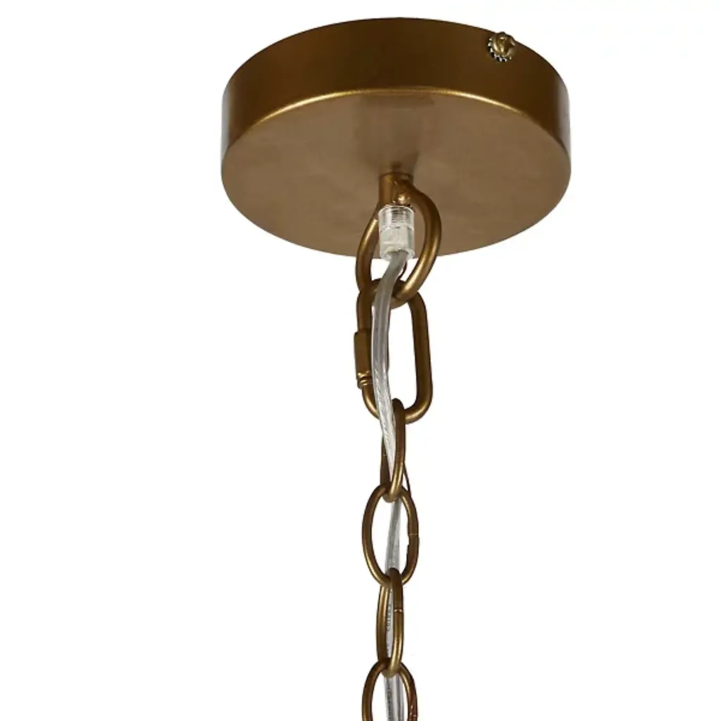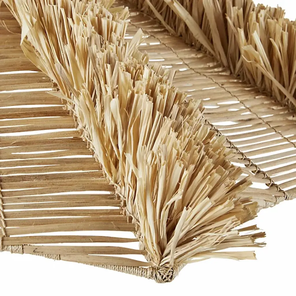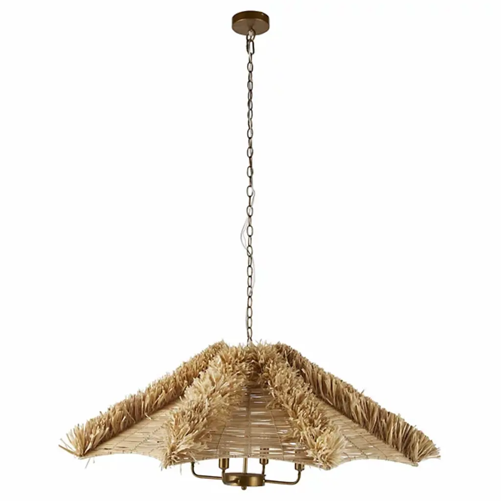 The Cadance Chandelier from Arteriors portrays an intricate transitional design enhanced with playful bohemian notes. Inspired by the woven palapa-style umbrellas found on the Yucatan peninsula, this thatched fixture features a fiber weave of natural raffia and rattan. The umbrella-shaped shade is fringed along angular lines and suspended from a candelabra fixture below an antique brass-plated chain and canopy. Its intricate design casts