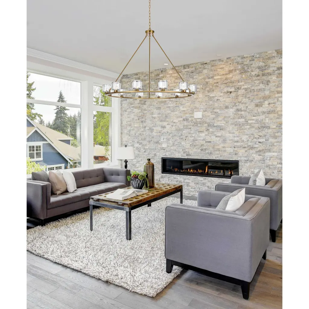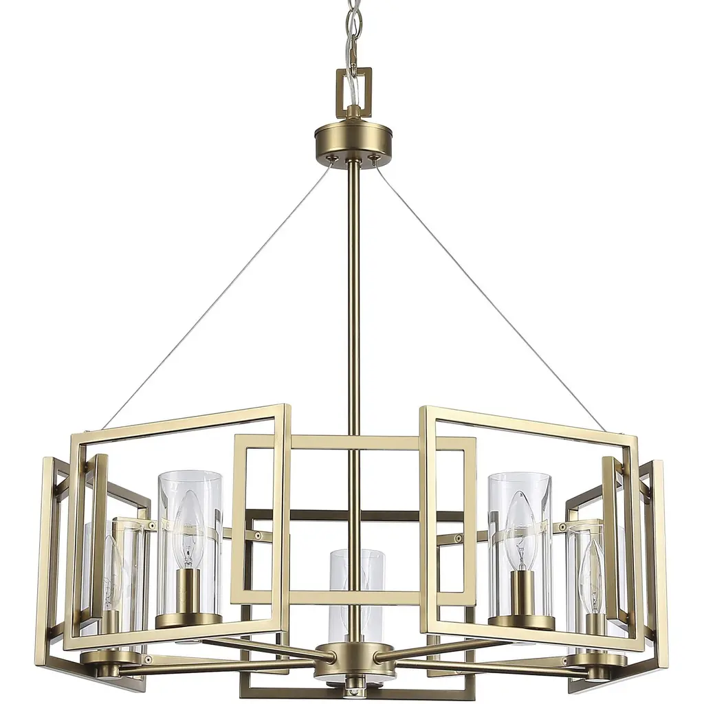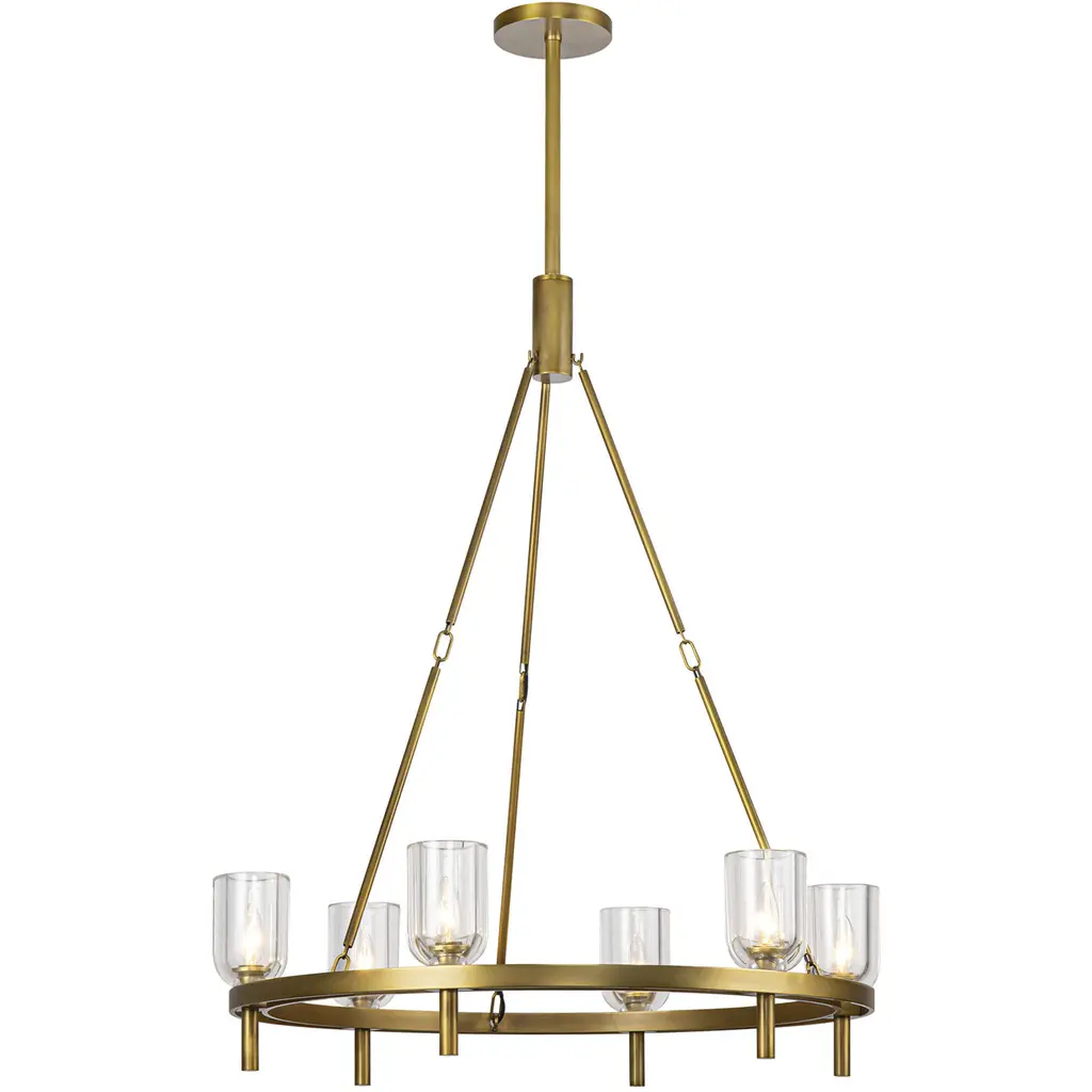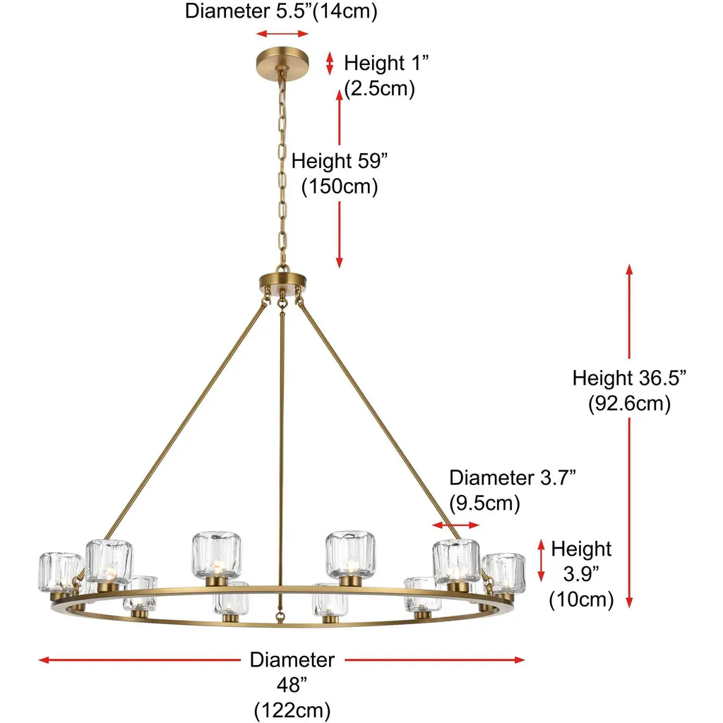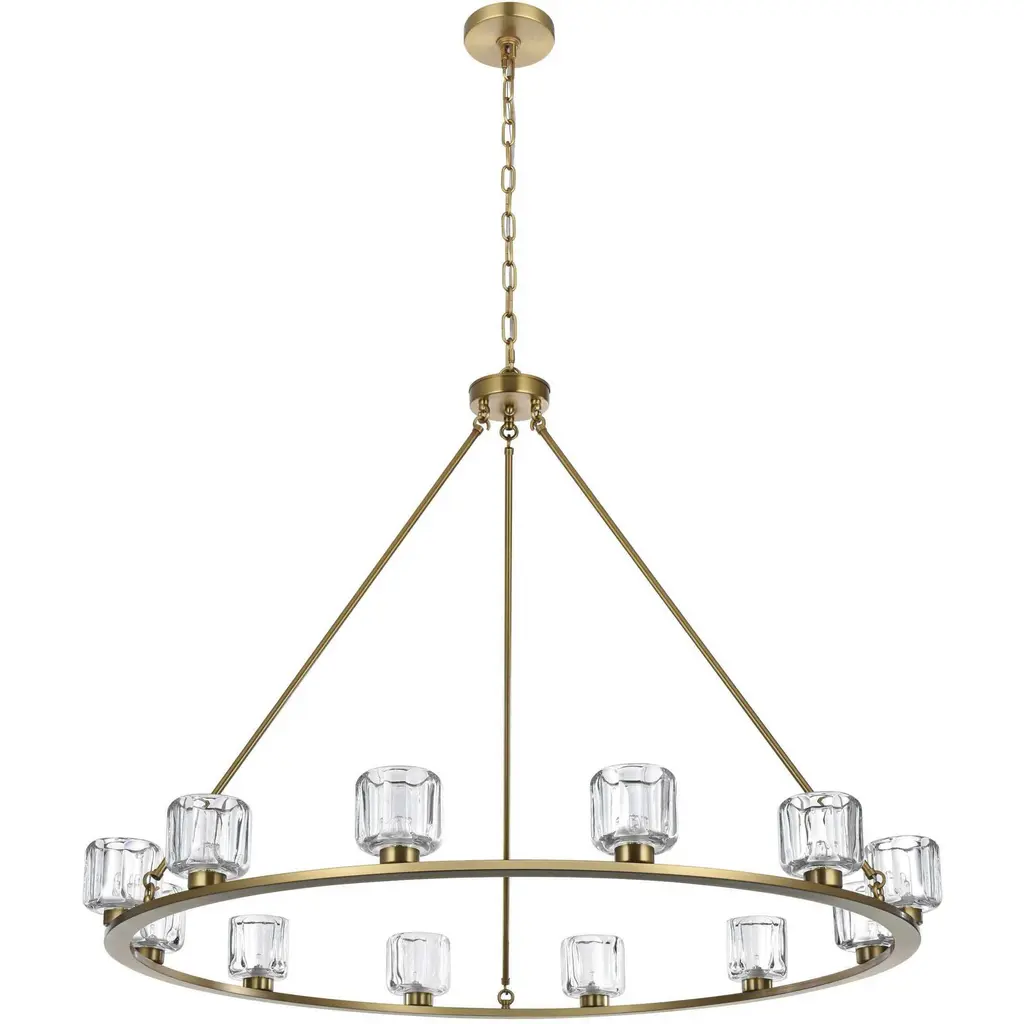 Add modern charm to your space with this striking chandelier, where a sleek circular iron frame meets sculpted clear glass shades. The unique design features decorative hanging rods with hooks, enhancing the structure with industrial flair. The clear glass refracts light beautifully, creating a radiant glow that uplights your space with warmth and dimension. Perfect for dining rooms, living rooms, or offices, this chandelier is available in black for a bold contrast, satin gold for a luxurious touch, and chrome for a sleek, modern vibe. With multiple size options and a matching canopy and chain for seamless installation, this dimmable chandelier offers both beauty and versatility. Light bulbs are not included, allowing you to choose the perfect style to match your vision.