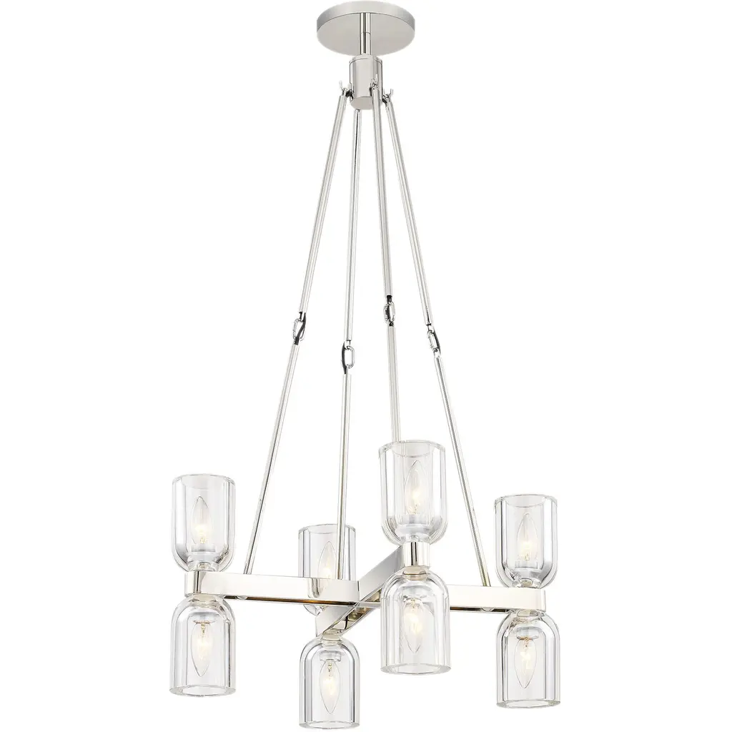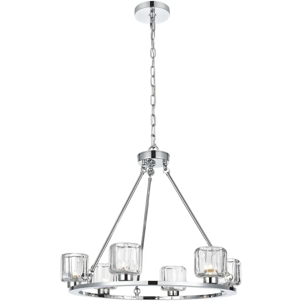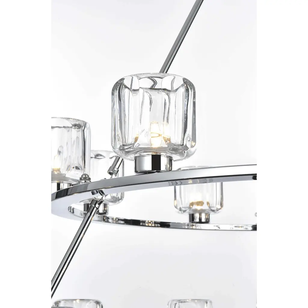 Add modern charm to your space with this striking chandelier, where a sleek circular iron frame meets sculpted clear glass shades. The unique design features decorative hanging rods with hooks, enhancing the structure with industrial flair. The clear glass refracts light beautifully, creating a radiant glow that uplights your space with warmth and dimension. Perfect for dining rooms, living rooms, or offices, this chandelier is available in black for a bold contrast, satin gold for a luxurious touch, and chrome for a sleek, modern vibe. With multiple size options and a matching canopy and chain for seamless installation, this dimmable chandelier offers both beauty and versatility. Light bulbs are not included, allowing you to choose the perfect style to match your vision.