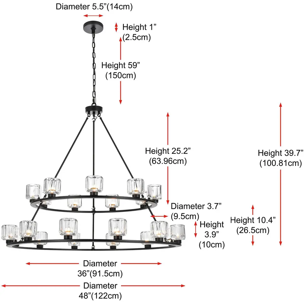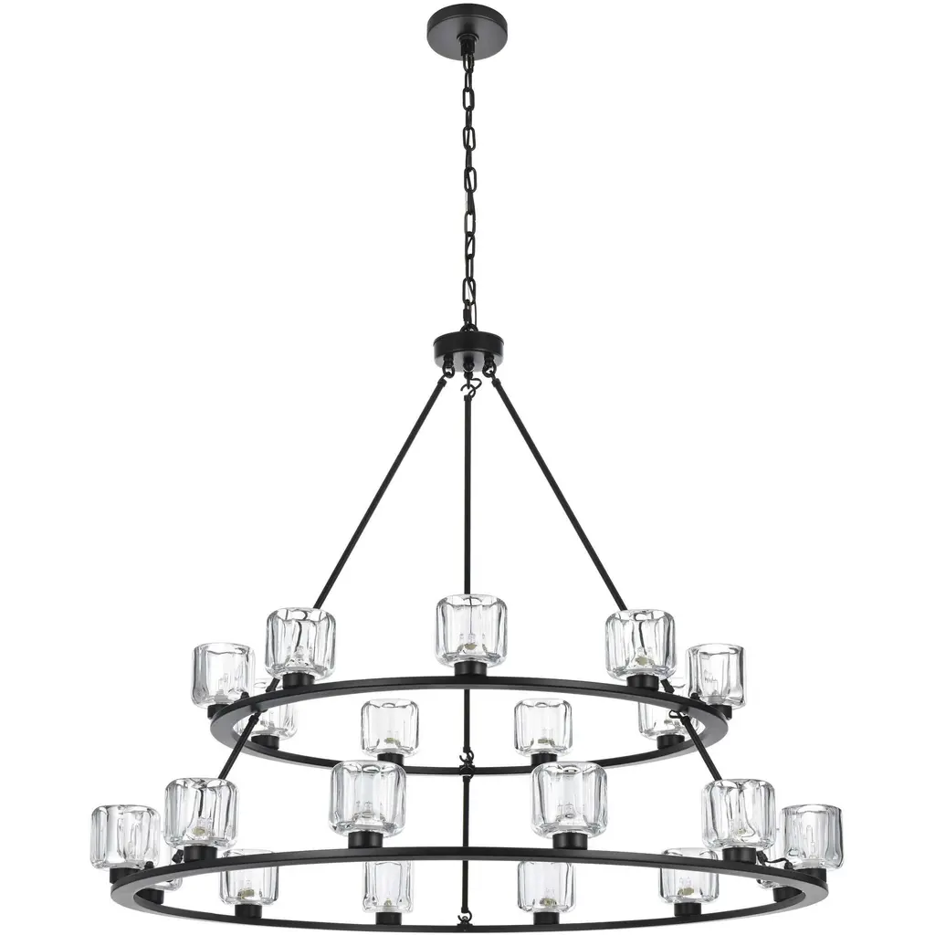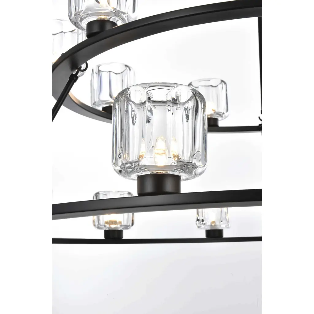 Add modern charm to your space with this striking chandelier, where a sleek circular iron frame meets sculpted clear glass shades. The unique design features decorative hanging rods with hooks, enhancing the structure with industrial flair. The clear glass refracts light beautifully, creating a radiant glow that uplights your space with warmth and dimension. Perfect for dining rooms, living rooms, or offices, this chandelier is available in black for a bold contrast, satin gold for a luxurious touch, and chrome for a sleek, modern vibe. With multiple size options and a matching canopy and chain for seamless installation, this dimmable chandelier offers both beauty and versatility. Light bulbs are not included, allowing you to choose the perfect style to match your vision.