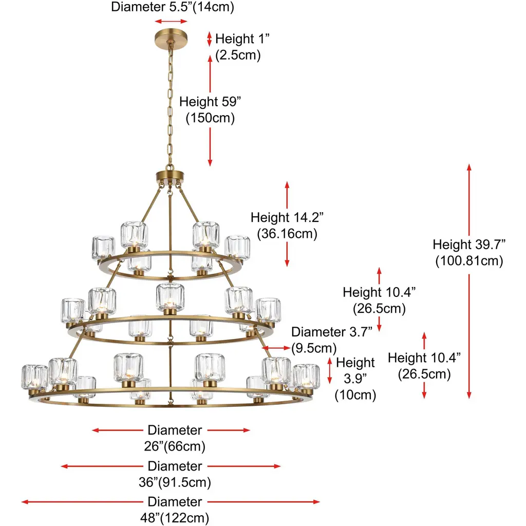 Add modern charm to your space with this striking chandelier, where a sleek circular iron frame meets sculpted clear glass shades. The unique design features decorative hanging rods with hooks, enhancing the structure with industrial flair. The clear glass refracts light beautifully, creating a radiant glow that uplights your space with warmth and dimension. Perfect for dining rooms, living rooms, or offices, this chandelier is available in black for a bold contrast, satin gold for a luxurious touch, and chrome for a sleek, modern vibe. With multiple size options and a matching canopy and chain for seamless installation, this dimmable chandelier offers both beauty and versatility. Light bulbs are not included, allowing you to choose the perfect style to match your vision.