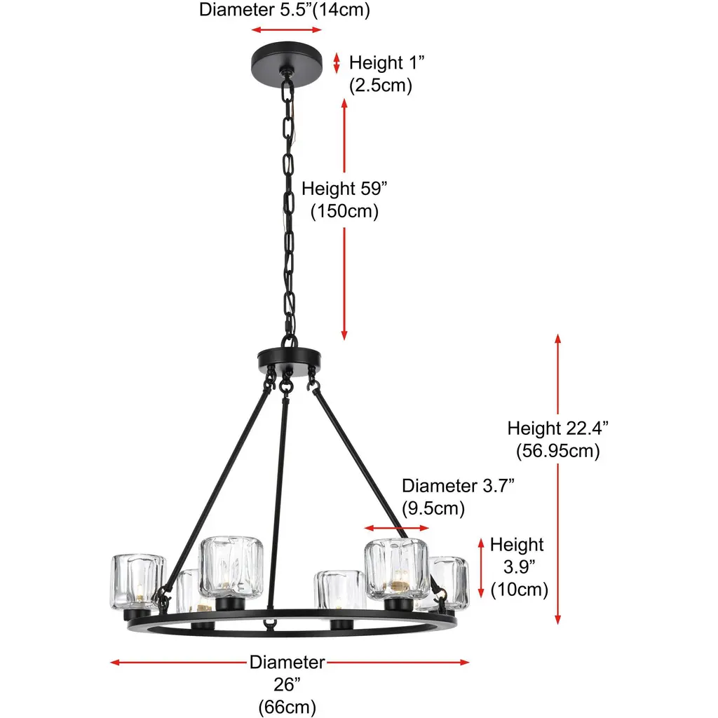 Add modern charm to your space with this striking chandelier, where a sleek circular iron frame meets sculpted clear glass shades. The unique design features decorative hanging rods with hooks, enhancing the structure with industrial flair. The clear glass refracts light beautifully, creating a radiant glow that uplights your space with warmth and dimension. Perfect for dining rooms, living rooms, or offices, this chandelier is available in black for a bold contrast, satin gold for a luxurious touch, and chrome for a sleek, modern vibe. With multiple size options and a matching canopy and chain for seamless installation, this dimmable chandelier offers both beauty and versatility. Light bulbs are not included, allowing you to choose the perfect style to match your vision.