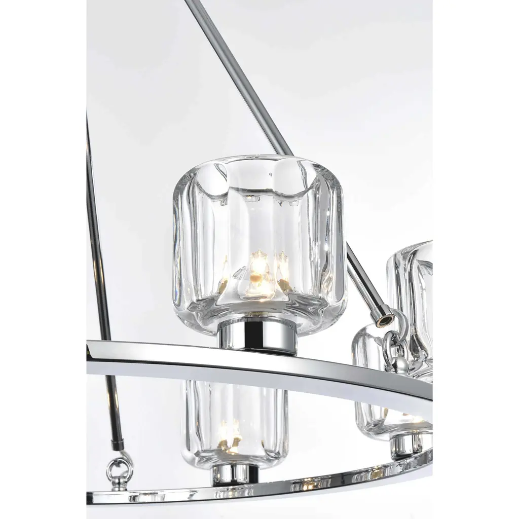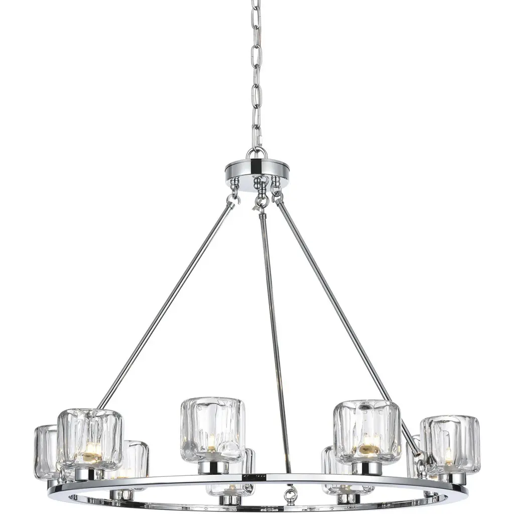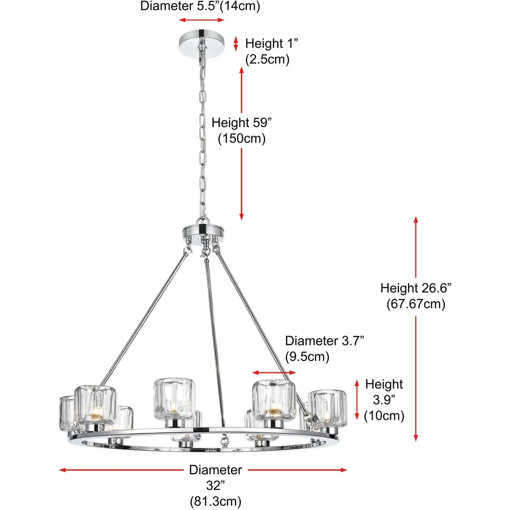 Add modern charm to your space with this striking chandelier, where a sleek circular iron frame meets sculpted clear glass shades. The unique design features decorative hanging rods with hooks, enhancing the structure with industrial flair. The clear glass refracts light beautifully, creating a radiant glow that uplights your space with warmth and dimension. Perfect for dining rooms, living rooms, or offices, this chandelier is available in black for a bold contrast, satin gold for a luxurious touch, and chrome for a sleek, modern vibe. With multiple size options and a matching canopy and chain for seamless installation, this dimmable chandelier offers both beauty and versatility. Light bulbs are not included, allowing you to choose the perfect style to match your vision.