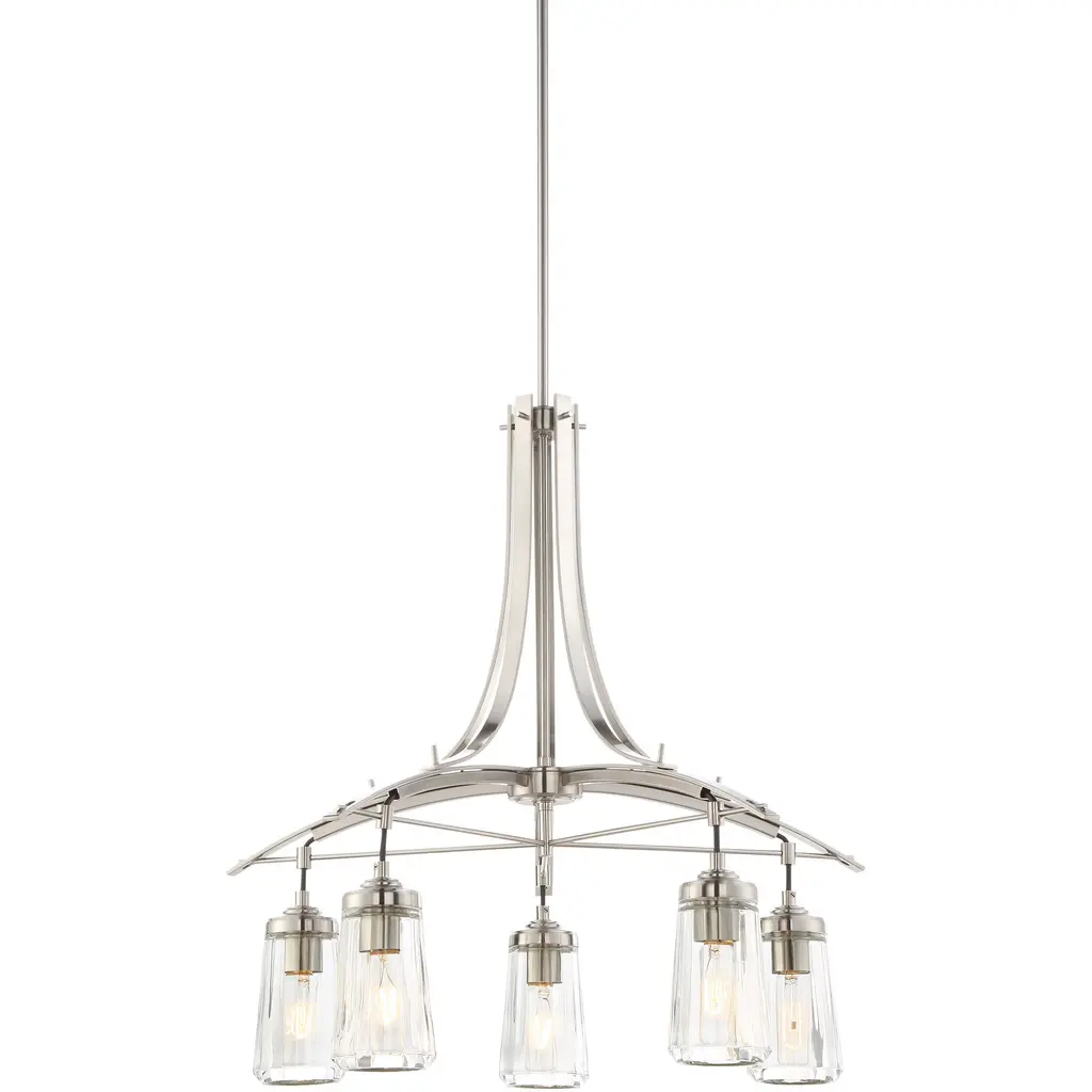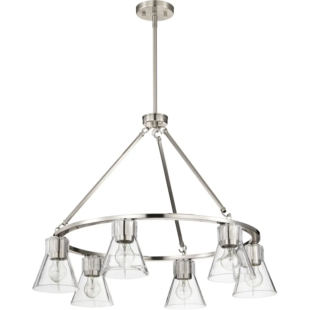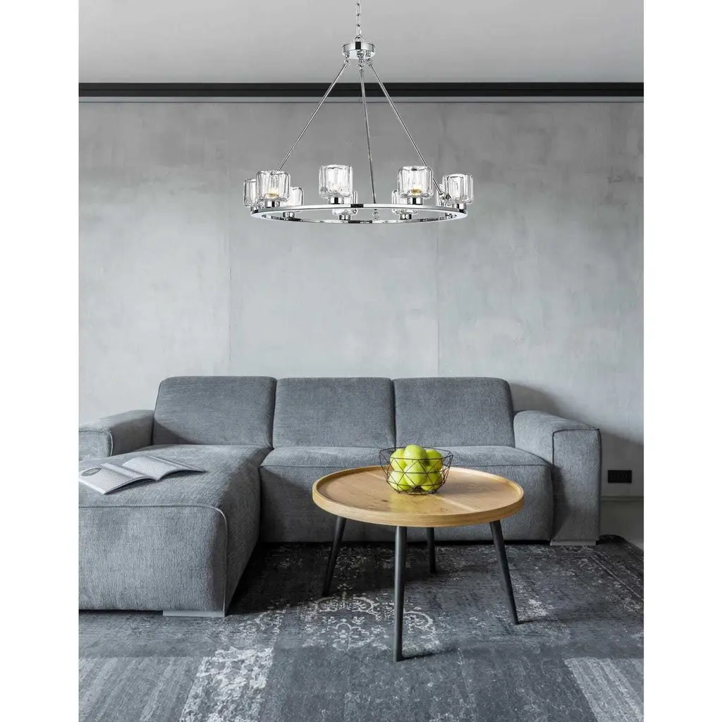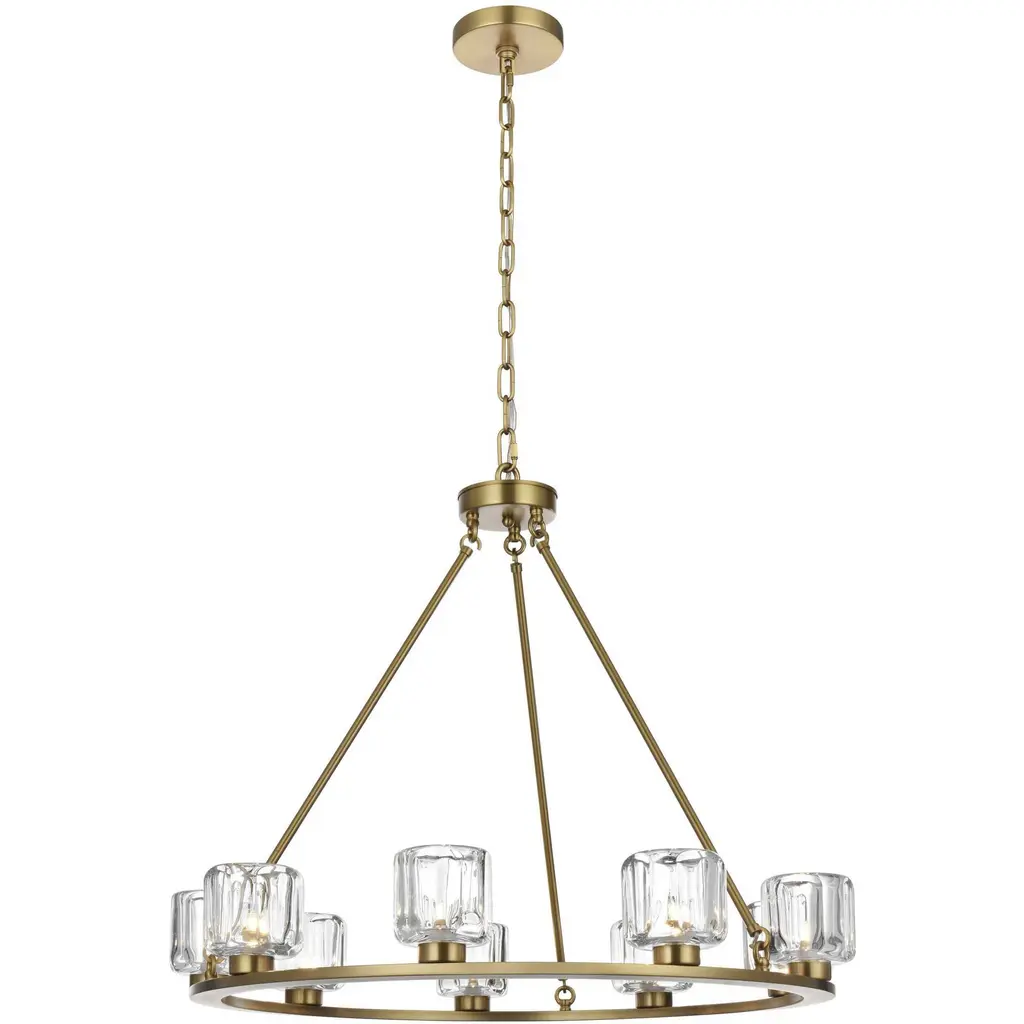 Add modern charm to your space with this striking chandelier, where a sleek circular iron frame meets sculpted clear glass shades. The unique design features decorative hanging rods with hooks, enhancing the structure with industrial flair. The clear glass refracts light beautifully, creating a radiant glow that uplights your space with warmth and dimension. Perfect for dining rooms, living rooms, or offices, this chandelier is available in black for a bold contrast, satin gold for a luxurious touch, and chrome for a sleek, modern vibe. With multiple size options and a matching canopy and chain for seamless installation, this dimmable chandelier offers both beauty and versatility. Light bulbs are not included, allowing you to choose the perfect style to match your vision.