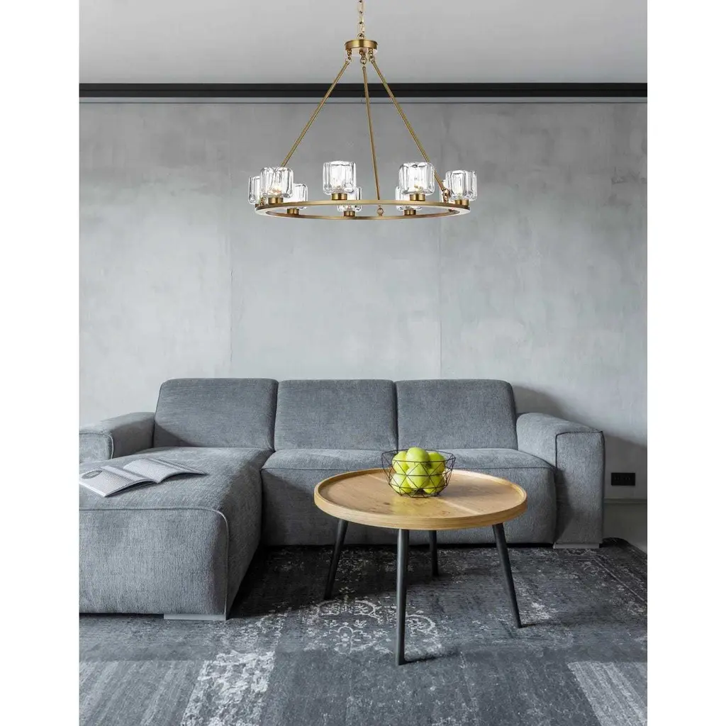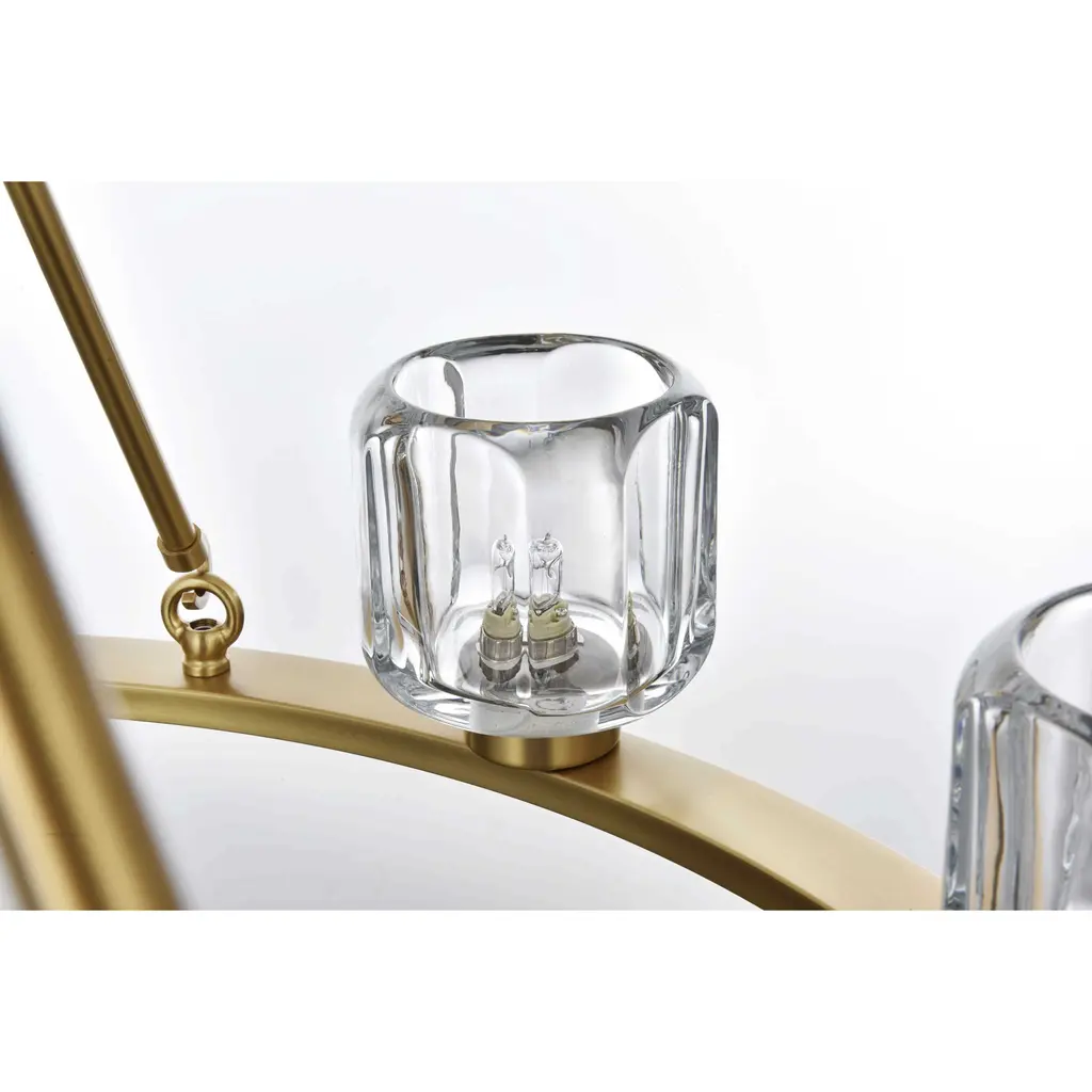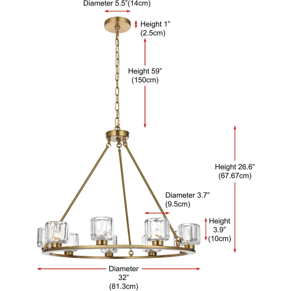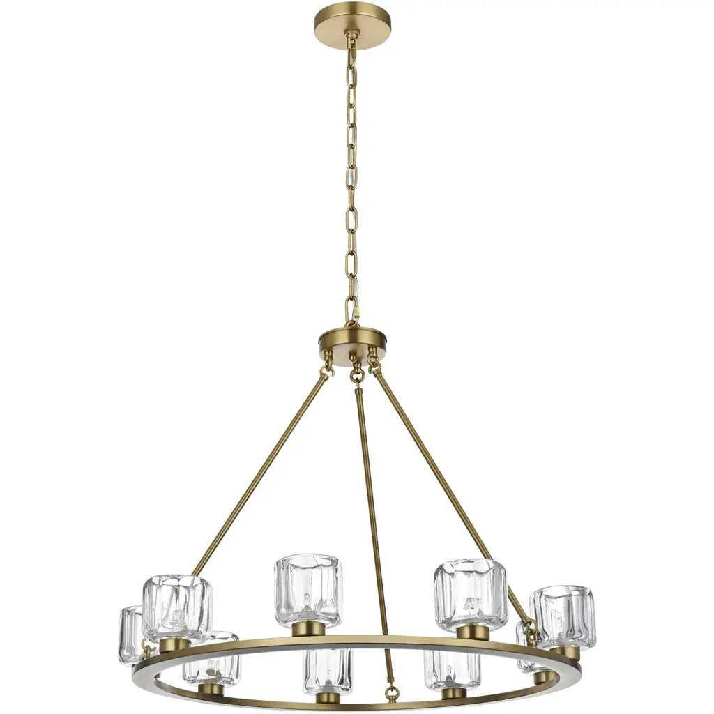 Add modern charm to your space with this striking chandelier, where a sleek circular iron frame meets sculpted clear glass shades. The unique design features decorative hanging rods with hooks, enhancing the structure with industrial flair. The clear glass refracts light beautifully, creating a radiant glow that uplights your space with warmth and dimension. Perfect for dining rooms, living rooms, or offices, this chandelier is available in black for a bold contrast, satin gold for a luxurious touch, and chrome for a sleek, modern vibe. With multiple size options and a matching canopy and chain for seamless installation, this dimmable chandelier offers both beauty and versatility. Light bulbs are not included, allowing you to choose the perfect style to match your vision.