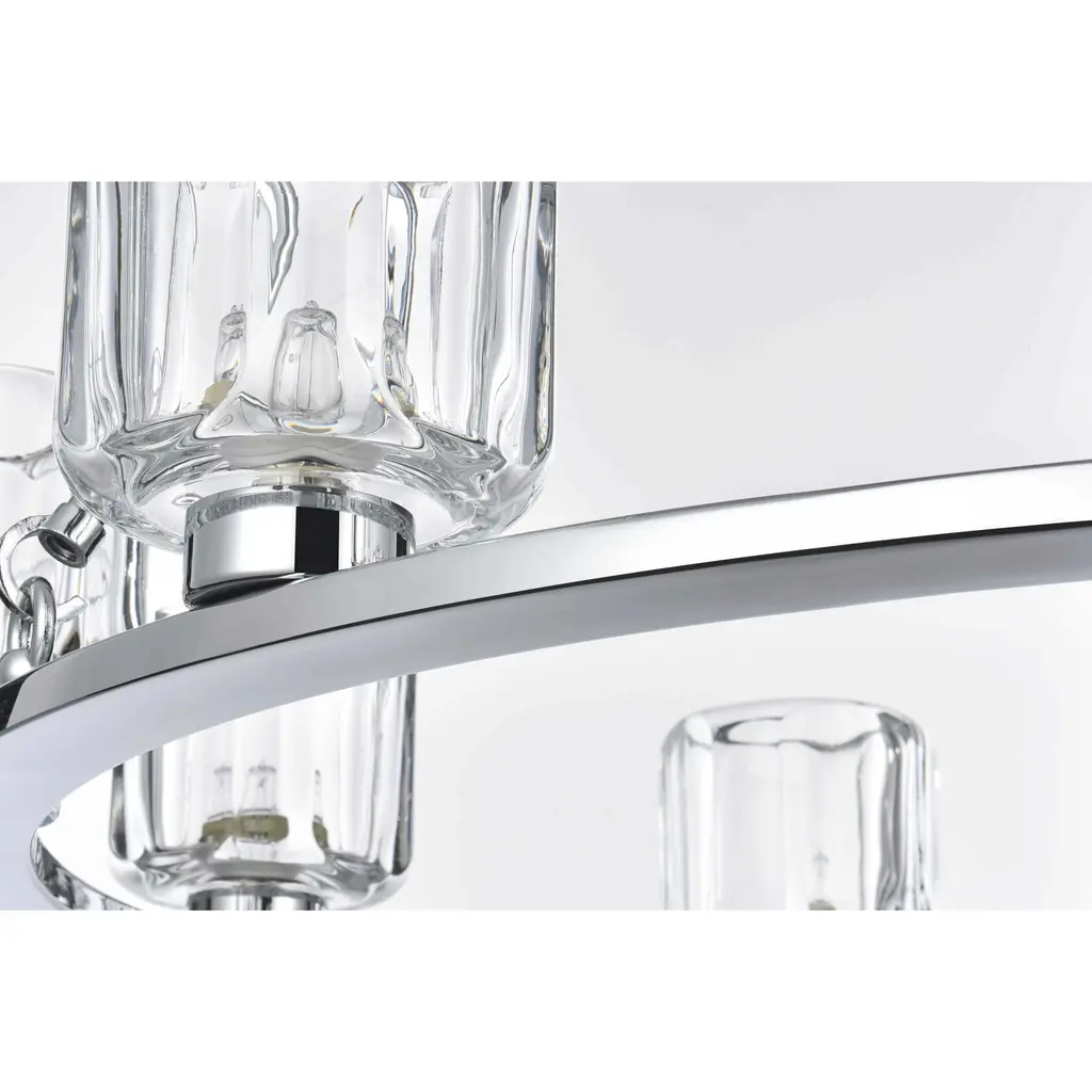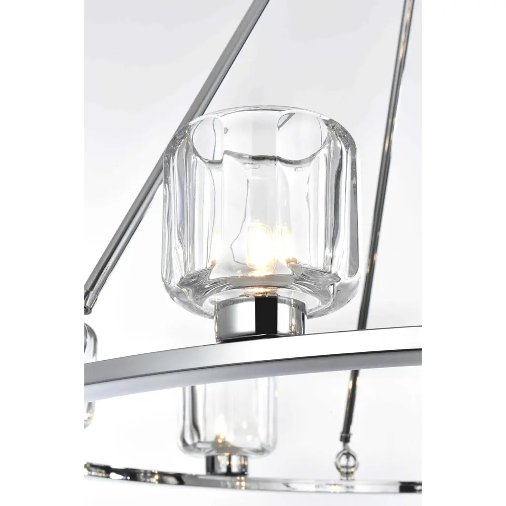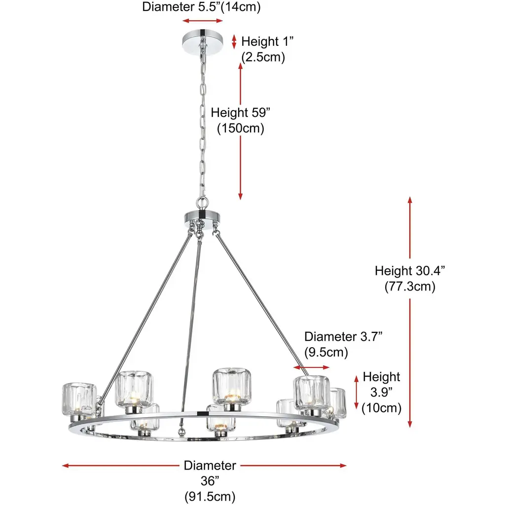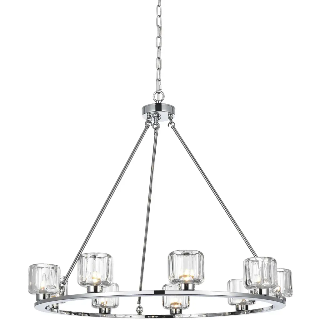 Add modern charm to your space with this striking chandelier, where a sleek circular iron frame meets sculpted clear glass shades. The unique design features decorative hanging rods with hooks, enhancing the structure with industrial flair. The clear glass refracts light beautifully, creating a radiant glow that uplights your space with warmth and dimension. Perfect for dining rooms, living rooms, or offices, this chandelier is available in black for a bold contrast, satin gold for a luxurious touch, and chrome for a sleek, modern vibe. With multiple size options and a matching canopy and chain for seamless installation, this dimmable chandelier offers both beauty and versatility. Light bulbs are not included, allowing you to choose the perfect style to match your vision.