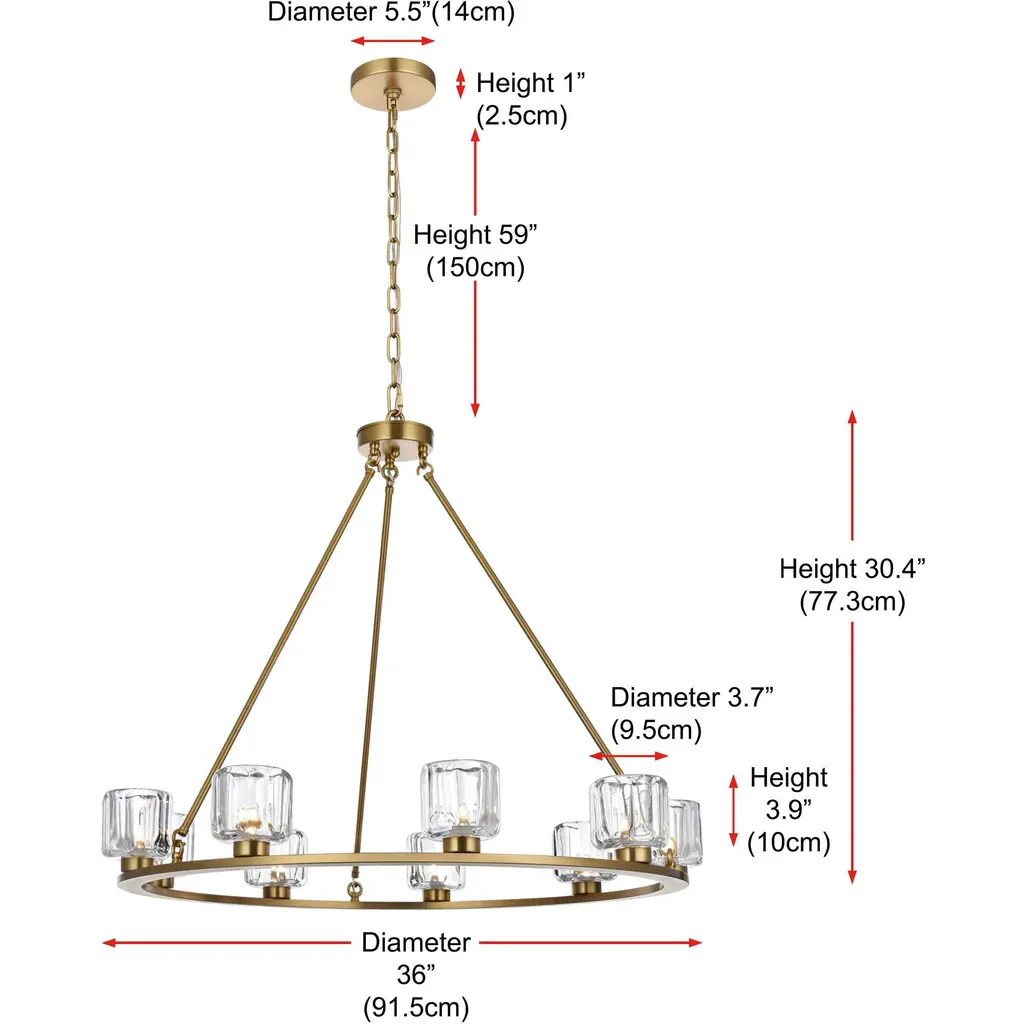 Add modern charm to your space with this striking chandelier, where a sleek circular iron frame meets sculpted clear glass shades. The unique design features decorative hanging rods with hooks, enhancing the structure with industrial flair. The clear glass refracts light beautifully, creating a radiant glow that uplights your space with warmth and dimension. Perfect for dining rooms, living rooms, or offices, this chandelier is available in black for a bold contrast, satin gold for a luxurious touch, and chrome for a sleek, modern vibe. With multiple size options and a matching canopy and chain for seamless installation, this dimmable chandelier offers both beauty and versatility. Light bulbs are not included, allowing you to choose the perfect style to match your vision.