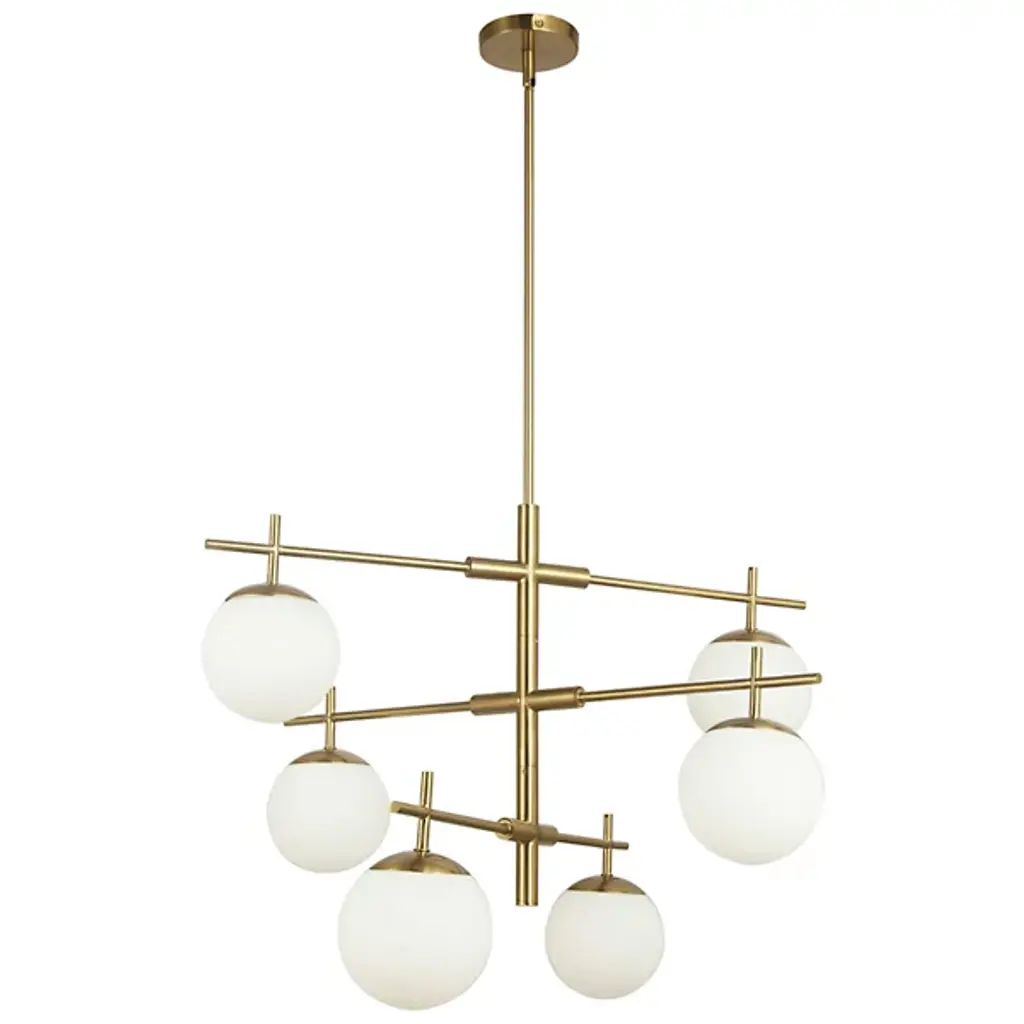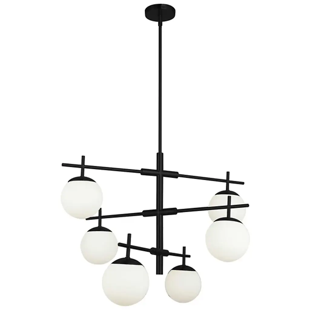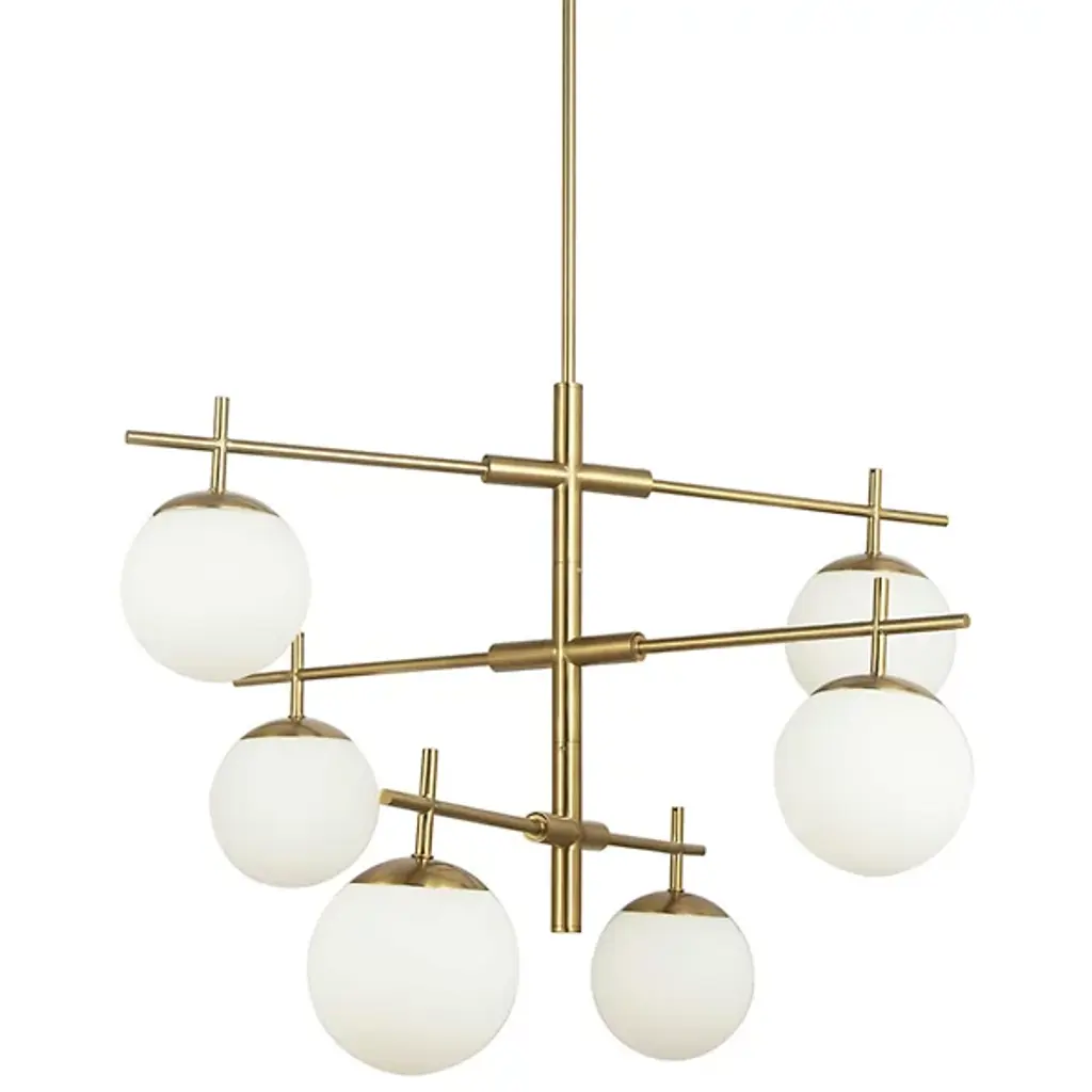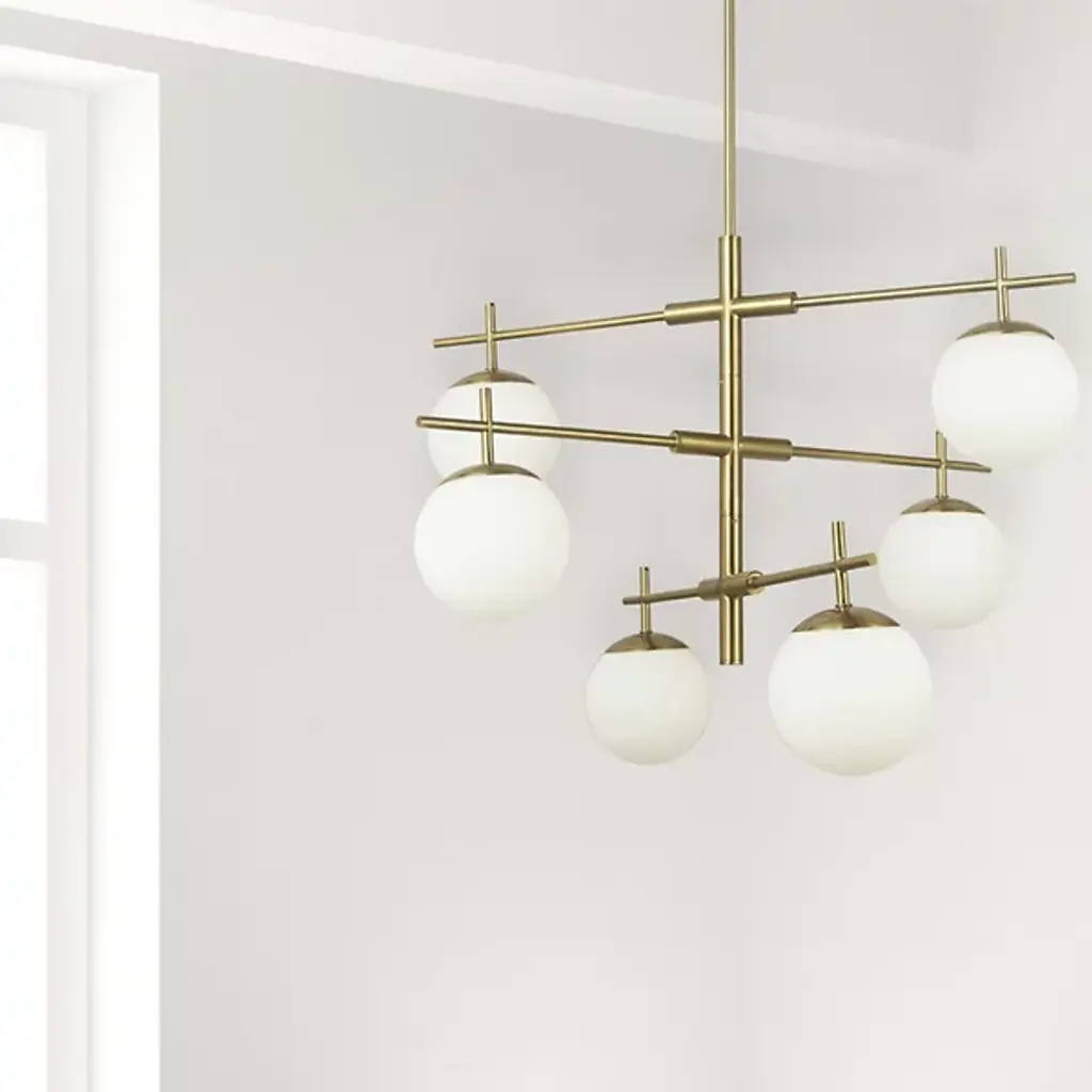 A soft, elegant lighting look for modern interiors. The Caelia Chandelier by Dainolite hints at Art Deco and MCM design inspiration in its precisely crafted metal frame and the smooth glass globes that hang from and glow at either end of metal arms. During installation, the horizontal position of each arm can be adjusted to create just the right look and spread of ambient light you want in a tall foyer, stairwell or dining room.