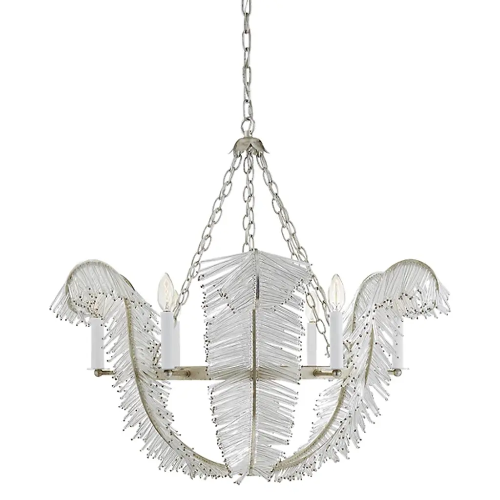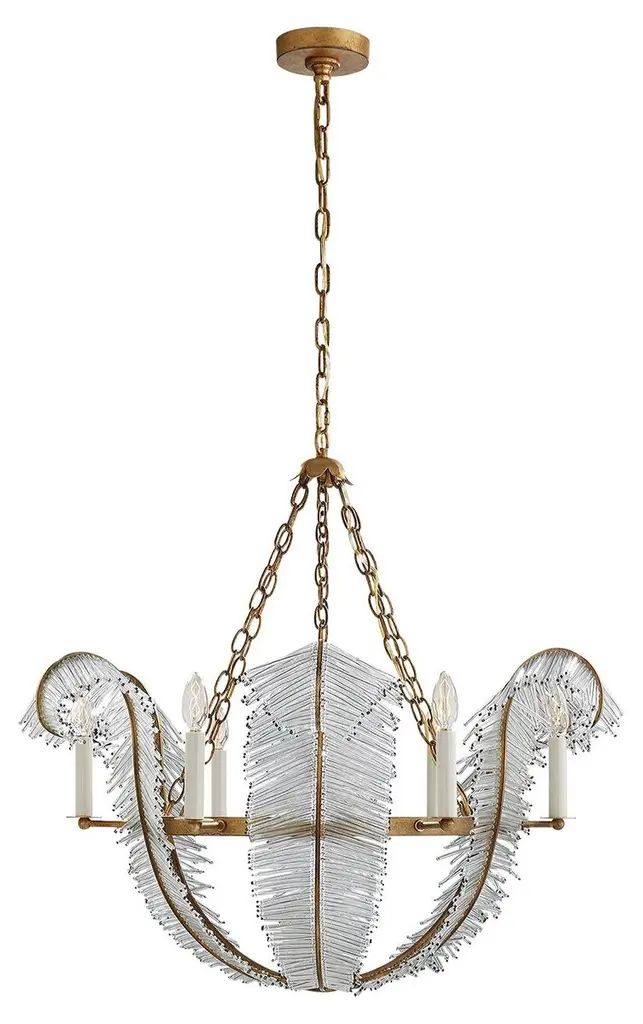 This gorgeous chandelier lends a tasteful look. The gold-finished frame supports six single candles surrounded by featherlike crystals to complete its ethereal nature.