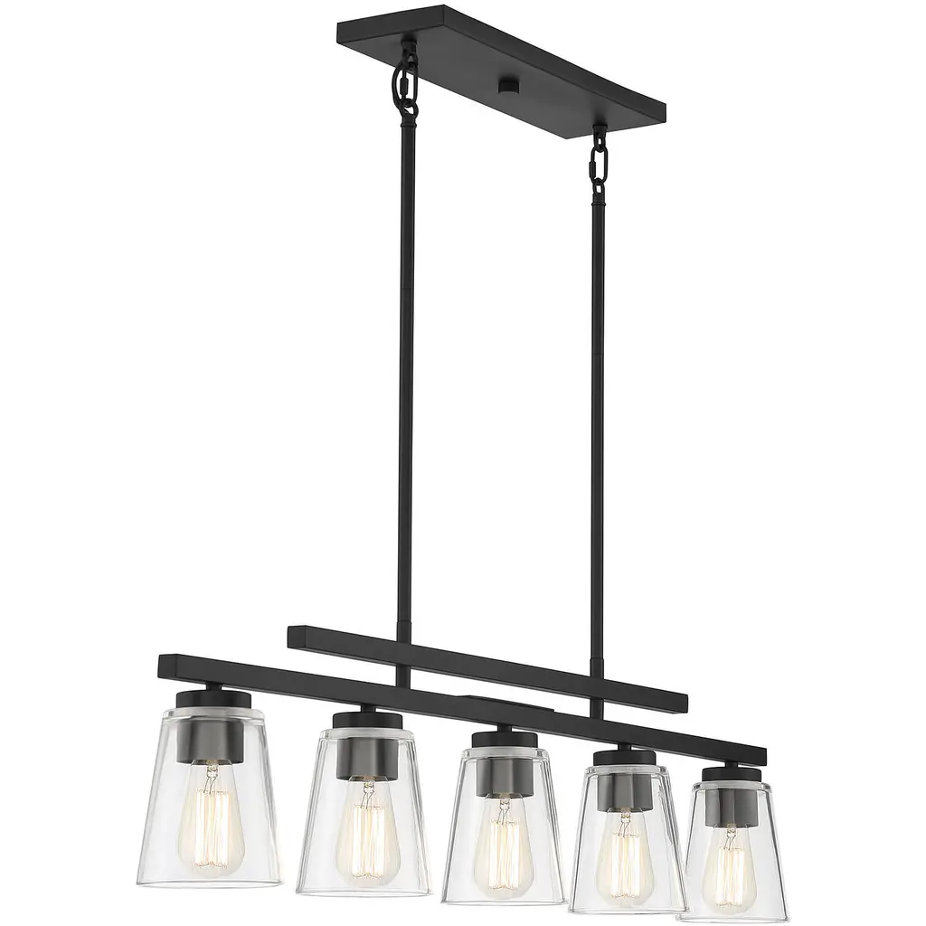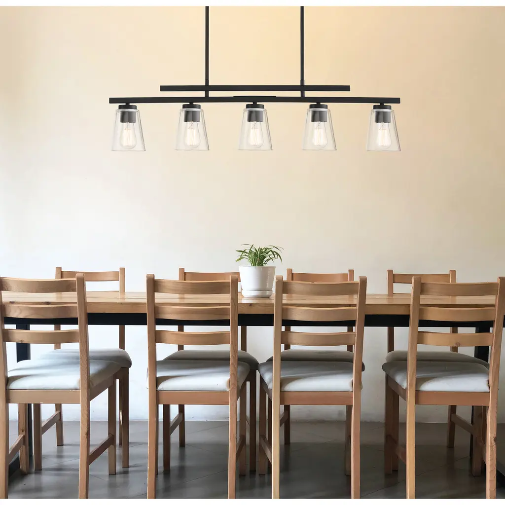 The linear lines of the Calhoun draw the eye to its symmetrical beauty with a matte black finish and clear glass shades. With an adjustable height from 16" to 62" and measuring 40" long x 5" wide, this five-light linear chandelier provides ample illumination from five 60-watt standard size bulbs.
