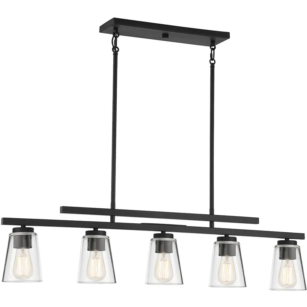 The linear lines of the Calhoun draw the eye to its symmetrical beauty with a matte black finish and clear glass shades. With an adjustable height from 16" to 62" and measuring 40" long x 5" wide, this five-light linear chandelier provides ample illumination from five 60-watt standard size bulbs.