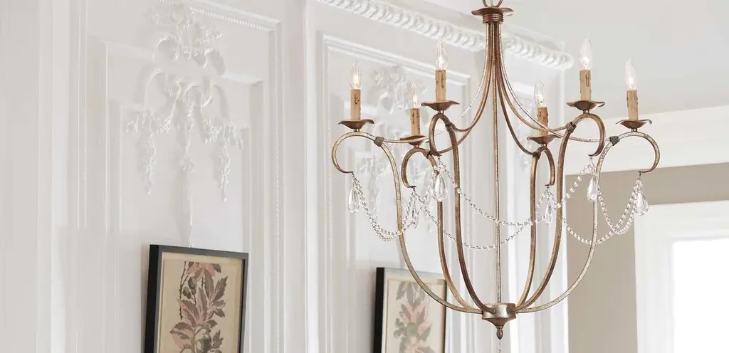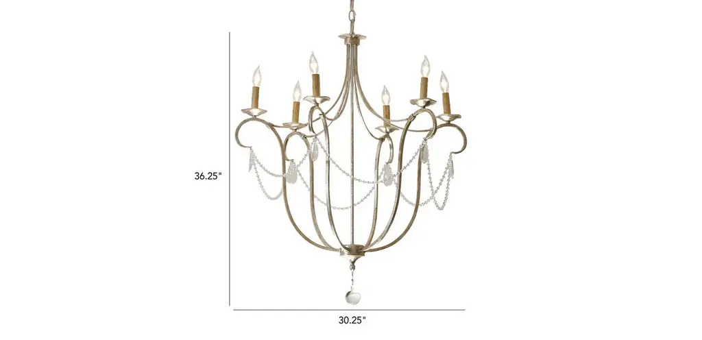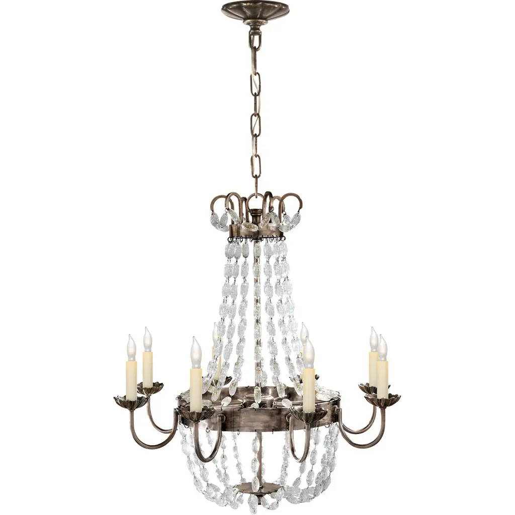 Our curvaceous steel chandelier in an aged-silver finish combines elements that are all-at-once industrial and romantic. Adorned with a crystal swag and French pendant crystals, this chandelier ensures the right amount of sparkle.