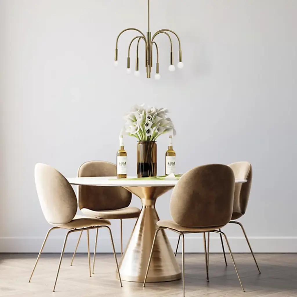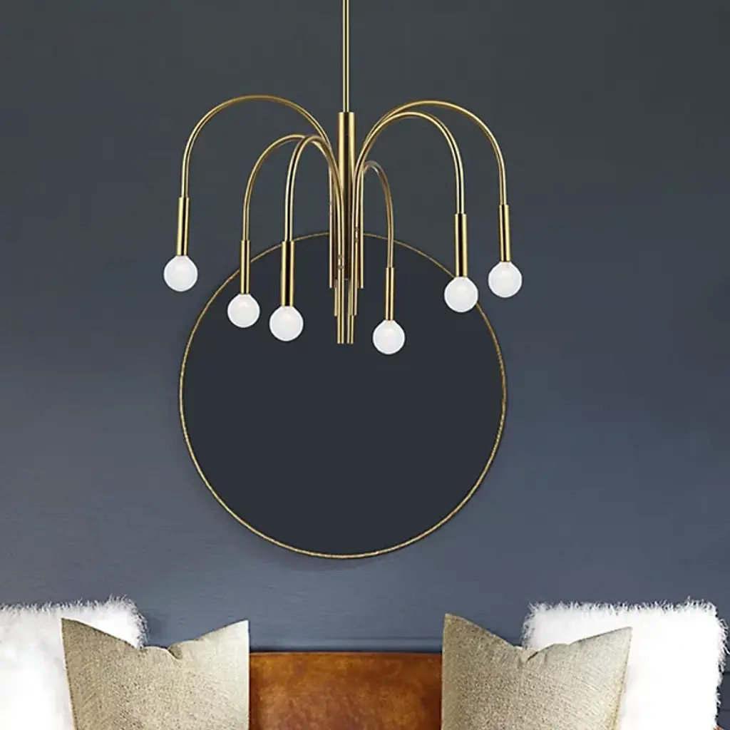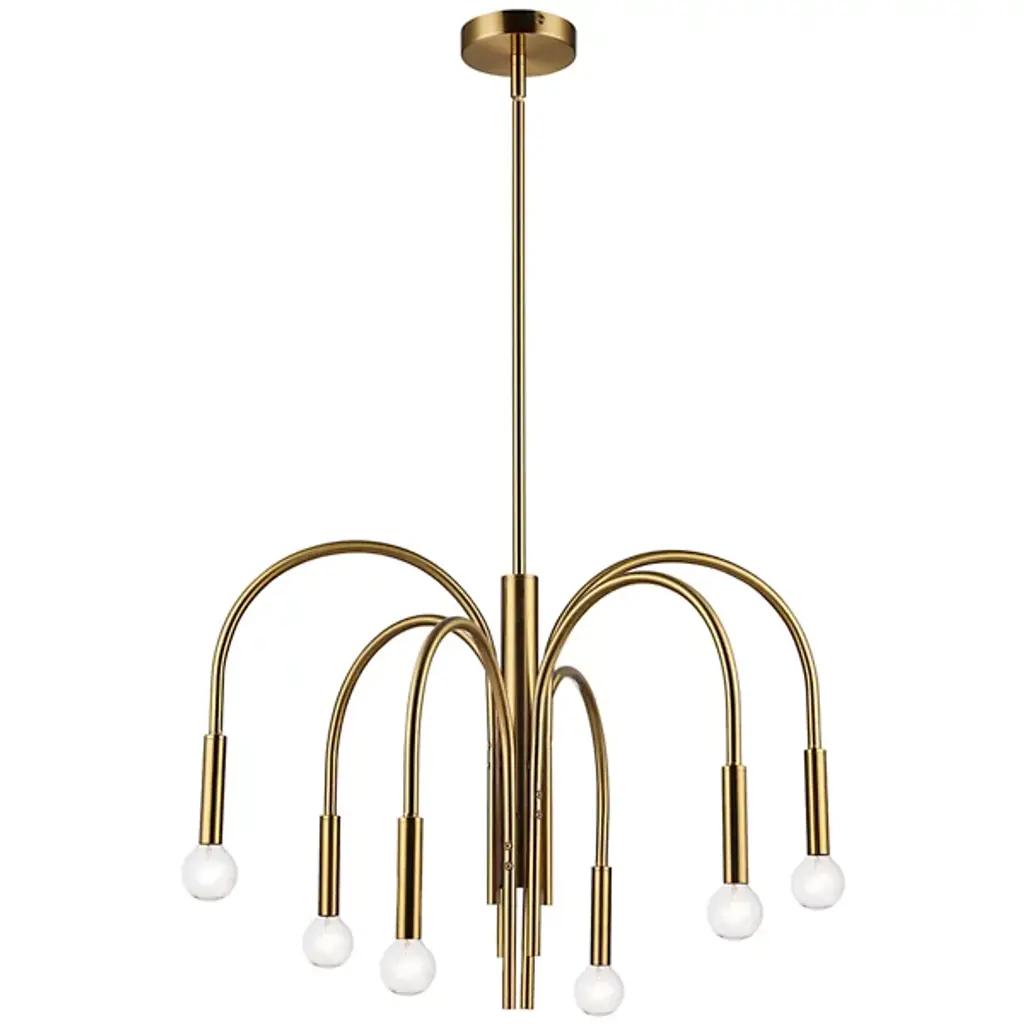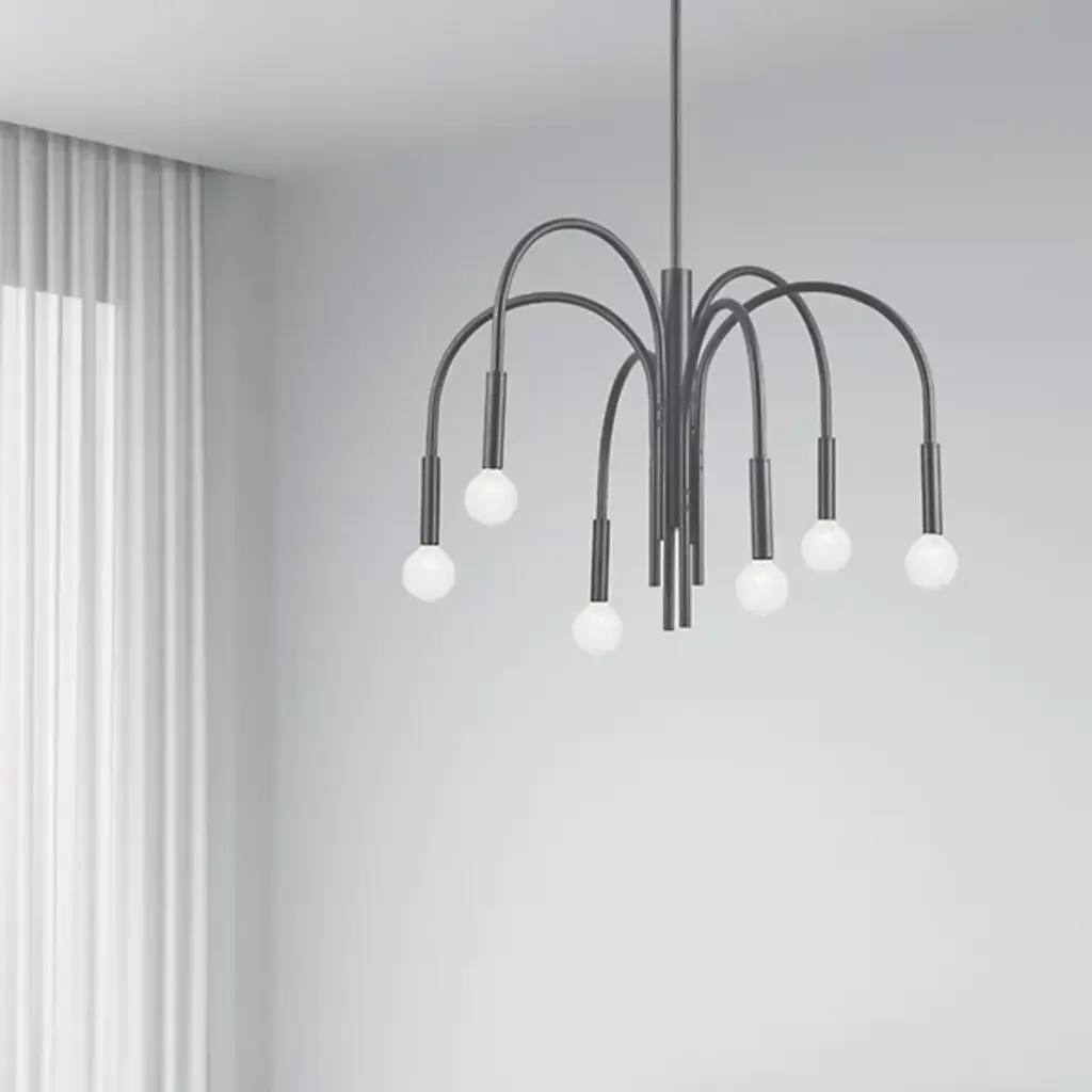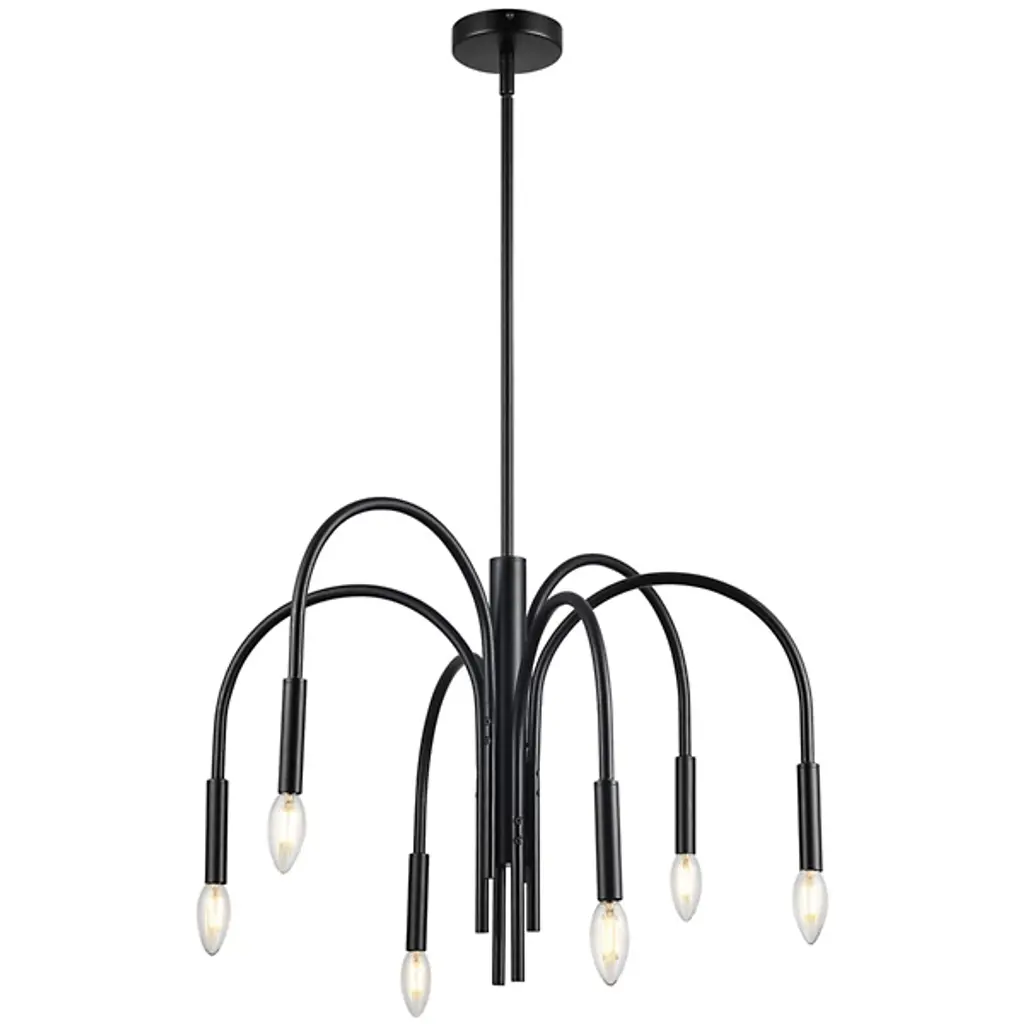 An elegant piece with gorgeously graphic curves. The Callway Chandelier by Dainolite has several metal arms with generous arches that give the entire piece a look evocative of a weeping willow. At the end of each arm, an exposed downlight is allowed to shine brightly and unimpeded over a dining table or in a living room. The shape of the chosen bulbs (not included) completes the pointed or soft look you want overall.