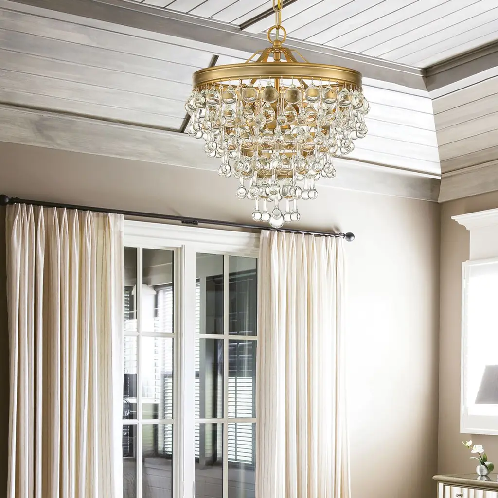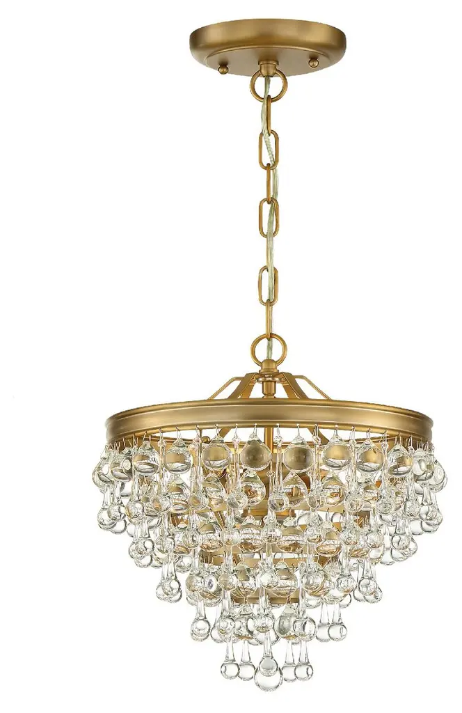 Ideal for bringing grandeur and glamour to a compact room, this pendant is only a foot wide, but it glimmers with scores of smooth glass balls in an array of sizes descending from the frame. Hardwired.