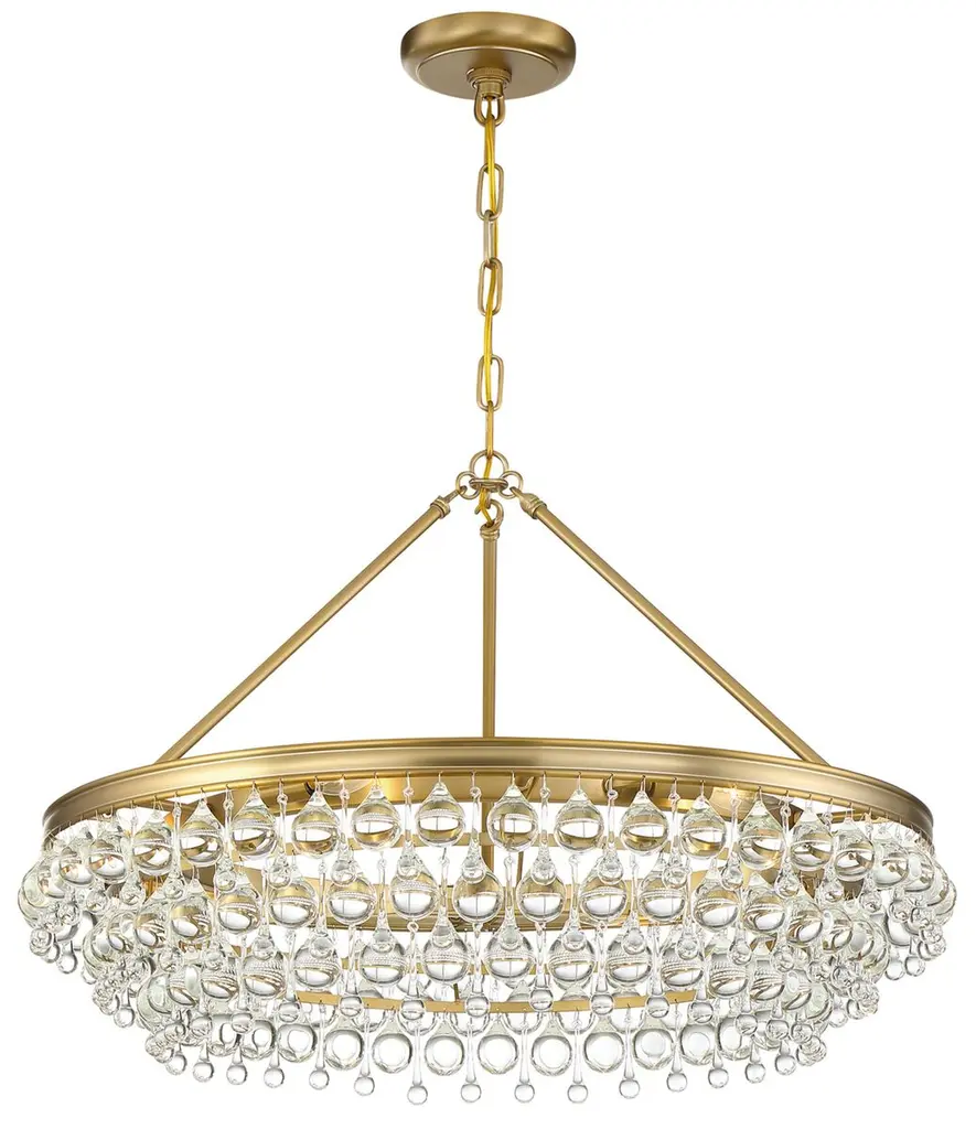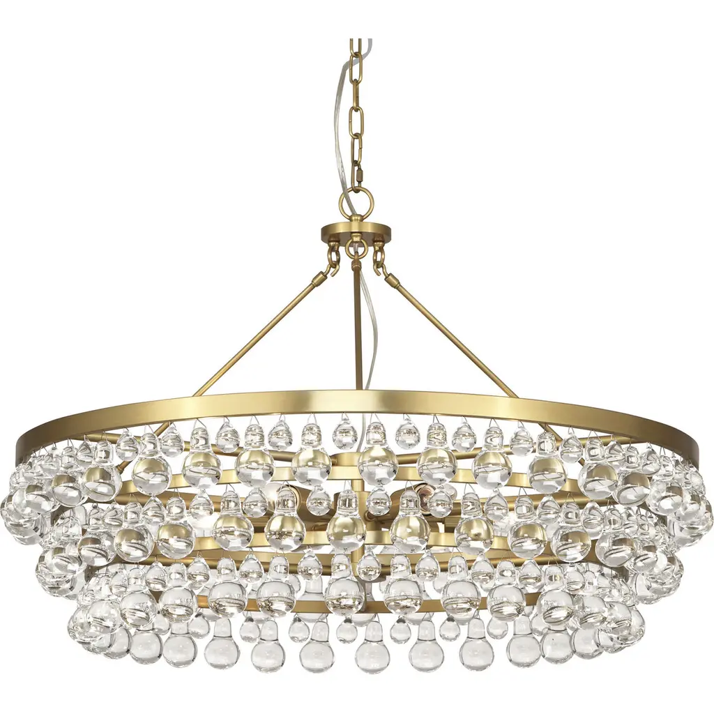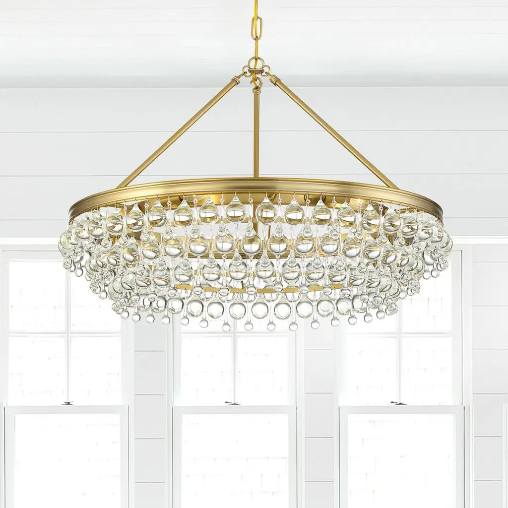 This glamorous chandelier glimmers with scores of clear glass balls and teardrops descending from a gleaming fixture. Hardwired.