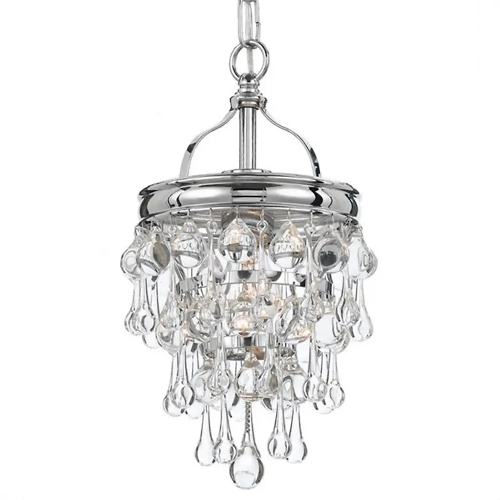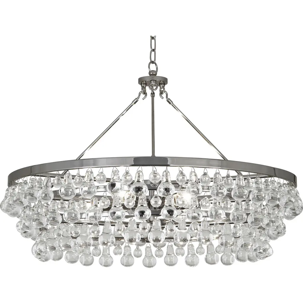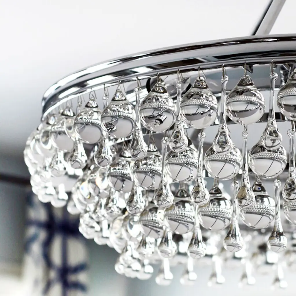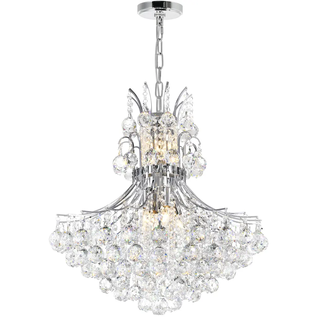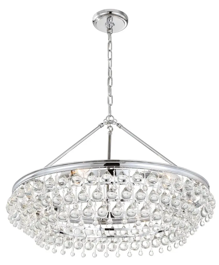 This glamorous chandelier glimmers with scores of clear glass balls and teardrops descending from a gleaming fixture. Hardwired.
