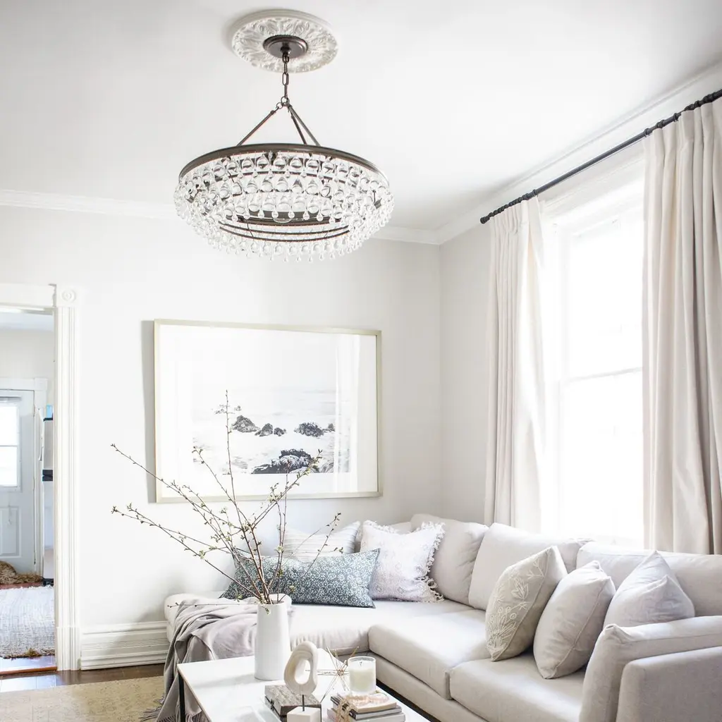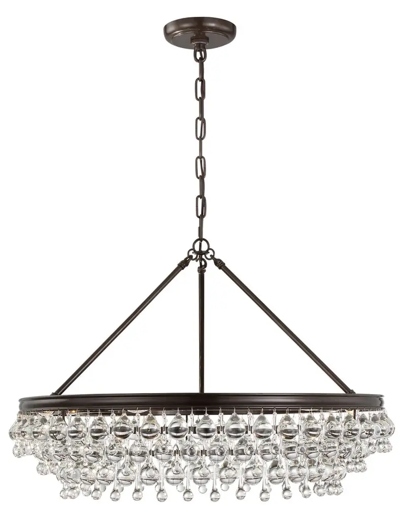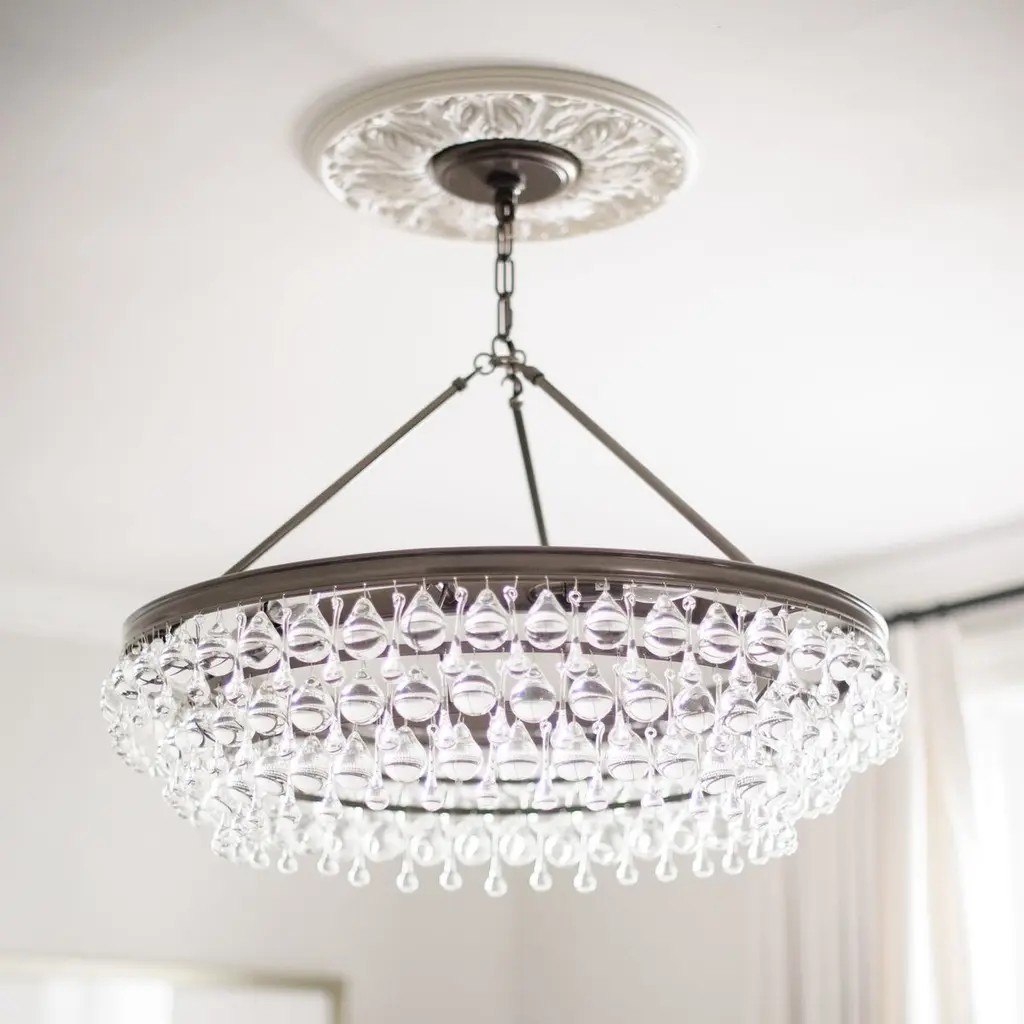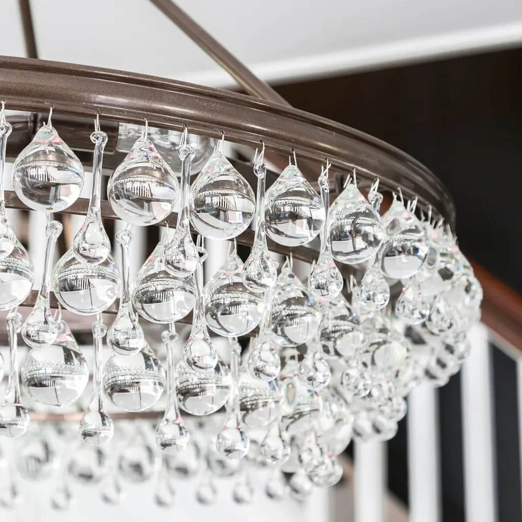 This glamorous chandelier glimmers with scores of clear glass balls and teardrops descending from a gleaming fixture. Hardwired.