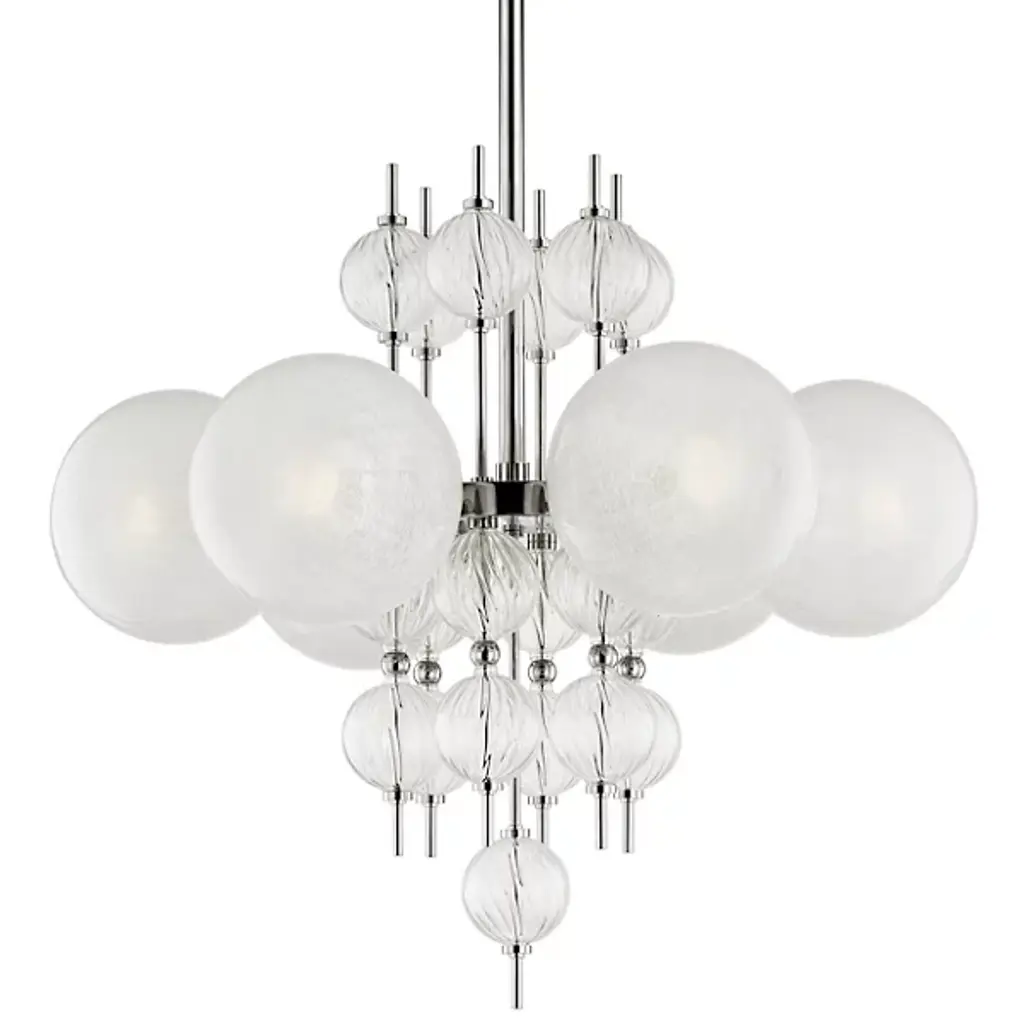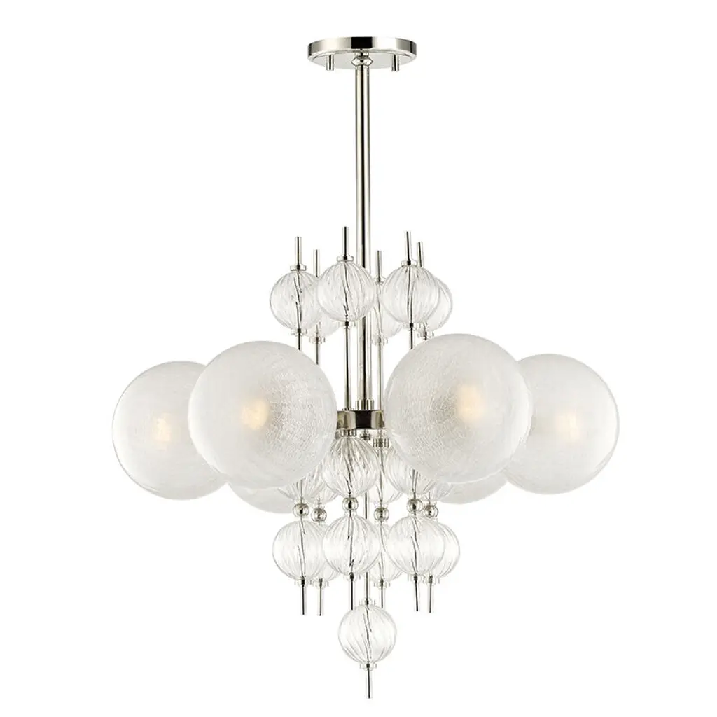 A glamorous accent with maximalist inspiration. Hudson Valley Lighting's Calypso Chandelier boasts a sleek Steel base that's detailed with numerous fluted-spiral Glass orbs. Enlarged spherical Glass shades surround the orbs to accentuates its illumination, which is diffused beautifully with contemporary flair. This statement-making chandelier makes a fantastic focal point in the dining room, living room or bedroom and also as the centerpiece to greet guests entering the foyer. Its luminous, glamorous aesthetic and modern form will appeal to contemporary decorators looking to improve the ambiance with a sophisticated piece that brightens in style.