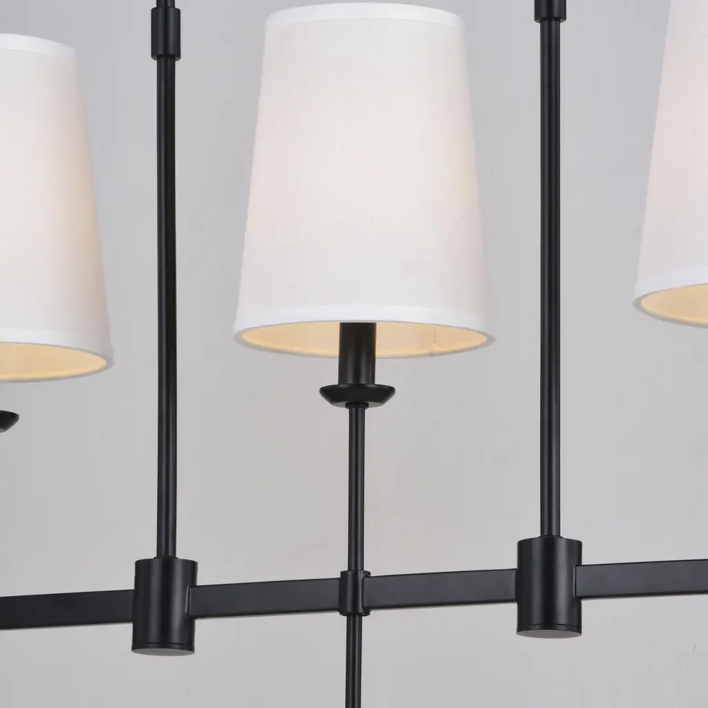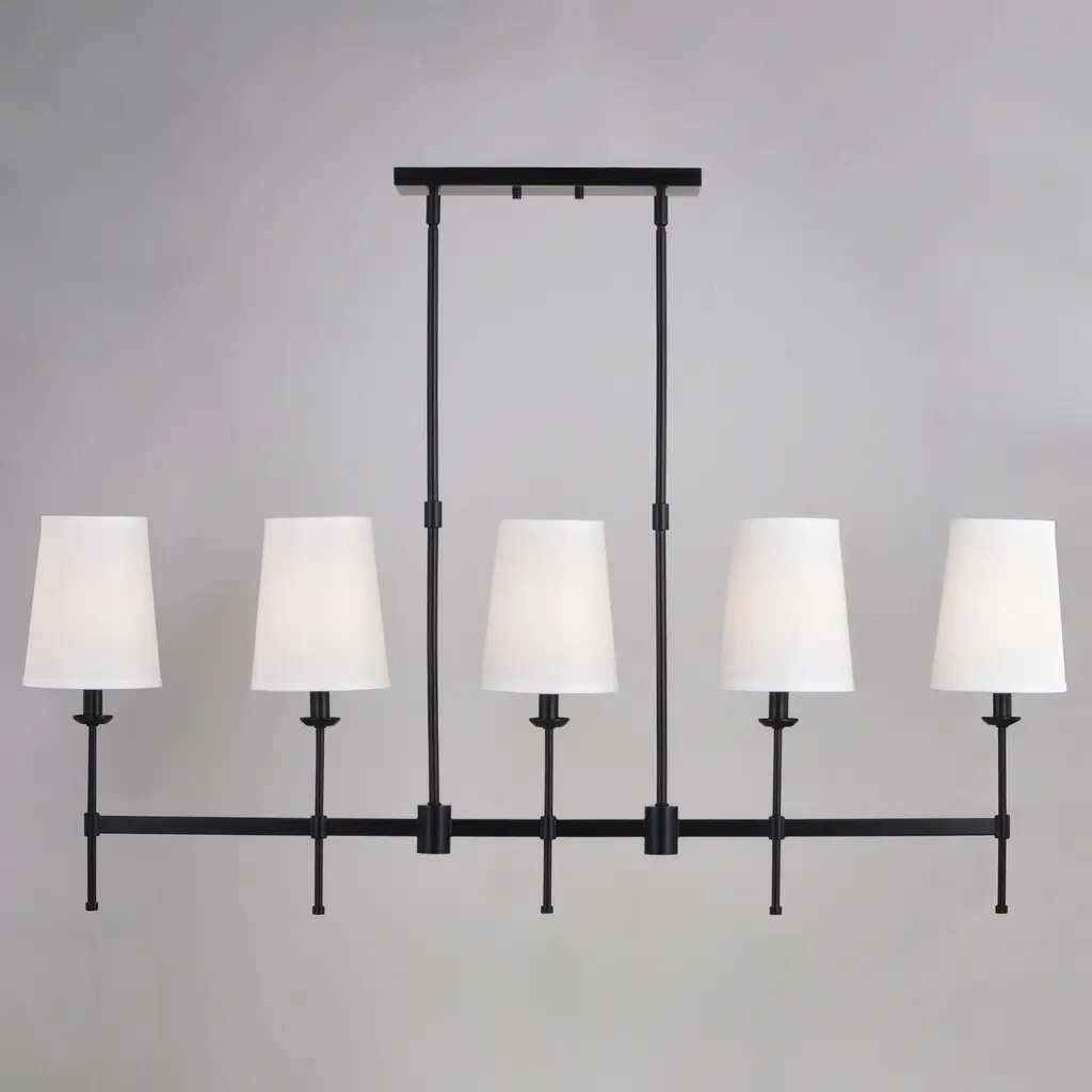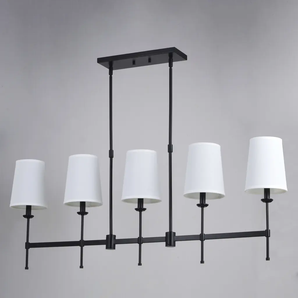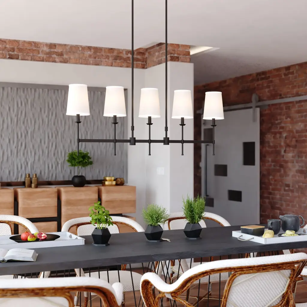The Camden collection is a timeless take on a classic. The graceful look of the white linen fabric shades provides ambient illumination and is sure to upgrade your decor. The linear footprint of this chandelier will complement oval or rectangle dining room tables and is ideal for kitchen islands, dining areas, or even bar areas.