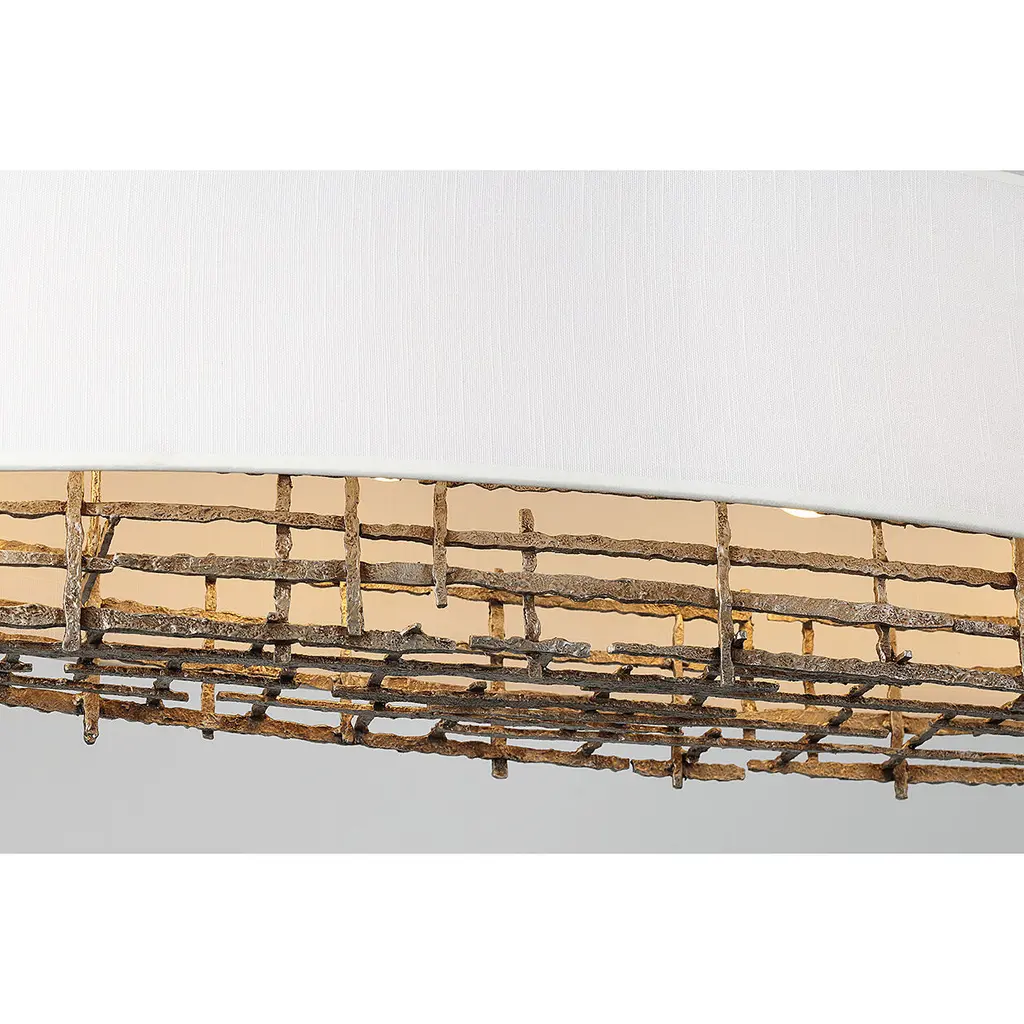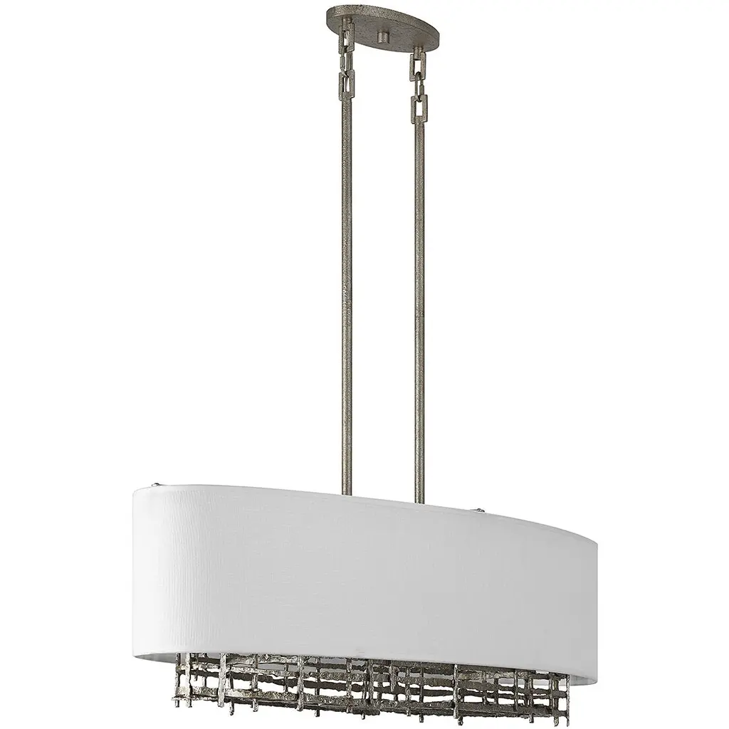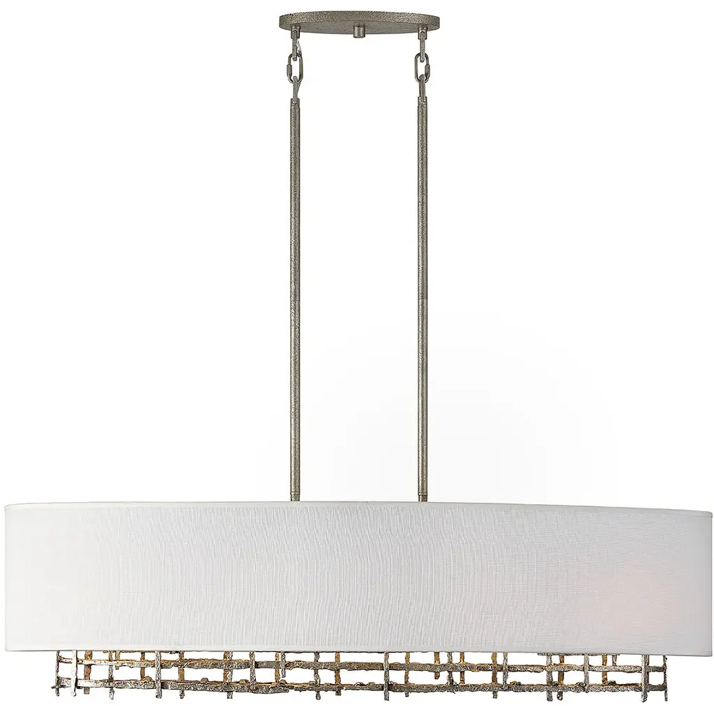 This Savoy House Cameo 4-light linear chandelier is proof that opposites attract. Its soft white linen shade and rough, nature-inspired detailing finished in champagne luxe create a perfect pair. Cameo is 12.125" in height, 44" in width and 14" in length. It uses 4 standard size bulbs of up to 60 watts per bulb (bulbs not included). Comes with eight 12" downrods and two 6" downrods.