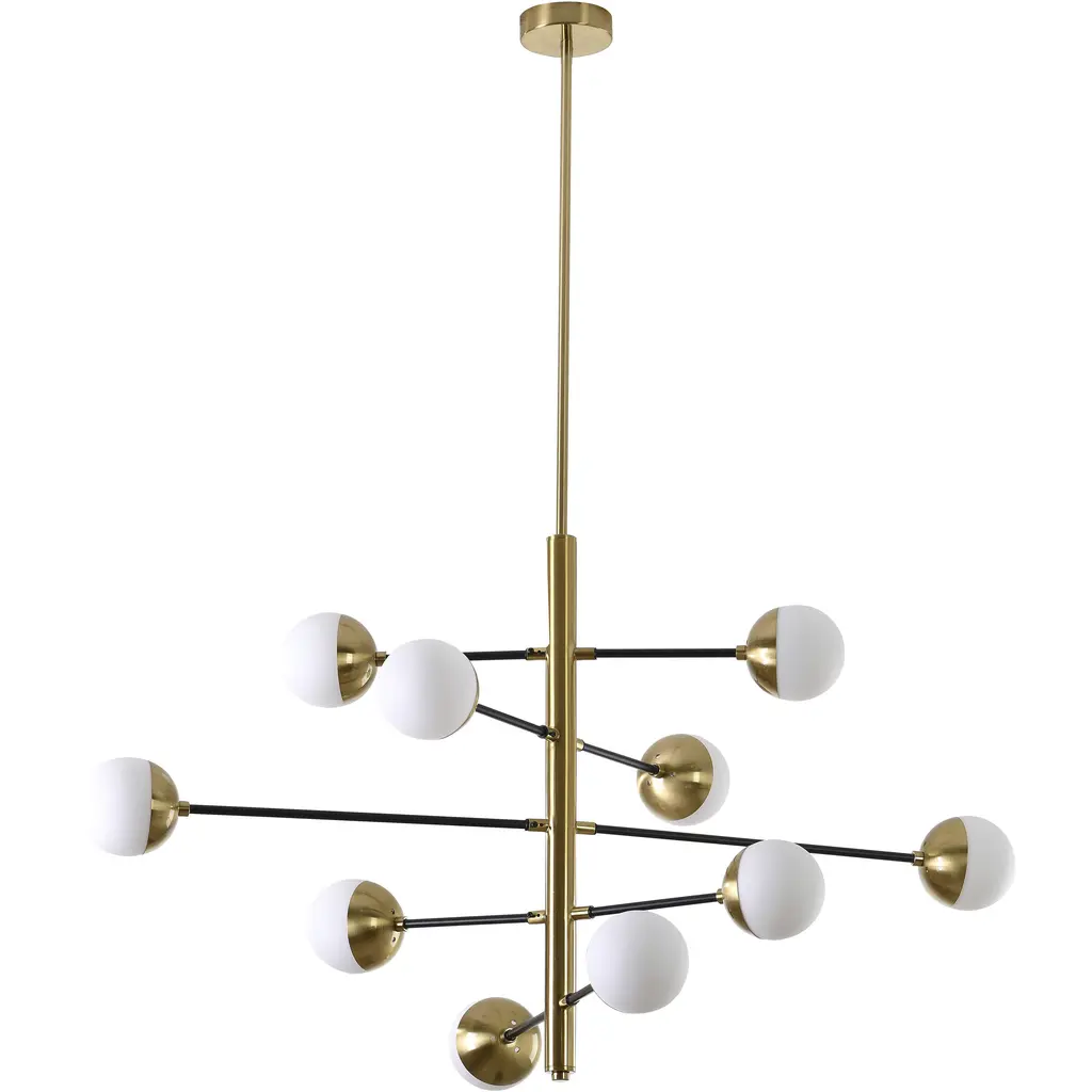 The lighting fixture features a unique combination of materials, with a frame made from both brass and black metal. The fixture's shade is crafted from milk white glass, which provides a soft, warm glow. The dimensions of the fixture are substantial, measuring 39.37 inches in diameter and 43.3 inches in height. If you are looking for a light source for your Livingroom, entryway, or dinning room, this 10-light traditional chandelier can easily fit into your modern home décor. The adjustable rod link makes this fixture suitable for most ceiling Heights