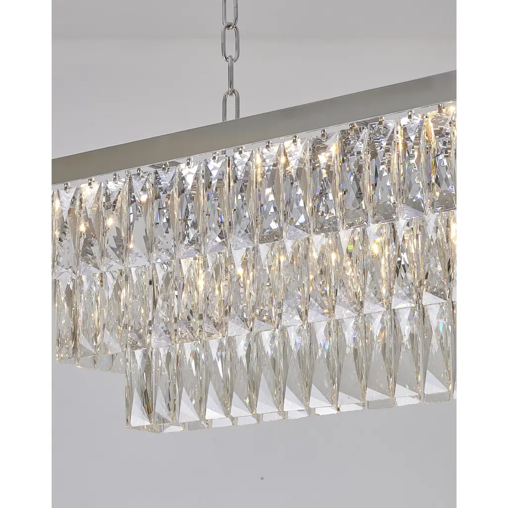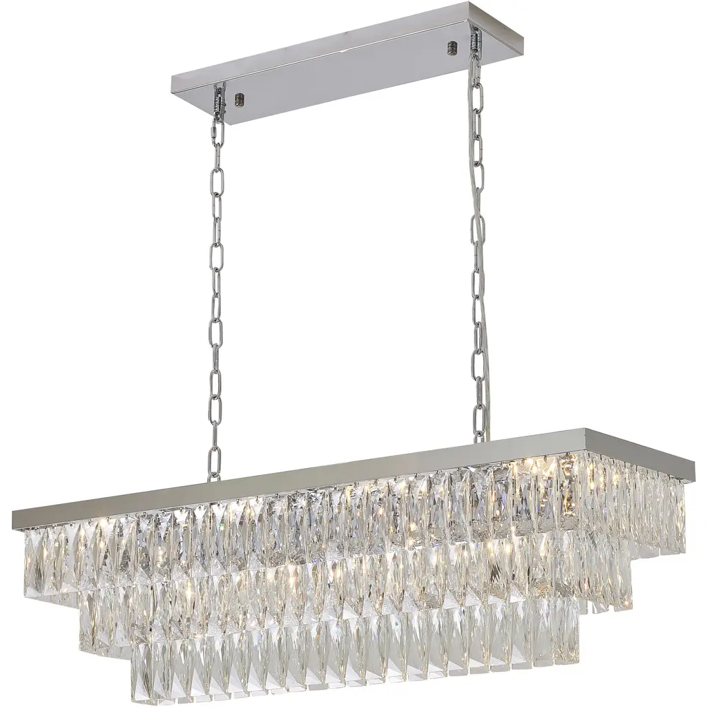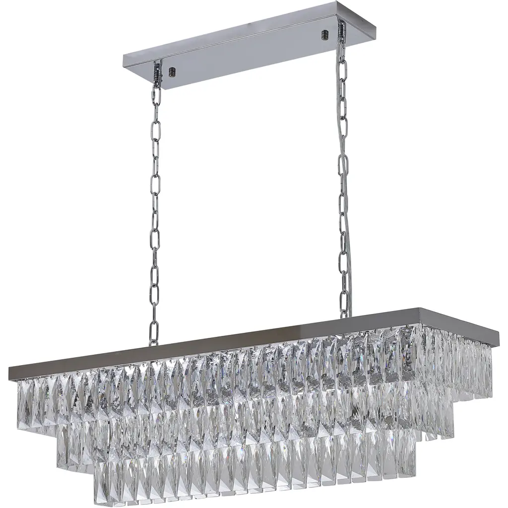 This contemporary chandelier is stunning with a chrome iron frame decked with strands of faceted clear crystals, and the crystals further highlight the uniqueness of this chandelier. When you hang this modern crystals chandelier in a room, you will easily be surprised by the magnificent light reflected by the crystals. This fixture showcase opulence and elegance and is the perfect modern accent to any space. If you are also looking for a light source for your bedroom, living room, or dinning room. The adjustable chain link makes this fixture suitable for most ceiling heights.