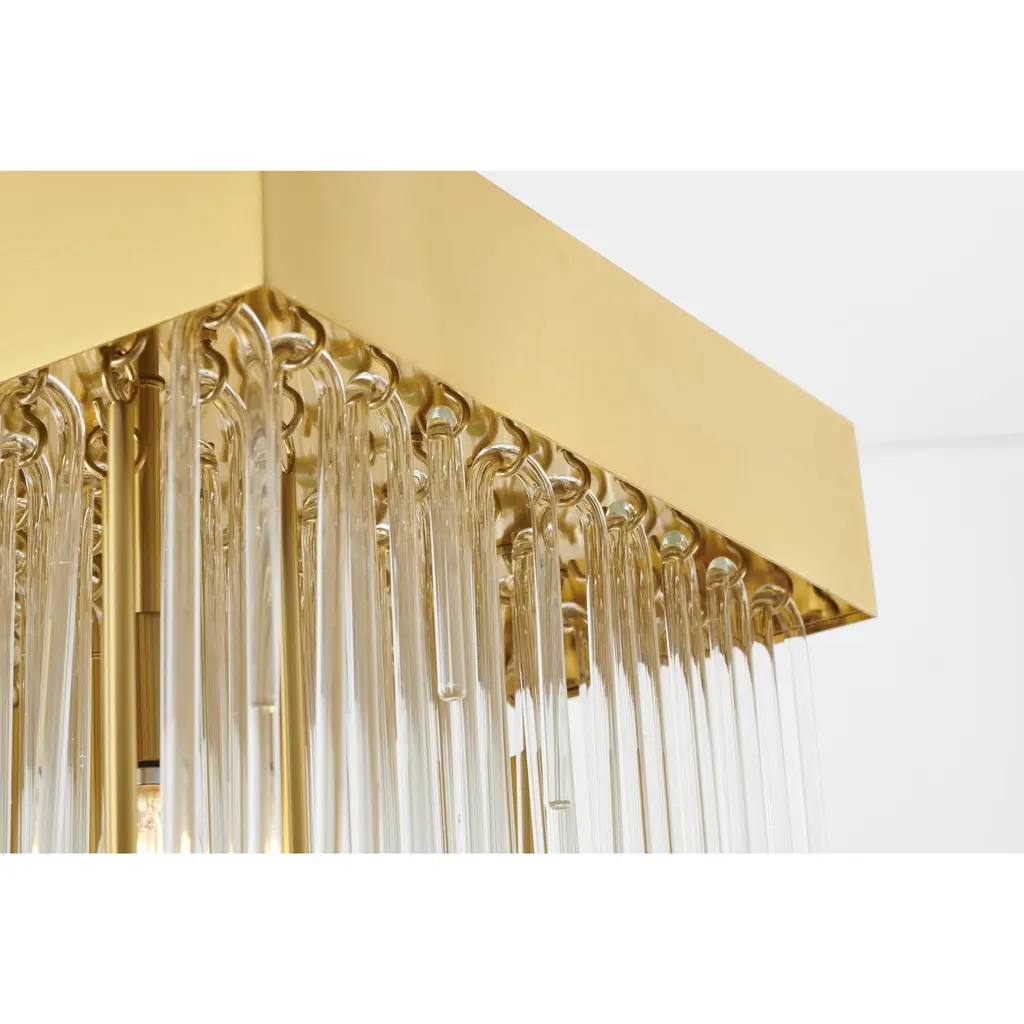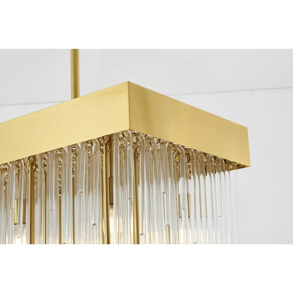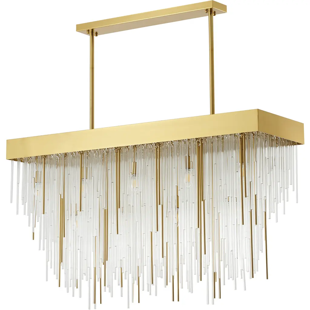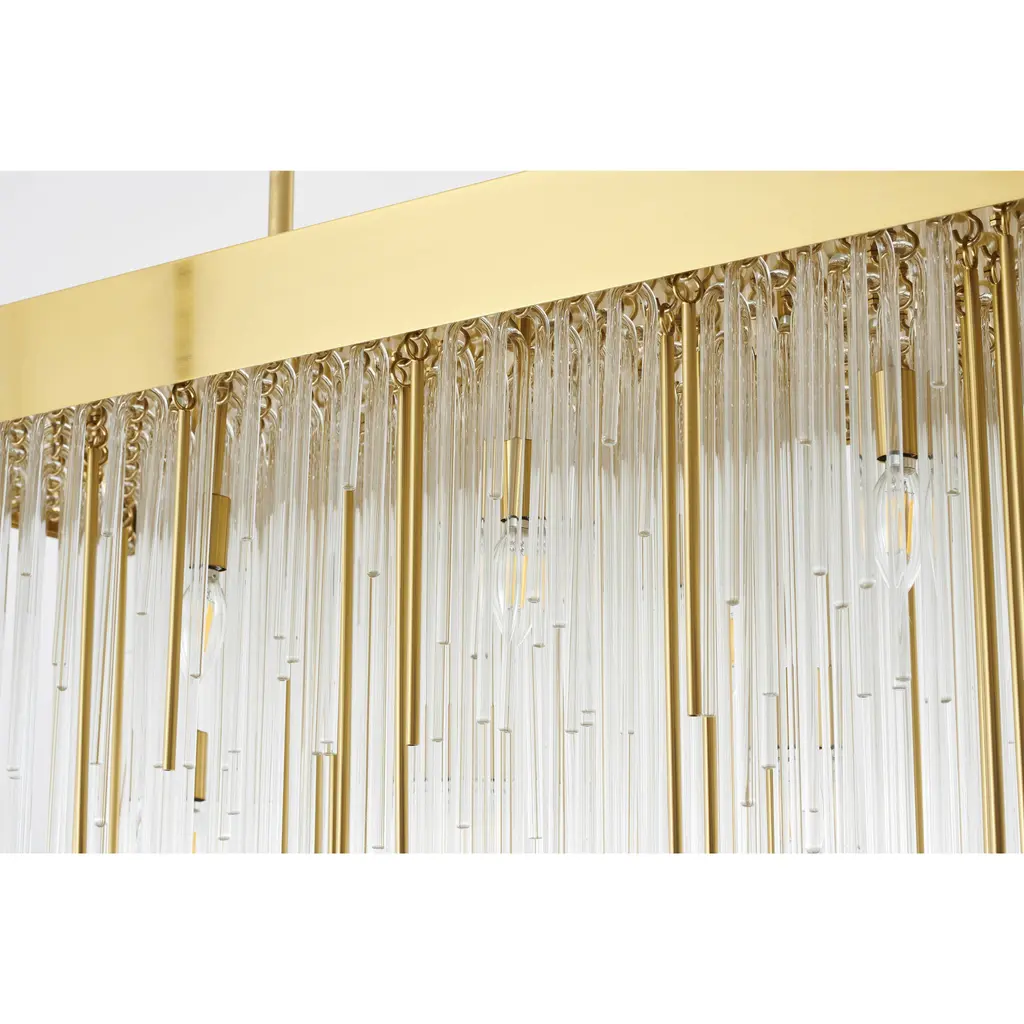 This 14-Light contemporary chandelier presents a unique design that works beautifully in any living room, entryway, foyer, or dinning room. Crafted with an antique brass metal frame and clear hanging looped glass rods, the fixture blends function with style for a unique look that is sure to impress. The adjustable rod links make this fixture suitable for most ceiling heights.