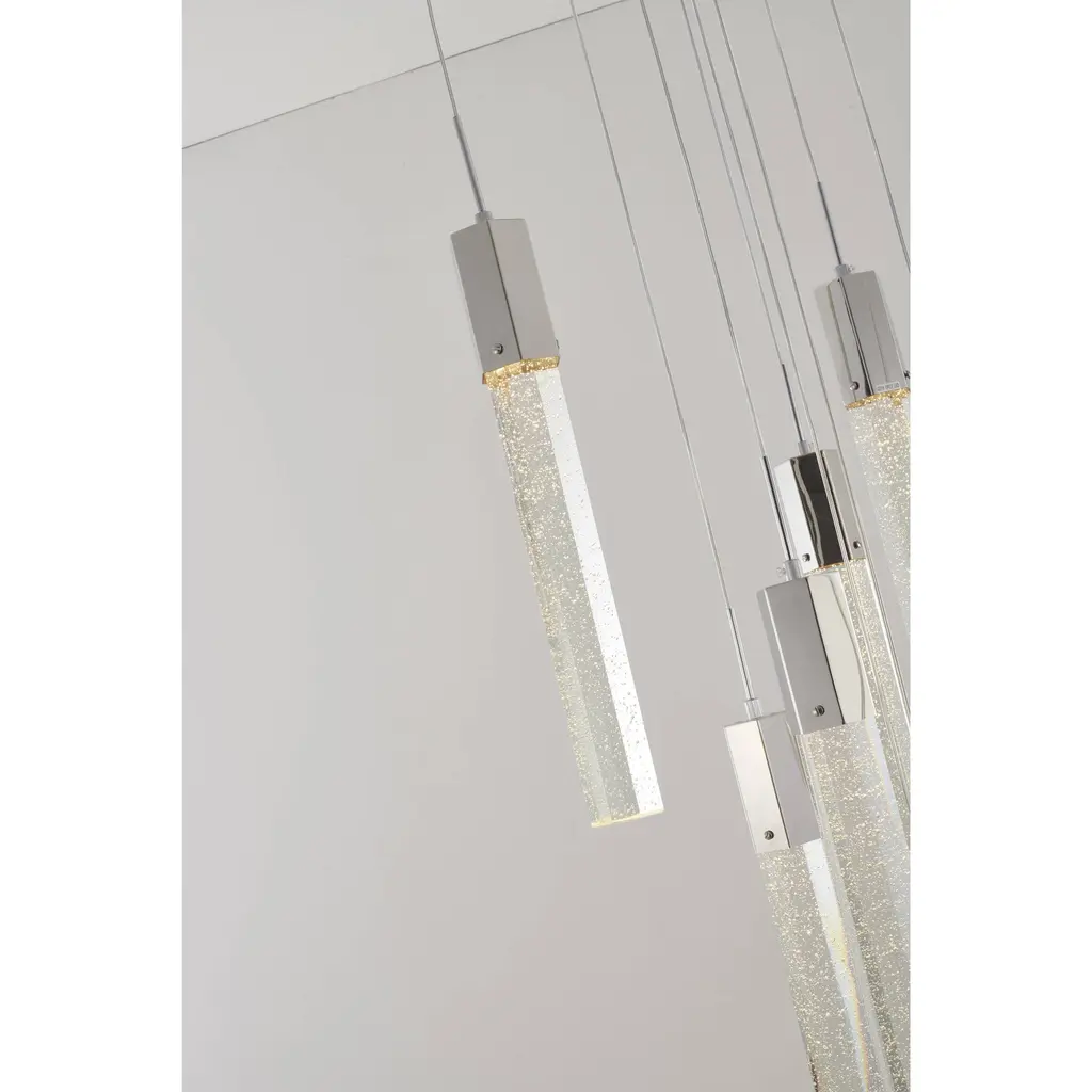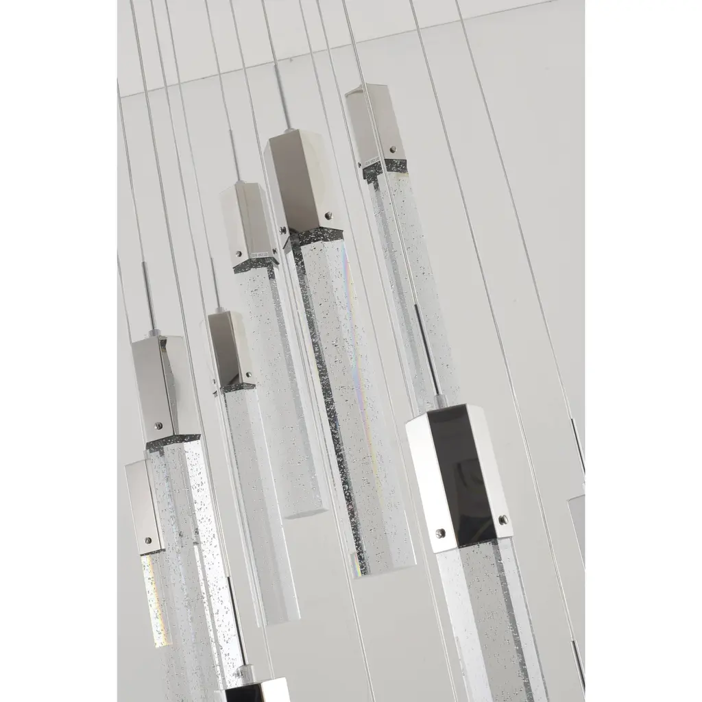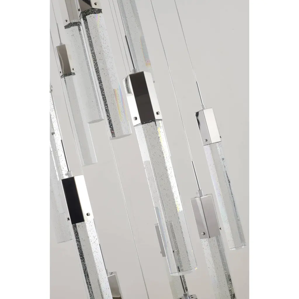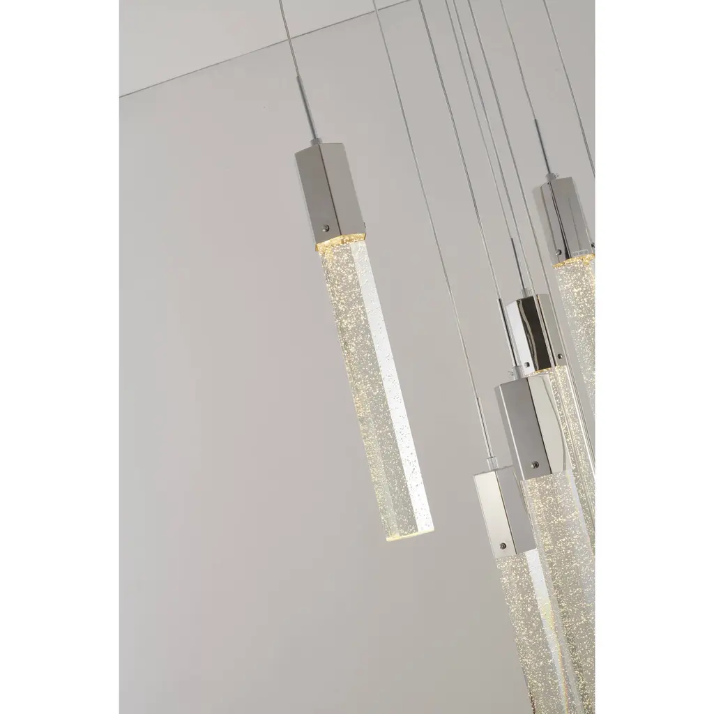This 15-Light clear bubble Crystal transitional Chandelier with a chrome frame is a stunning and modern lighting fixture that's sure to be a conversation starter in any room such as living room, dinning room, or entryway. Its sleek design and energy-efficient bulbs make it a great addition to any space that wants to add a touch of elegance and sophistication. The clear bubble crystal accents add a touch of luxury and sophistication to the design, while the rectangular chrome frame provides a modern and sleek contrast