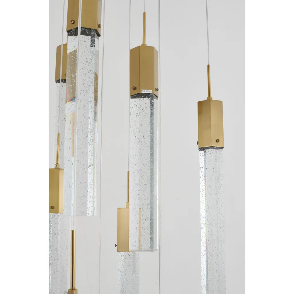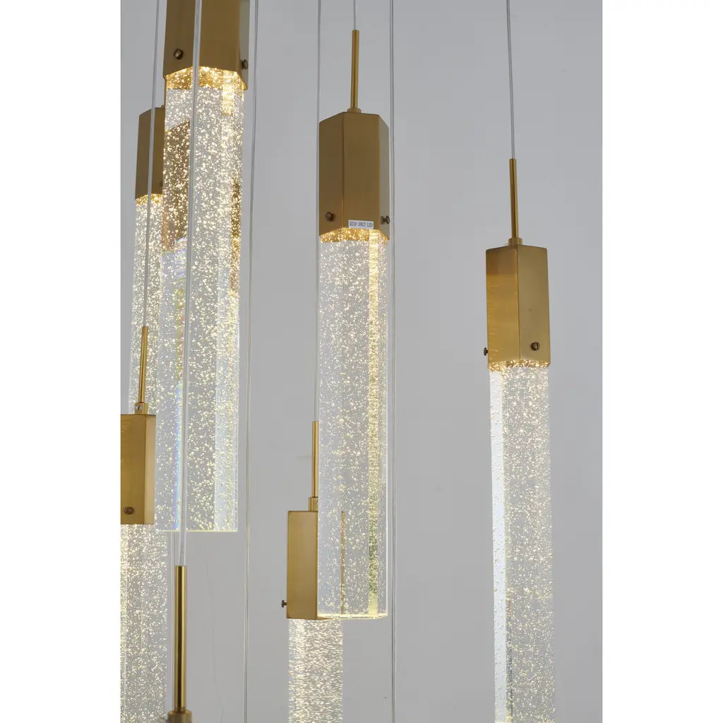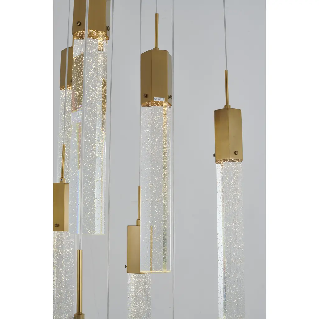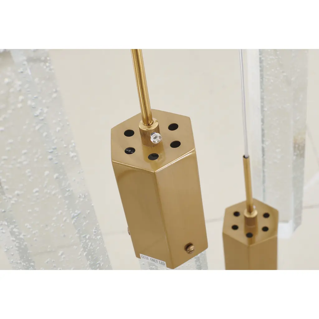 This chandelier is a gold flushed frame chandelier. It comes with clear hexagon bubble crystal hanging pendants. The cord length of 3.7 meters is provided and the cord length is adjustable.