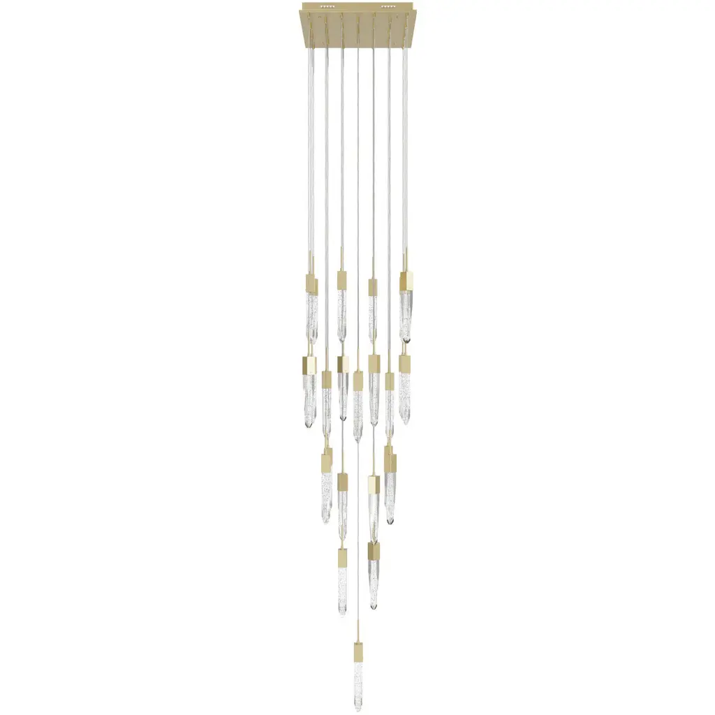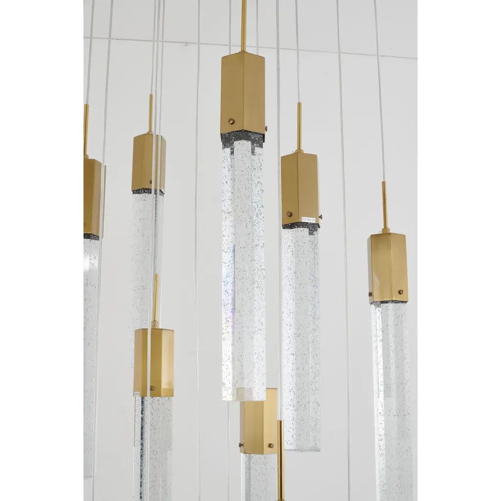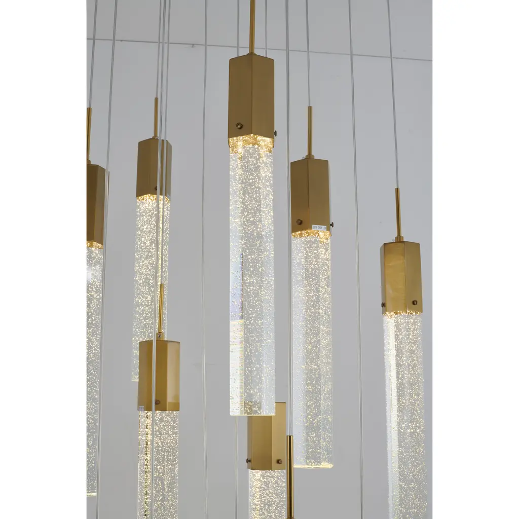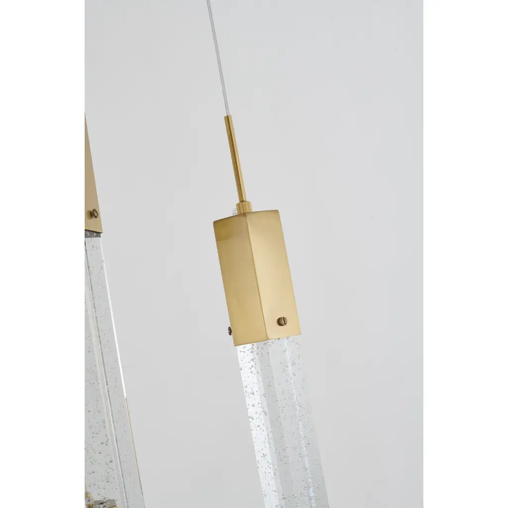 This chandelier is a gold flushed frame chandelier. It comes with clear hexagon bubble crystal hanging pendants. The cord length of 3.7 meters is provided and the cord length is adjustable.