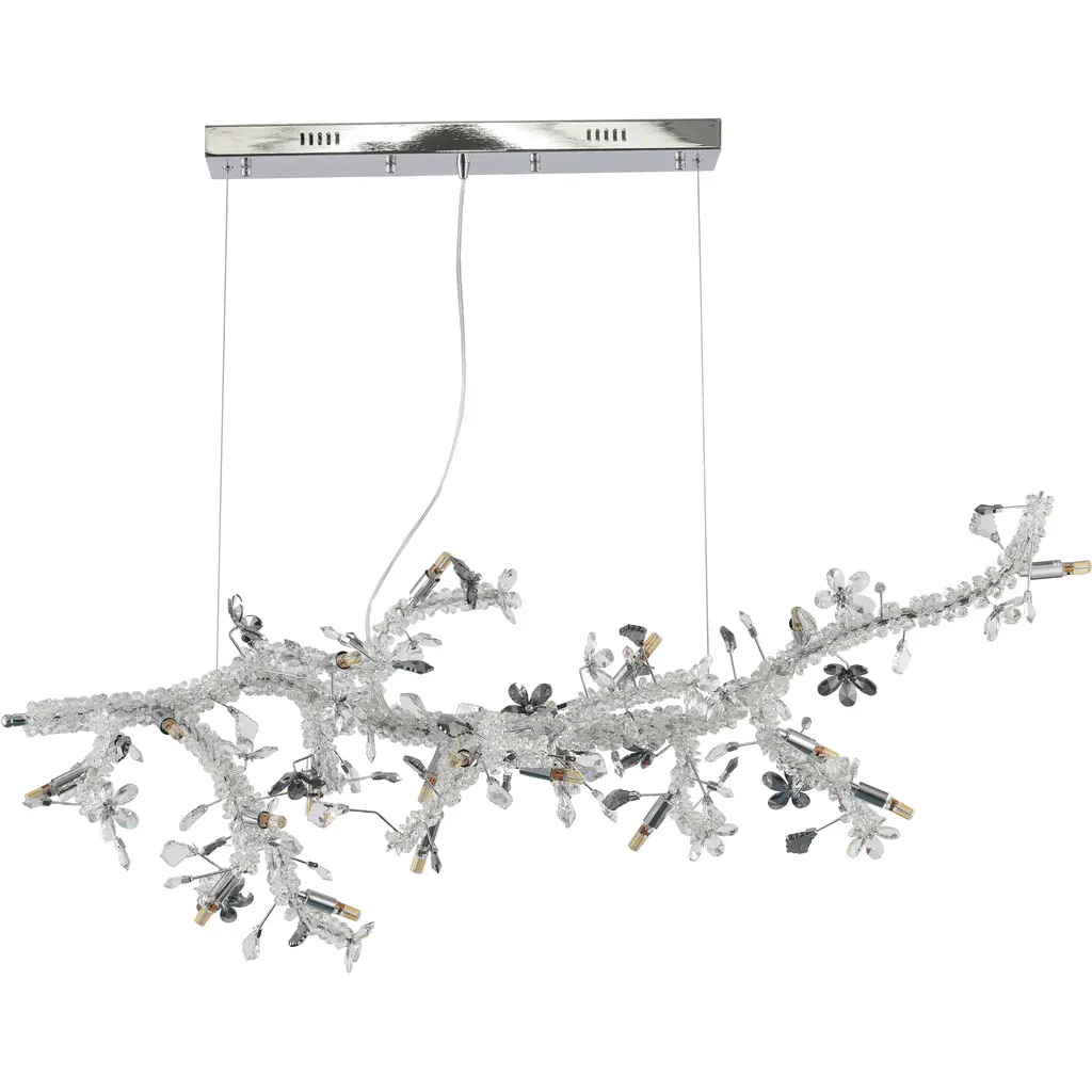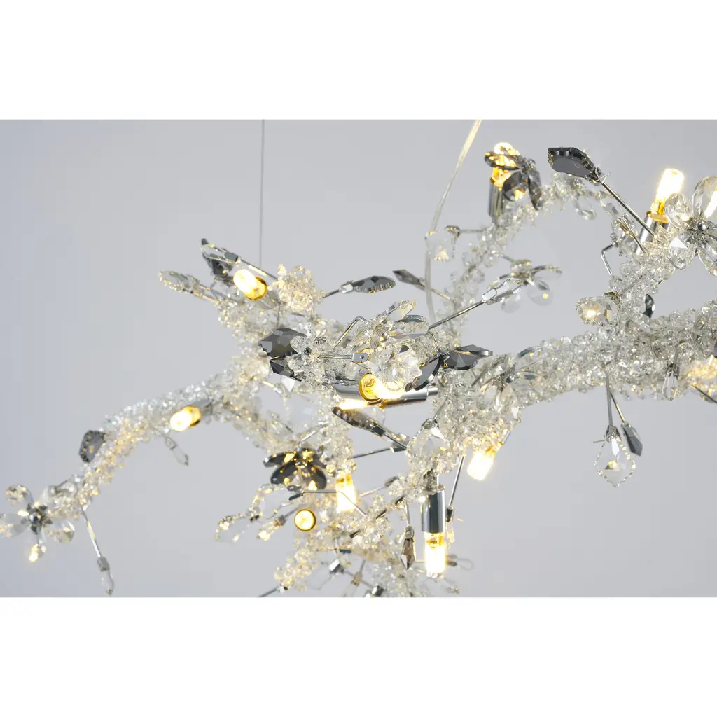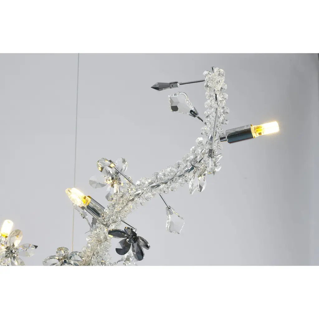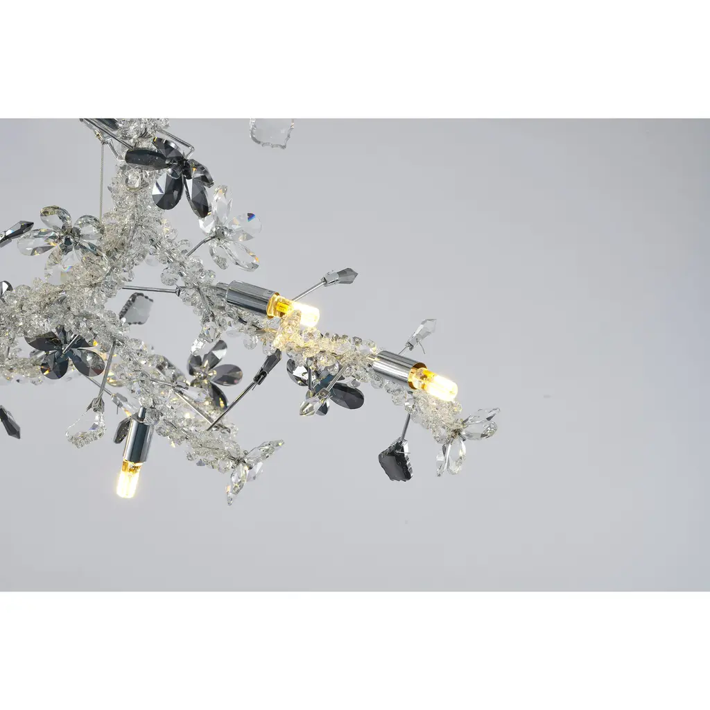 This chandelier is a clear and smoke crystal branch chandelier. It comes with chrome hardware and flower accents. The cord length of 60 inches is provided and the cord length is adjustable.