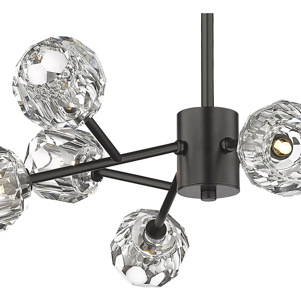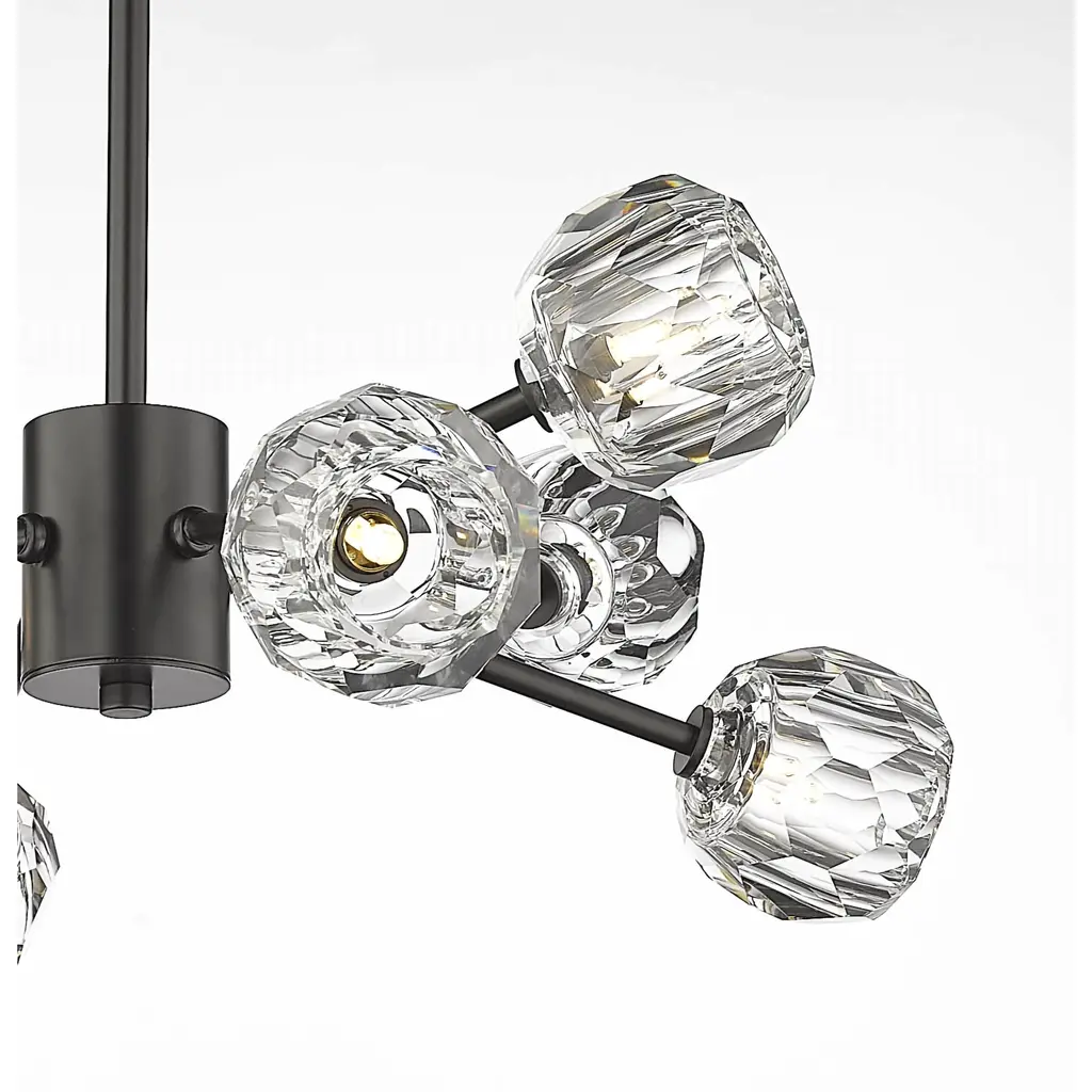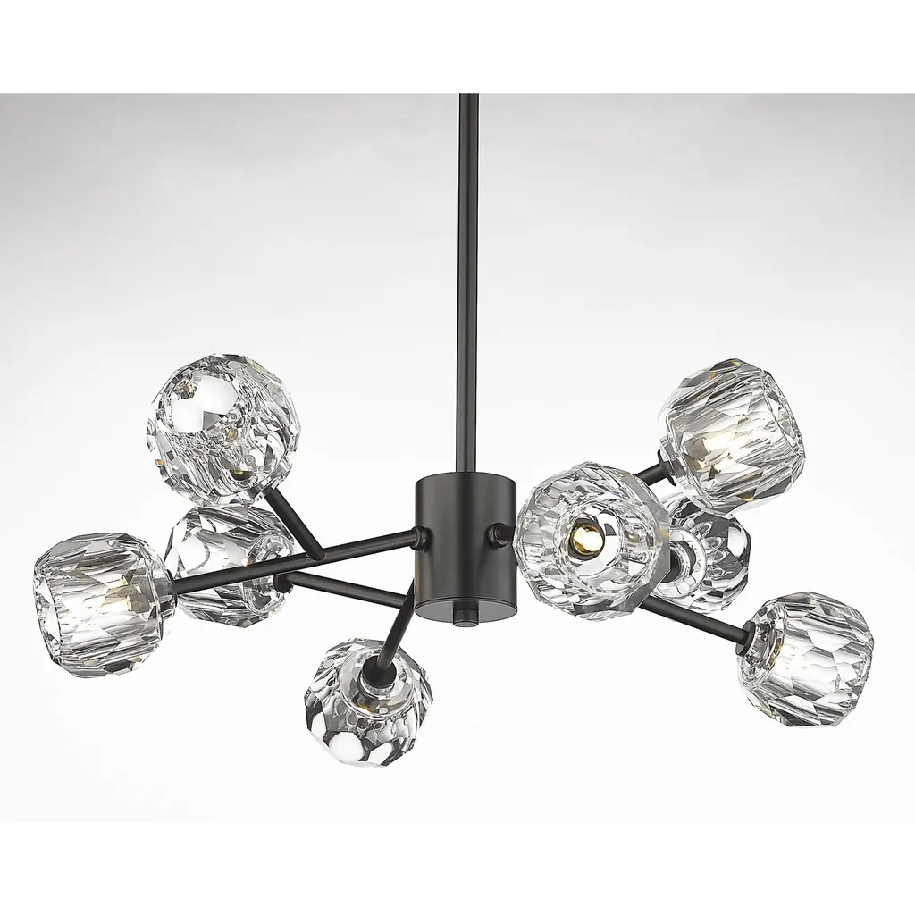 This contemporary chandelier is a stunning addition to any room, featuring a unique and eye-catching design that adds a touch of sophistication and elegance. The black frame provides a sleek and modern look, while the clear crystal shades add a touch of luxury and refinement. The light is designed to accommodate 8xG9 bulbs (Bulbs Not Included), each with a maximum wattage of 40W, allowing you to customize the light output to your preferences. Measuring 26 inches in diameter and 12 inches in height, this light is perfect for placing in a bedroom, living room, dinning room, or entryway.