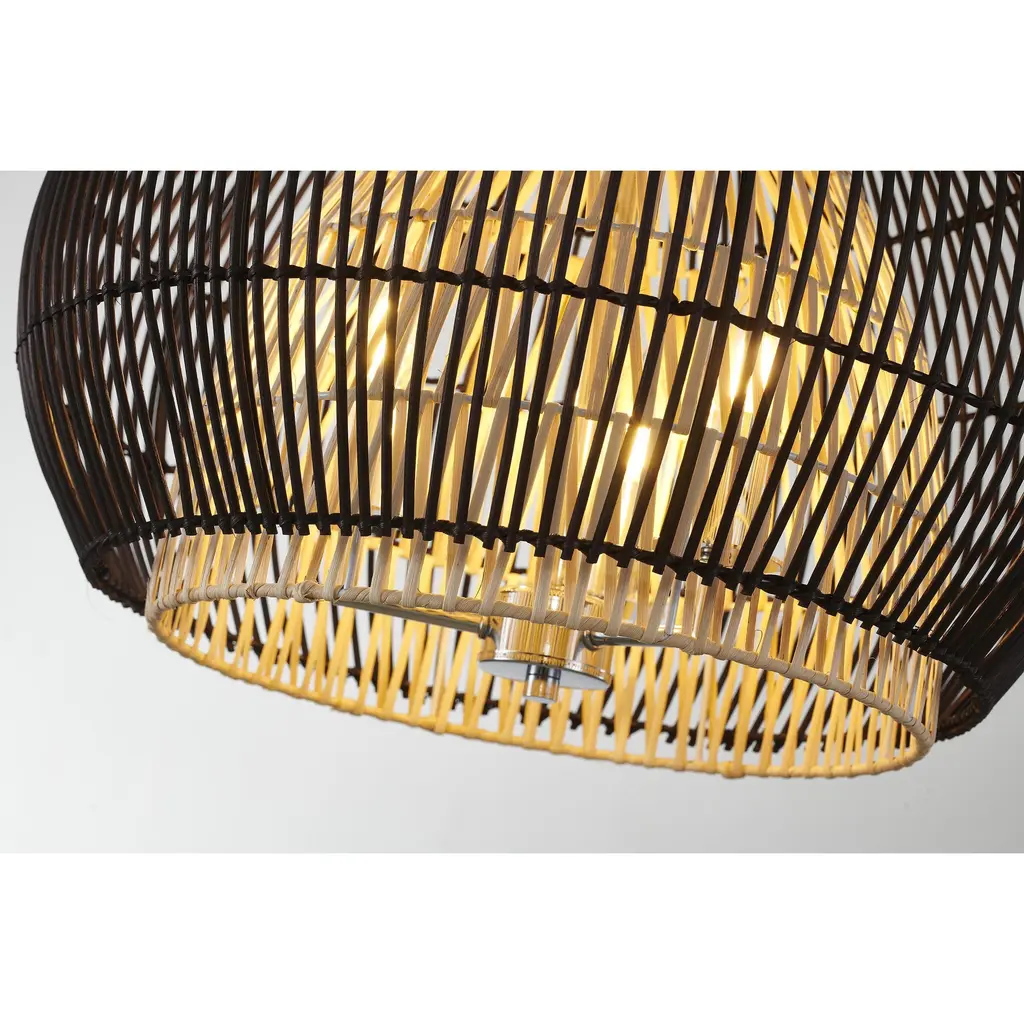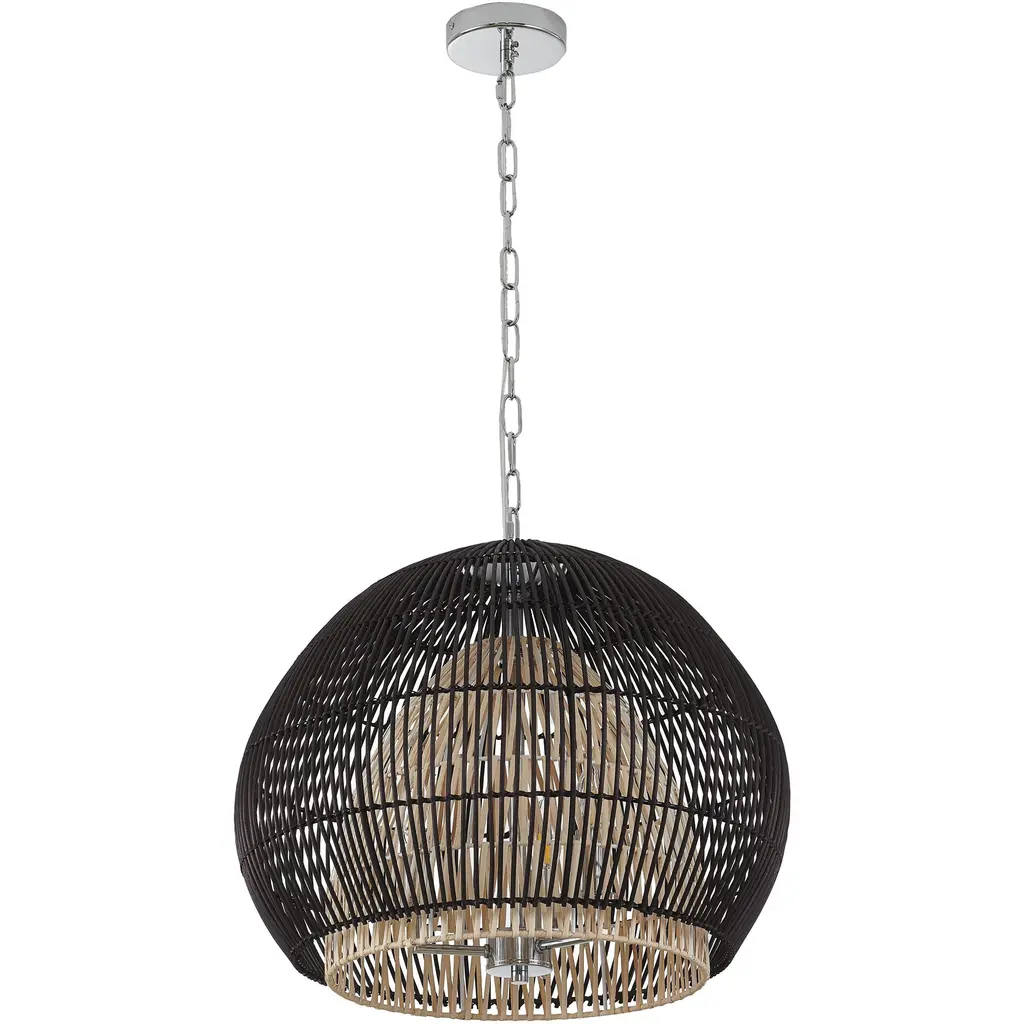 This eclectic and global chandelier is a unique and stylish lighting fixture that adds a touch of rustic charm to any room. Measuring 20 inches in diameter and 16 inches in height, this chandelier is designed to provide a warm and inviting glow. The outer black and natural wood vine shade provides a natural and earthy look, while the chrome frame adds a touch of modernity and sophistication. With 3xE12 sockets and 60W bulbs (Bulbs Not Included), this fixture produces a bright and energizing light that is perfect for task lighting or ambient illumination. This pendant light is perfect for installing in a living room, bedroom, hallway, entryway, or dinning room, and is sure to be a showstopper in any setting.