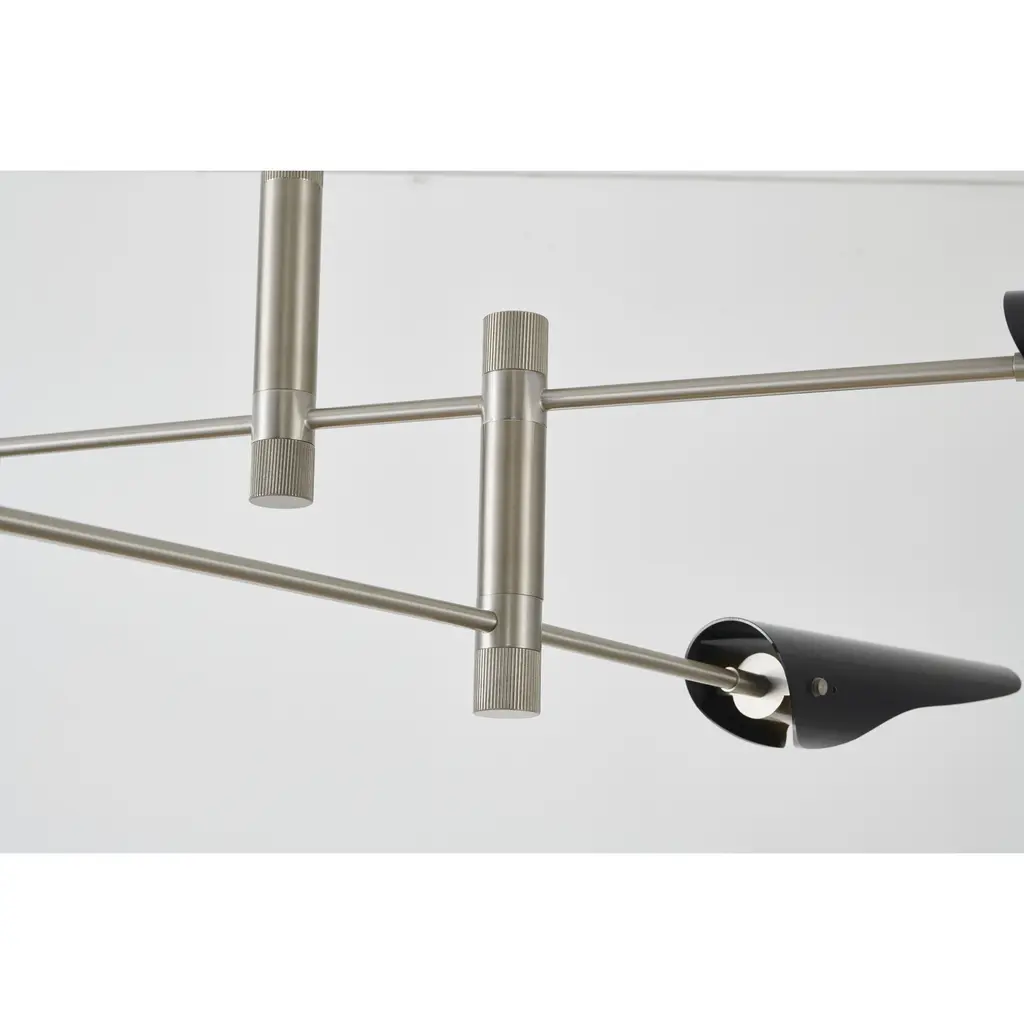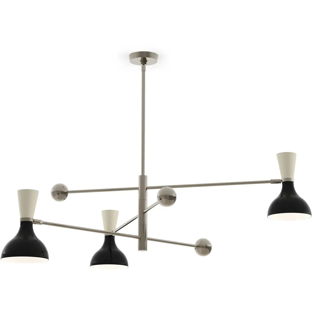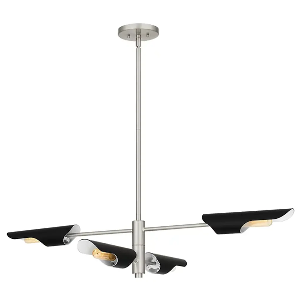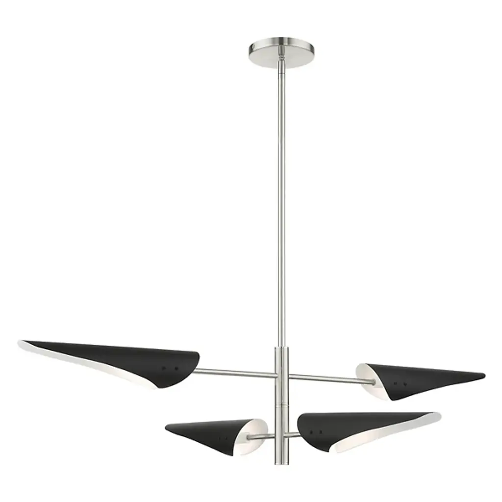 This chandelier is in a shiny nickel finish. It comes with black shades. The rod length of 16" + 16" + 12" + 6" is provided and the rod is adjustable.
