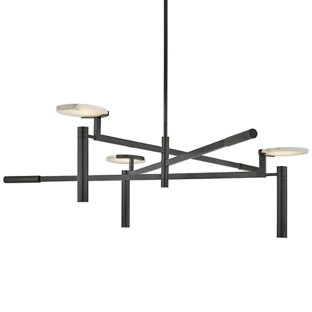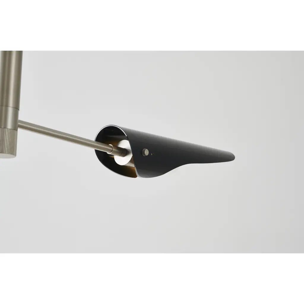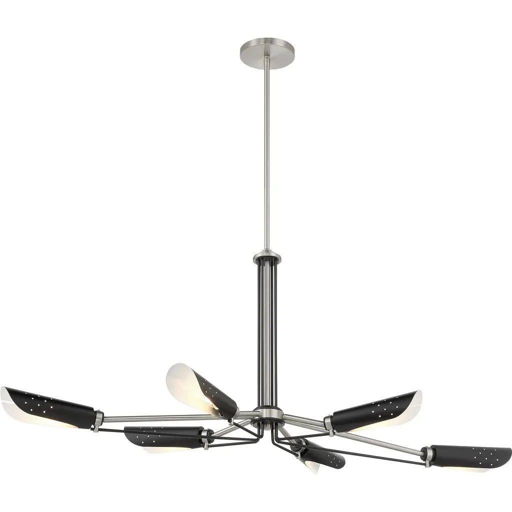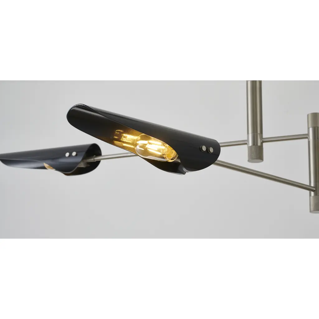 This chandelier is in a shiny nickel finish. It comes with black shades. The rod length of 16" + 16" + 12" + 6" is provided and the rod is adjustable.