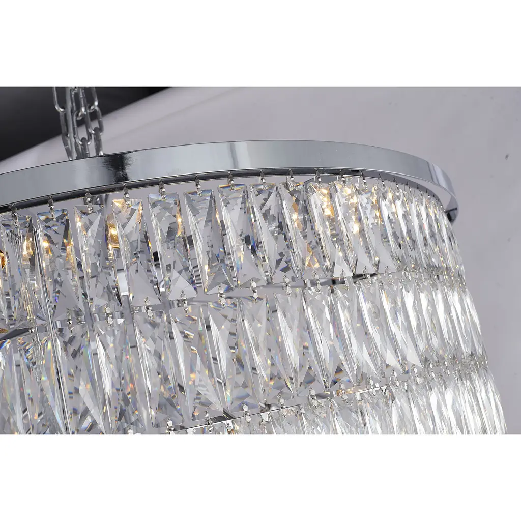 This chandelier is stunning with a chrome iron frame decked with strands of faceted clear crystals, and the crystals further highlight the uniqueness of this chandelier. When you hang this modern crystals chandelier in a room, you will easily be surprised by the magnificent light reflected by the crystals. This fixture showcase opulence and elegance and is the perfect modern accent to any space. If you are also looking for a light source for your living room, foyer, staircase, or dinning room. The adjustable chain link makes this fixture suitable for most ceiling heights.