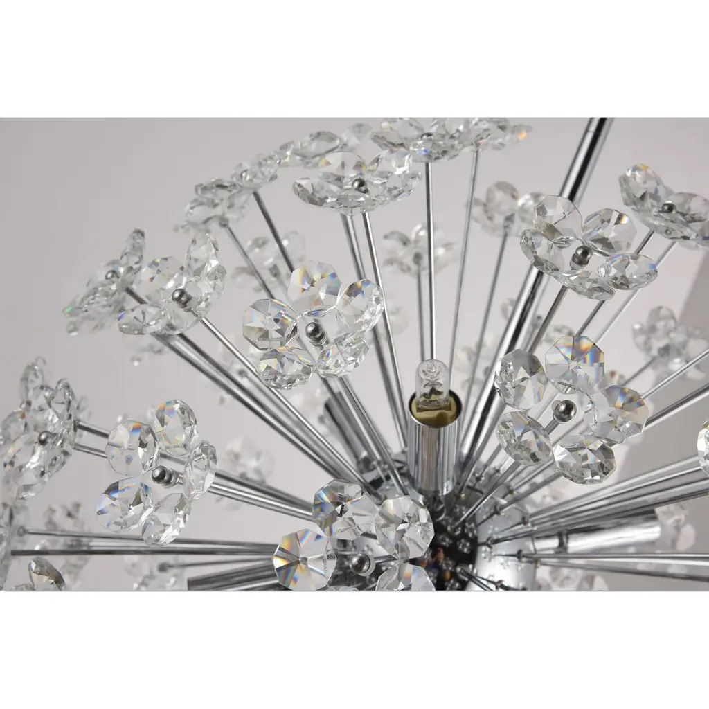 This transitional chandelier light is a stunning addition to any room, featuring a delicate and intricate design that adds a touch of elegance and sophistication. The clear crystal flower ball is suspended from a chrome frame, providing a beautiful contrast of textures and colors. The light is designed to accommodate 6xE12 bulbs (Bulbs Not Included), each with a maximum wattage of 40W, allowing you to customize the light output to your preferences. Measuring 15.75 inches in diameter, this chandelier light is perfect for hanging in a grand foyer, bedroom, dining room, or living room.