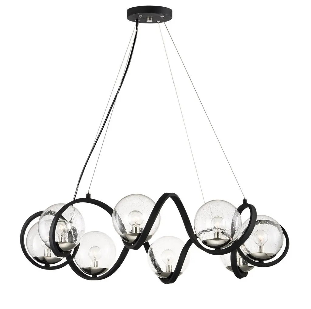 This exquisite ceiling fixture is in a black finish. The frame is made out of metal, and it comes with six glass globe shades in clear color. The adjustable rod link makes this fixture suitable for most ceiling height.