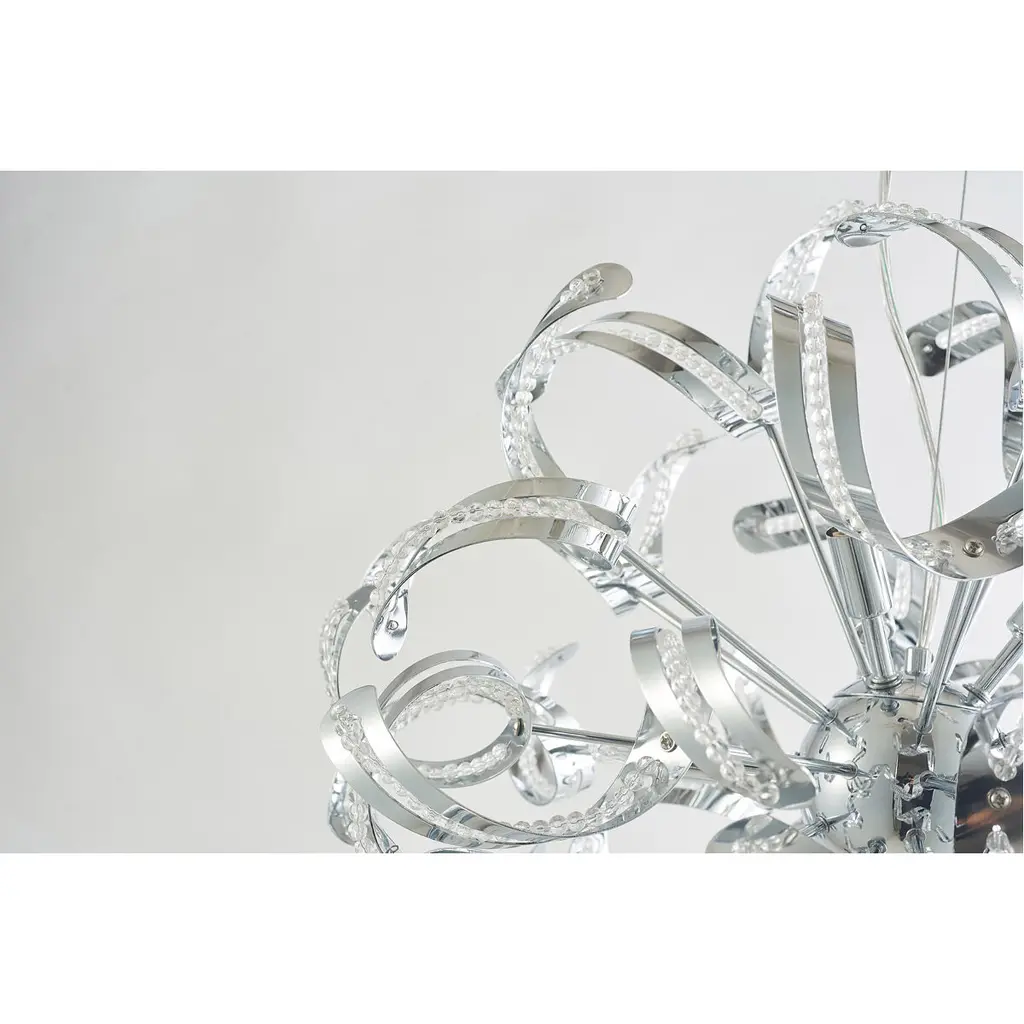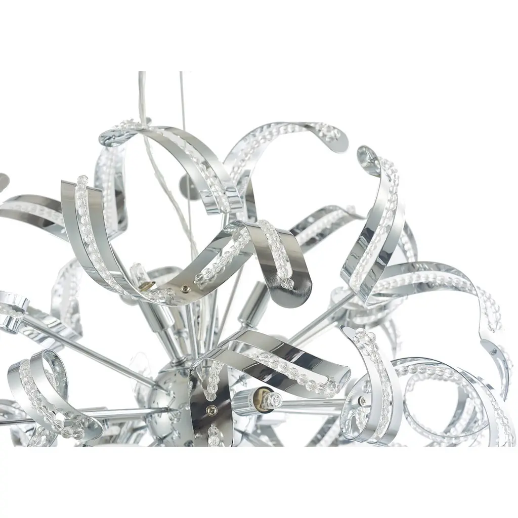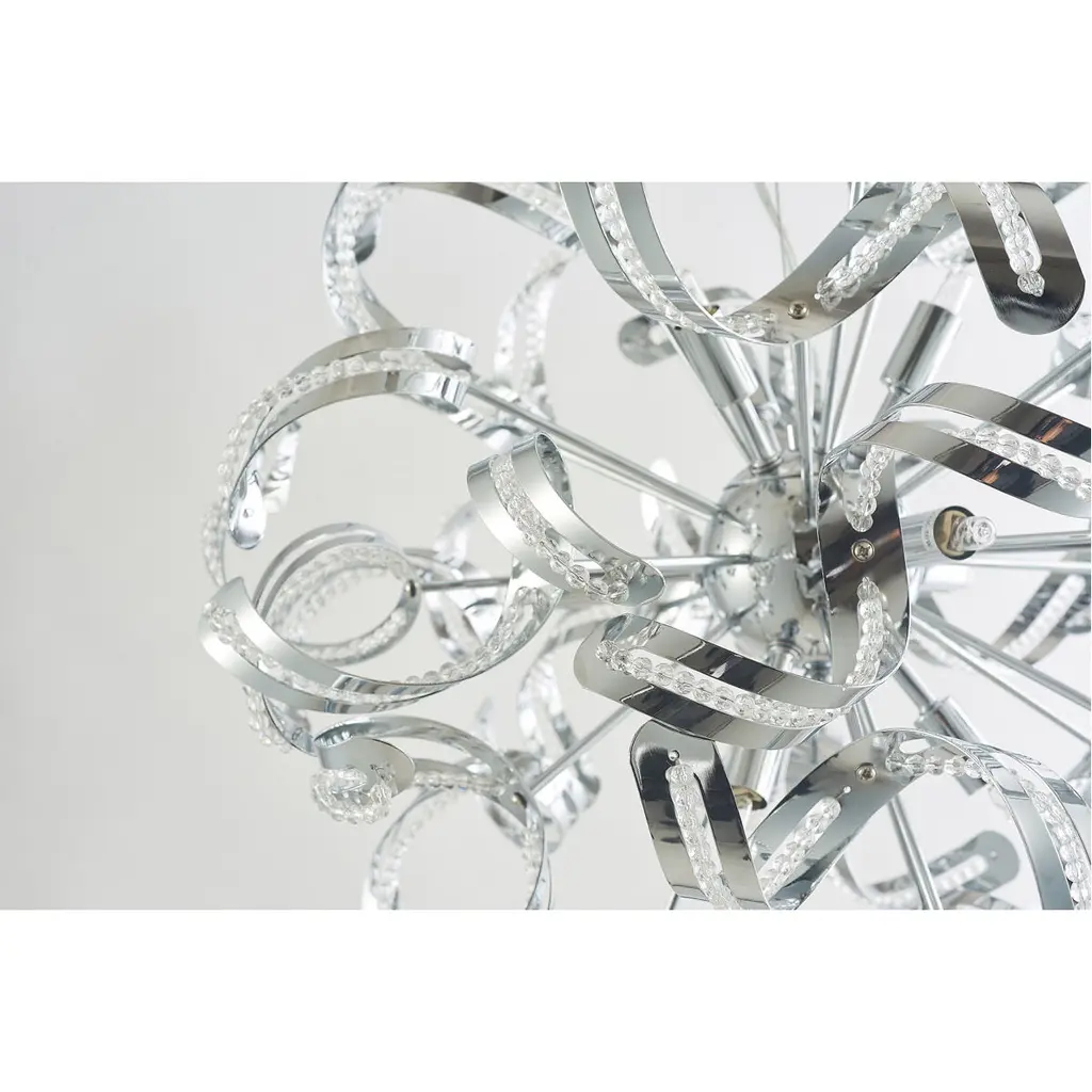 This exquisite chandelier is in a chrome finish. The frame is made out of metal, and it comes with clear crystal beaded swirls. The adjustable cord link makes fixture suitable for most ceiling heights.